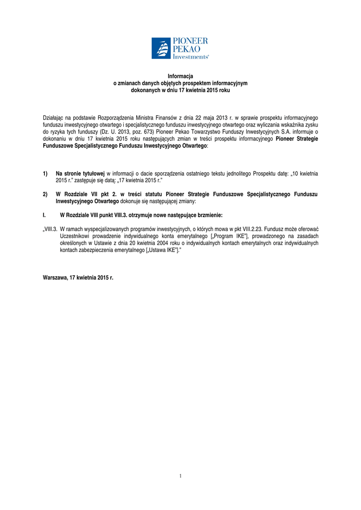 Informacja o zmianach danych objętych prospektem informacyjnym dokonanych w dniu 17 kwietnia 2015 roku Działając na podstawie Rozporządzenia Ministra Finansów z dnia 22 maja 2013 r. w sprawie prospektu informacyjnego funduszu inwestycyjnego otwartego i specjalistycznego funduszu inwestycyjnego otwartego oraz wyliczania wskaźnika zysku do ryzyka tych funduszy (Dz. U. 2013, poz. 673) Pioneer Pekao Towarzystwo Funduszy Inwestycyjnych S.A. informuje o dokonaniu w dniu 17 kwietnia 2015 roku następujących zmian w treści prospektu informacyjnego Pioneer Strategie Funduszowe Specjalistycznego Funduszu Inwestycyjnego Otwartego: 1) Na stronie tytułowej w informacji o dacie sporządzenia ostatniego tekstu jednolitego Prospektu datę: „10 kwietnia 2015 r.” zastępuje się datą: „17 kwietnia 2015 r.” 2) W Rozdziale VII pkt 2. w treści statutu Pioneer Strategie Funduszowe Specjalistycznego Funduszu Inwestycyjnego Otwartego dokonuje się następującej zmiany: I. W Rozdziale VIII punkt VIII.3. otrzymuje nowe następujące brzmienie: „VIII.3. W ramach wyspecjalizowanych programów inwestycyjnych, o których mowa w pkt VIII.2.23. Fundusz moŜe oferować Uczestnikowi prowadzenie indywidualnego konta emerytalnego [„Program IKE”], prowadzonego na zasadach określonych w Ustawie z dnia 20 kwietnia 2004 roku o indywidualnych kontach emerytalnych oraz indywidualnych kontach zabezpieczenia emerytalnego [„Ustawa IKE”].” Warszawa, 17 kwietnia 2015 r. 1