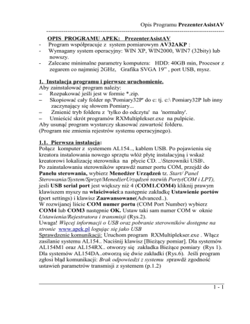 Opis Programu PrezenterAsistAV -------------------------------------------------------------------------------------------OPIS PROGRAMU APEK: PrezenterAsistAV - Program współpracuje z system pomiarowym AV32AKP : - Wymagany system operacyjny: WIN XP, WIN2000, WIN7 (32bity) lub nowszy. - Zalecane minimalne parametry komputera: HDD: 40GB min, Procesor z zegarem co najmniej 2GHz, Grafika SVGA 19” , port USB, mysz. 1. Instalacja programu i pierwsze uruchomienie. Aby zainstalować program należy: – Rozpakować jeśli jest w formie *.zip. – Skopiować cały folder np.'Pomiary32P' do c: tj. c:\ Pomiary32P lub inny zaczynający się słowem Pomiary... – Zmienić tryb folderu z 'tylko do odczytu' na 'normalny'. – Umieścić skrót programów RXMultiplekser.exe na pulpicie. Aby usunąć program wystarczy skasować zawartość folderu. (Program nie zmienia rejestrów systemu operacyjnego). 1.1. Pierwsza instalacja: Połącz komputer z systemem AL154.., kablem USB. Po pojawieniu się kreatora instalowania nowego sprzętu włóż płytę instalacyjną i wskaż kreatorowi lokalizację sterownika na płycie CD. ..\Sterowniki USB\. Po zainstalowaniu sterowników sprawdź numer portu COM, przejdź do Panelu sterowania, wybierz Menedżer Urządzeń tz. Start/ Panel Sterowania/System/Sprzęt/MenedżerUrządzeń rozwiń Porty(COM i LPT), jesli USB serial port jest większy niż 4 (COM1.COM4) kliknij prawym klawiszem myszy na właściwości:a następnie zakładkę Ustawienie portów (port settings) i klawisz Zaawansowane(Advanced..). W rozwijanej liście COM numer portu (COM Port Number) wybierz COM4 lub COM3 następnie OK. Ustaw taki sam numer COM w oknie Ustawienia/Rejestratora i transmisji (Rys.2). Uwaga! Więcej informacji o USB oraz pobranie sterowników dostępne na stronie www.apek.pl logując się jako USB Sprawdzenie komunikacji: Uruchom program RXMultiplekser.exe . Włącz zasilanie systemu AL154.. Naciśnij klawisz [Bieżący pomiar]. Dla systemów AL154M1 oraz AL154RX.. otworzy się zakładka Bieżące pomiary (Rys 1). Dla systemów AL154DA..otworzą się dwie zakładki (Rys.6). Jeśli program zgłosi błąd komunikacji: Brak odpowiedzi z systemu sprawdź zgodność ustawień parametrów transmisji z systemem (p.1.2) 1-1 Opis Programu PrezenterAsistAV -------------------------------------------------------------------------------------------2. Konfiguracja systemu AV32AKP \ zakładka Settings. Konfiguracja systemu AV32AKP obejmuje przyporządkowanie kanału programu komputerowego k do numeru wejścia systemu W oraz do konkretnego czujnika (Rys.1). Pliki pomiarowe Zamknięcie programu Przyporządkowanie np. kanał k2 – wejście W2 Edycja wykresu Rodzaj i numer fabryczny czujnika Pole wykresu Numer wejścia W2. Rys. 1 Widok Okna konfigurującego \ zakładka Setitngs \ dla systemu AV32AKP. 1-2 Opis Programu PrezenterAsistAV -------------------------------------------------------------------------------------------Korzystając z zakładki Settings (Rys.2) można ustalić konfigurację systemu tzn. określić ilość mierzonych kanałów, utworzyć nową konfigurację , zapisać ją do pliku lub odczytać już istniejącą z pliku konfigurującego. Można też odczytać parametry danego czujnika w okienku Properties, zakładka Sensor . Ilość kanałów Odczyt/Zapis konfiguracji Start/Stop edycji konfiguracji. Parametry czujnika Rys.2. Zakładka parametrów czujników dla Okna konfigurującego. Przykład tworzenia nowej konfiguracji takiej jak na Rys.1: a. Kliknięciem wybrać Start edycji konfiguracji (Enable to change settings). b. Usunąć starą konfigurację klawiszem New settings. c. Suwakiem wybrać ilość kanałów ( np.2.) d. Z zakładki Properties/Inputs wybrać kliknięciem numer wejścia systemu AV32AKP, na które włączony będzie akcelerometr; ( np.17). e. Z okienka File Sensors wybrać kliknięciem konkretny czujnik 1-3 Opis Programu PrezenterAsistAV -------------------------------------------------------------------------------------------(np.MA2401No628.s001). W Properties/Sensors można odczytać jego parametry. f. Kliknięciem wybrać drugi wiersz (po k2). g. Z zakładki Properties/Inputs wybrać kliknięciem numer wejścia systemu AV32AKP, na które włączony będzie czujnik przesunięcia(np.2). h. Z okienka File Sensors wybrać kliknięciem konkretny czujnik (np.TS17436_02.s001). W Properties/Sensors można odczytać jego parametry. UWAGA! Akcelerometry można podłączyć na wejścia: W17 – W28 : 12 akcelerometrów jednoosiowych - przewodami 3-żyłowymi (matowymi) o oznaczeniu: 3x0,34mm2 lub W23-W28 : 6 akcelerometrów dwuosiowych – przewodami 4-żyłowymi (błyszczącymi) o oznaczeniu: 4x0,34mm2. Akcelerometry dwuosiowe należy podłączać zaczynając od wejścia W28, pamiętając, że każdy akcelerometr dwuosiowy zajmuje dwa kanały pomiarowe i dlatego wyłącza z użytkowania sprzężone z nim wejście jednoosiowe: akcelerometr dwuosiowy na W28 akcelerometr dwuosiowy na W27 akcelerometr dwuosiowy na W26 akcelerometr dwuosiowy na W25 akcelerometr dwuosiowy na W24 akcelerometr dwuosiowy na W23 zabrania użytkowania zabrania użytkowania zabrania użytkowania zabrania użytkowania zabrania użytkowania zabrania użytkowania W22; W21; W20; W19; W18; W17; Wszystkie akcelerometry typ MA24... firmy APEK posiadają czujki dwuosiowe. Tak więc to, czy akcelerometr wykorzystywany będzie jako jedno czy dwuosiowy zależy od kabla przyłączeniowego. 1-4 Opis Programu PrezenterAsistAV -------------------------------------------------------------------------------------------3. Pomiary systemem AV32AKP \ zakładka START. Po przesłaniu konfiguracji do systemu AV32AKP (klawisz Connected) można wcisnąć klawisz START tzn. rozpocząć rejestrację bieżących pomiarów na wykresie (patrz Rys.3 - wybór kanałów patrz Rys.4) oraz zapis do pliku o nazwie zapisanej w okienku File name. START/STOP pomiaru Nazwa pliku Przesłanie konfiguracji do systemu Włącz/wyłącz 