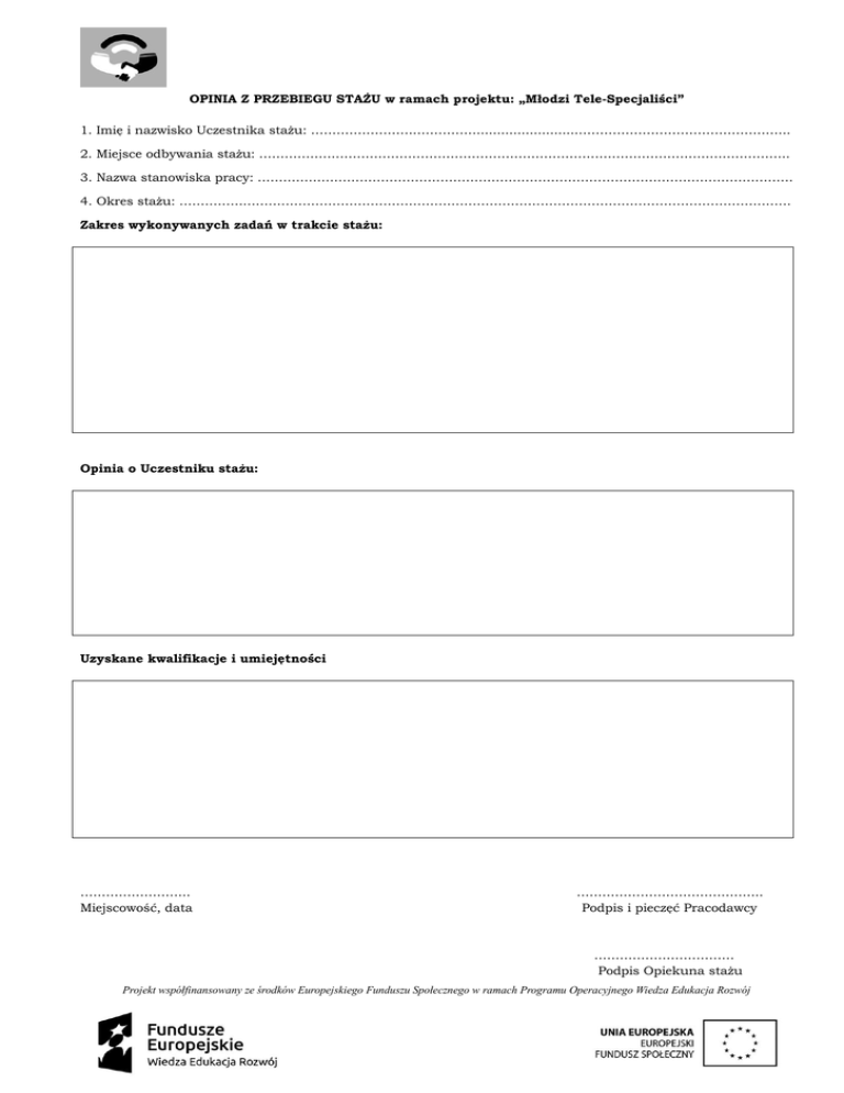 OPINIA Z PRZEBIEGU STAŻU w ramach projektu: „Młodzi Tele-Specjaliści” 1. Imię i nazwisko Uczestnika stażu: ………………………………….........................………………………………………….. 2. Miejsce odbywania stażu: …………………………………………………………………………………………………………….. 3. Nazwa stanowiska pracy: ……………………………………………………………………………………………………………… 4. Okres stażu: ……………………………………………………………………………………………………………………………… Zakres wykonywanych zadań w trakcie stażu: Opinia o Uczestniku stażu: Uzyskane kwalifikacje i umiejętności …………………….. Miejscowość, data …………………………………….. Podpis i pieczęć Pracodawcy …………………………… Podpis Opiekuna stażu Projekt współfinansowany ze środków Europejskiego Funduszu Społecznego w ramach Programu Operacyjnego Wiedza Edukacja Rozwój Sprawozdanie Uczestnika stażu w ramach projektu: „Młodzi Tele-Specjaliści” 1. Imię i nazwisko Uczestnika: ………………………………………………………………………………………………………….. 2. Miejsce odbywania stażu: …………………………………………………………………………………………………………….. 3. Nazwa stanowiska pracy: ……………………………………………………………………………………………………………… 4 Okres stażu: ………………………………………………………………………………………………………………………………. Zakres wykonywanych zadań: Opinia Uczestnika Projektu: Uzyskane kwalifikacje i umiejętności …………………….. Miejscowość, data …………………………………….. Podpis Uczestnika stażu Projekt współfinansowany ze środków Europejskiego Funduszu Społecznego w ramach Programu Operacyjnego Wiedza Edukacja Rozwój