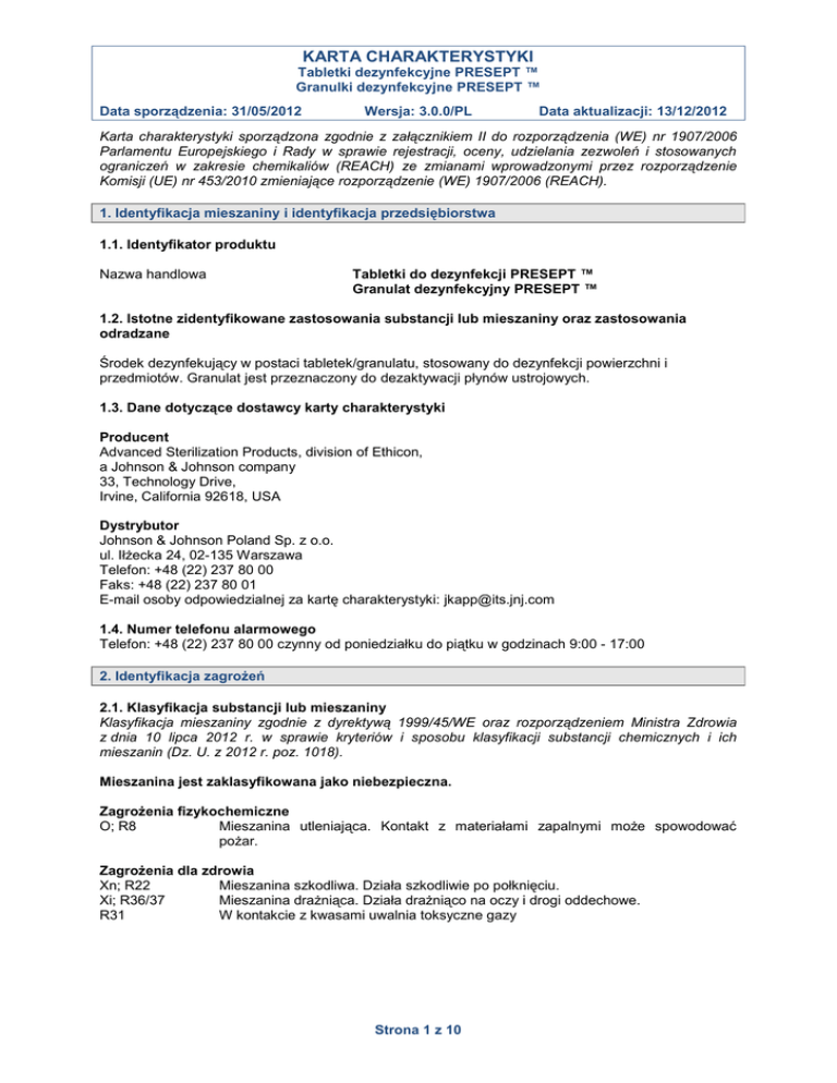 KARTA CHARAKTERYSTYKI Tabletki dezynfekcyjne PRESEPT ™ Granulki dezynfekcyjne PRESEPT ™ Data sporządzenia: 31/05/2012 Wersja: 3.0.0/PL Data aktualizacji: 13/12/2012 Karta charakterystyki sporządzona zgodnie z załącznikiem II do rozporządzenia (WE) nr 1907/2006 Parlamentu Europejskiego i Rady w sprawie rejestracji, oceny, udzielania zezwoleń i stosowanych ograniczeń w zakresie chemikaliów (REACH) ze zmianami wprowadzonymi przez rozporządzenie Komisji (UE) nr 453/2010 zmieniające rozporządzenie (WE) 1907/2006 (REACH). 1. Identyfikacja mieszaniny i identyfikacja przedsiębiorstwa 1.1. Identyfikator produktu Nazwa handlowa Tabletki do dezynfekcji PRESEPT ™ Granulat dezynfekcyjny PRESEPT ™ 1.2. Istotne zidentyfikowane zastosowania substancji lub mieszaniny oraz zastosowania odradzane Środek dezynfekujący w postaci tabletek/granulatu, stosowany do dezynfekcji powierzchni i przedmiotów. Granulat jest przeznaczony do dezaktywacji płynów ustrojowych. 1.3. Dane dotyczące dostawcy karty charakterystyki Producent Advanced Sterilization Products, division of Ethicon, a Johnson & Johnson company 33, Technology Drive, Irvine, California 92618, USA Dystrybutor Johnson & Johnson Poland Sp. z o.o. ul. Iłżecka 24, 02-135 Warszawa Telefon: +48 (22) 237 80 00 Faks: +48 (22) 237 80 01 E-mail osoby odpowiedzialnej za kartę charakterystyki: [email protected] 1.4. Numer telefonu alarmowego Telefon: +48 (22) 237 80 00 czynny od poniedziałku do piątku w godzinach 9:00 - 17:00 2. Identyfikacja zagrożeń 2.1. Klasyfikacja substancji lub mieszaniny Klasyfikacja mieszaniny zgodnie z dyrektywą 1999/45/WE oraz rozporządzeniem Ministra Zdrowia z dnia 10 lipca 2012 r. w sprawie kryteriów i sposobu klasyfikacji substancji chemicznych i ich mieszanin (Dz. U. z 2012 r. poz. 1018). Mieszanina jest zaklasyfikowana jako niebezpieczna. Zagrożenia fizykochemiczne O; R8 Mieszanina utleniająca. Kontakt z materiałami zapalnymi może spowodować pożar. Zagrożenia dla zdrowia Xn; R22 Mieszanina szkodliwa. Działa szkodliwie po połknięciu. Xi; R36/37 Mieszanina drażniąca. Działa drażniąco na oczy i drogi oddechowe. R31 W kontakcie z kwasami uwalnia toksyczne gazy Strona 1 z 10 KARTA CHARAKTERYSTYKI Tabletki dezynfekcyjne PRESEPT ™ Granulki dezynfekcyjne PRESEPT ™ Data sporządzenia: 31/05/2012 Wersja: 3.0.0/PL Data aktualizacji: 13/12/2012 Zagrożenia dla środowiska N; R50/53 Mieszanina niebezpieczna dla środowiska. Działa bardzo toksycznie na organizmy wodne. Może powodować długo utrzymujące się niekorzystne zmiany w środowisku wodnym. 2.2. Elementy oznakowania Oznakowanie mieszaniny zgodnie z dyrektywą 1999/45/WE oraz rozporządzeniem Ministra Zdrowia z dnia 12 kwietnia 2012 r. w sprawie oznakowania opakowań substancji niebezpiecznych i mieszanin niebezpiecznych oraz niektórych mieszanin (Dz. U. z 2012 r. poz. 445). Zawiera troklozen sodowy. Symbole i znaki ostrzegawcze O Xn N Produkt utleniający Produkt szkodliwy Produkt niebezpieczny dla środowiska Zwroty wskazujące rodzaj zagrożenia R8 Kontakt z materiałami zapalnymi może spowodować pożar. R22 Działa szkodliwie po połknięciu. R36/37 Działa drażniąco na oczy i drogi oddechowe. R31 W kontakcie z kwasami uwalnia toksyczne gazy. R50/53 Działa bardzo toksycznie na organizmy wodne; może powodować długo utrzymujące się niekorzystne zmiany w środowisku wodnym. Zwroty określające warunki bezpiecznego stosowania S2 Chronić przed dziećmi. S7/8 Przechowywać pojemnik szczelnie zamknięty w suchym pomieszczeniu. S24/25 Unikać zanieczyszczenia skóry i oczu. S26 Zanieczyszczone oczy przemyć natychmiast dużą ilością wody i zasięgnąć porady lekarza. S41 Nie wdychać dymów powstających w wyniku pożaru lub wybuchu. S61 Unikać zrzutów do środowiska. Postępować zgodnie z instrukcją lub kartą charakterystyki. 2.3. Inne zagrożenia Ocena właściwości PBT i vPvB Mieszanina nie spełnia kryteriów klasyfikacji PBT i vPvB. 3. Skład/informacja o składnikach 3.2. Mieszaniny Opis mieszaniny Mieszanina jest roztworem wodnym o odczynie zasadowym. Zawiera aminy oraz dodatek środków nawilżających i wypełniaczy. Strona 2 z 10 KARTA CHARAKTERYSTYKI Tabletki dezynfekcyjne PRESEPT ™ Granulki dezynfekcyjne PRESEPT ™ Data sporządzenia: 31/05/2012 Wersja: 3.0.0/PL Data aktualizacji: 13/12/2012 Klasyfikacja składników mieszaniny zgodnie z dyrektywą 67/548/EWG. Stężenie [% wag.] Identyfikacja substancji Klasyfikacja 50,0 Sól sodowa kwasu dichloroizocyjanurowego; troklozen sodowy Numer WE: 220-767-7 Numer CAS: 2893-78-9 Numer indeksowy: 613-030-00-X 22,5 E; R2 O; R8 Xn; R22 Xi; R36/37 R31 N; R50/53 Kwas adypinowy Numer WE 204-673-3 Numer CAS 124-04-9 Numer indeksowy 607-144-00-9 Xi; R36 Pełne brzmienie symboli i zwrotów wskazujących rodzaj zagrożenia zamieszczono w sekcji 16. karty charakterystyki. 4. Środki pierwszej pomocy 4.1. Opis środków pierwszej pomocy Narażenie oddechowe Wyprowadzić poszkodowaną osobę ze strefy narażenia. Zapewnić dostęp świeżego powietrza. W przypadku trudności z oddychaniem podać poszkodowanemu tlen. Kontakt ze skórą Przemyć natychmiast skórę dużą ilością wody z mydłem. Zasięgnąć porady lekarza w przypadku utrzymywania się objawów podrażnienia. Kontakt z oczami Rozchylić powieki i przemyć dokładnie oczy dużą ilością wody, przez co najmniej 15 minut. Zasięgnąć porady lekarza. W przypadku spożycia Zasięgnąć natychmiast porady lekarza. Dokładnie przepłukać usta wodą. Popić obficie wodą. Nie powodować wymiotów. Nigdy nie podawać niczego doustnie osobie nieprzytomnej. 4.2. Najważniejsze ostre i opóźnione objawy oraz skutki narażenia Brak danych. 4.3. Wskazania dotyczące wszelkiej natychmiastowej pomocy lekarskiej i szczególnego postępowania z poszkodowanym Stosować leczenie objawowe. W przypadku narażenia i wystąpienia objawów natychmiast zasięgnąć porady lekarza. Zdjąć natychmiast zanieczyszczoną odzie