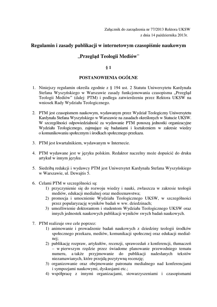 Załącznik do zarządzenia nr 77/2013 Rektora UKSW z dnia 14 października 2013r. Regulamin i zasady publikacji w internetowym czasopiśmie naukowym „Przegląd Teologii Mediów” §1 POSTANOWIENIA OGÓLNE 1. Niniejszy regulamin określa zgodnie z § 194 ust. 2 Statutu Uniwersytetu Kardynała Stefana Wyszyńskiego w Warszawie zasady funkcjonowania czasopisma „Przegląd Teologii Mediów” (dalej: PTM) i podlega zatwierdzeniu przez Rektora UKSW na wniosek Rady Wydziału Teologicznego. 2. PTM jest czasopismem naukowym, wydawanym przez Wydział Teologiczny Uniwersytetu Kardynała Stefana Wyszyńskiego w Warszawie na zasadach określonych w Statucie UKSW. W szczególności odpowiedzialność za wydawanie PTM ponoszą jednostki organizacyjne Wydziału Teologicznego, zajmujące się badaniami i kształceniem w zakresie wiedzy o komunikowaniu społecznym i środkach społecznego przekazu. 3. PTM jest kwartalnikiem, wydawanym w Internecie. 4. PTM wydawane jest w języku polskim. Redaktor naczelny może dopuścić do druku artykuł w innym języku. 5. Siedzibą redakcji i wydawcy PTM jest Uniwersytet Kardynała Stefana Wyszyńskiego w Warszawie, ul. Dewajtis 5. 6. Celami PTM w szczególności są: 1) przyczynienie się do rozwoju wiedzy i nauki, zwłaszcza w zakresie teologii mediów, edukacji medialnej oraz medioznawstwa; 2) promocja i umocnienie Wydziału Teologicznego UKSW, w szczególności przez popularyzację wyników badań w ww. dziedzinach; 3) umożliwienie doktorantom i studentom Wydziału Teologicznego UKSW oraz innych jednostek naukowych publikacji wyników swych badań naukowych. 7. PTM realizuje swe cele poprzez: 1) animowanie i prowadzenie badań naukowych z dziedziny teologii środków społecznego przekazu, mediów, komunikacji społecznej oraz edukacji medialnej; 2) publikację rozpraw, artykułów, recenzji, sprawozdań z konferencji, tłumaczeń – w pierwszym rzędzie przez świadome planowanie przewodniego tematu numeru, a także przyjmowanie do publikacji nadesłanych tekstów niezamawianych, które przejdą pozytywną recenzję; 3) organizowanie oraz obejmowanie patronatu medialnego nad konferencjami i sympozjami naukowymi, dyskusjami etc.; 4) współpracę z innymi organizacjami, stowarzyszeniami i czasopismami naukowymi, w szczególności tymi, które zajmują się dziedziną mediów i teologii; 5) pozyskiwanie środków finansowych (granty, stypendia etc.) na prowadzenie badań naukowych. §2 REDAKCJA, RADA NAUKOWA, RECENZENCI 1. W skład redakcji PTM wchodzą: redaktor naczelny, zastępca redaktora naczelnego, sekretarz (lub sekretarze) redakcji i pozostali członkowie redakcji, w liczbie niezbędnej do prawidłowego funkcjonowania pisma. 2. Udział w tworzeniu PTM, a w szczególności członkostwo w redakcji lub Radzie Naukowej, traktowany jest jako część badań naukowych i jako taki nie musi podlegać dodatkowemu honorarium. Nie wyklucza to jednak możliwości ubiegania się o granty, stypendia lub inne formy dofinansowania badań naukowych. 3. Do zadań redakcji należy w szczególności: 1) czuwanie nad właściwym poziomem artykułów; 2) czuwanie nad terminowym ukazywaniem się czasopisma; 3) utrzymywanie kontaktu z autorami, recenzentami i członkami Rady Naukowej; 4) korekta i redakcja nadesłanych artykułów; 5) skład artykułów i zamieszczanie ich na stronie www; 6) archiwizacja artykułów, recenzji i wydań PTM; 7) pozyskiwanie środków finansowych na funkcjonowanie PTM. 4. Pracą redakcji kieruje i odpowiada za nią redaktor naczelny. Do jego zadań należy w szczególności: 1) czuwanie nad poziomem merytorycznym, redakcyjnym, edytorskim artykułów oraz zgodności ich tematyki z zakresem czasopisma; 2) czuwanie nad tym, by wszystkie publikacje w PTM były recenzowane; 3) wyznaczanie recenzentów i kontakty z recenzentami; 4) czuwanie nad przestrzeganiem przepisów prawa, w szczególności prawa autorskiego i prasowego, w działalności redakcji; 5) reprezentowanie redakcji PTM na Radzie Wydziału oraz zawsze, gdy zajdzie taka potrzeba; 6) wspólnie z zastępcą redaktora naczelnego planowanie budżetu PTM. 5. Redaktor naczelny ma zastępcę, na którego może cedować swe uprawnienia i obowiązki w sytuacji swej nieobecności lub niemożności ich pełnienia. Oprócz tego do obowiązków zastępcy redaktora naczelnego należy w szczególności: 1) troska o promocję PTM i podejmowanie stosownych działań w tym kierunku; 2) koordynowanie patronatów medialnych, obejmowanych przez PTM; 3) koordynowanie współpracy z innymi czasopismami, organizacjami i stowarzyszeniami naukowymi; 4) pozyskiwanie zewnętrznego finansowania działalności PTM. 6. Do obowiązków sekretarza redakcji należy w szczególności: 1) prowadzenie korespondencji czasopisma; 2) korekta i redakcja tekstów lub jej zlecanie kompetentnym osobom; 3) pilnowanie terminów sporządzania recenzji, korekty autorskiej, ukazywania się czasopisma; 4) koordynowanie bieżących spraw redakcji, niezastrzeżonych wyłącznie redaktorowi naczelnemu; 5) archiwizacja artykułów, recenzji i wydań czasopisma. 7. Decyzją redaktora naczelnego, niektóre z obowiązków i uprawnień redaktora naczelnego, zastępcy redaktora naczelnego lub sekretarza redakcji mogą być czasowo lub na stałe imiennie przypisane innym członkom redakcji. 8. Zgodnie z par. 194 ust. 1 Statutu UKSW redaktora naczelnego, zastępcę redaktora naczelnego i sekretarzy redakcji, a także członków redakcji i Rady Naukowej czasopisma PTM powołuje na czas nieokreślony i odwołuje Rada Wydziału Teologicznego UKSW. 9. Zgodnie z art. 25 ust. 7 ustawy prawo prasowe (Dz.U. 1984 nr 5 poz. 24, z późn. zmianami), przy redakcji działa Rada Naukowa czasopisma PTM, będąca organem opiniodawczo-doradczym redaktora naczelnego. Do zadań Rady Naukowej i jej członków należy w szczególności: 1) czuwanie nad poziomem naukowym czasopisma; 2) wyznaczanie w porozumieniu z redakcją kierunków badań podejmowanych przez pismo