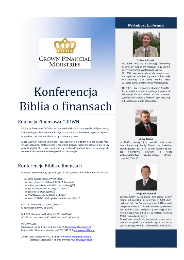 1 Wykładowcy konferencji: Konferencja Biblia o finansach Elżbieta Wrotek Od 2008 związana z Edukacją Finansową Crown, jest członkiem krajowej Rady Crown i certyfikowanym wykładowcą Crown. W 1988 roku ukończyła studia magisterskie na Wydziale Inżynierii Lądowej Politechniki Warszawskiej, a w 1996 studia MBA w szkole Biznesu Politechniki Warszawskiej. Od 1981 roku związana z Ruchem ŚwiatłoŻycie, między innymi organizuje i prowadzi rekolekcje dla małżeństw, w tym na temat „Jedność małżeńska a finanse”. Jest mężatką od 1988 roku, matką bliźniaków. Edukacja Finansowa CROWN Edukacja Finansowa CROWN Jest chrześcijańską opartą o zasady biblijne służbą, której wizją jest kształcenie w każdym narodzie naśladowców Chrystusa, żyjących w zgodzie z Bożymi zasadami zarządzania majątkiem. Misją „Crown Financial Ministries” jest zapewnienie ludziom z całego świata możliwości poznania, zastosowania i nauczania Bożych zasad finansowych po to, by poznali głębiej Chrystusa, mieli większą możliwość służenia Mu, i by pomogli sfinansować wypełnienie Wielkiego Nakazu Misyjnego. Artur Kalicki ur. 1969 r., żonaty, ojciec czwórki dzieci, absolwent Prywatnej Szkoły Biznesu w Krakowie, przedsiębiorca od 18 lat, zaangażowany Edukację Finansową CROWN, a także w Duszpasterstwo Przedsiębiorców i Pracodawców „Talent”. Konferencja Biblia o finansach Dowiesz się co to znaczy być wiernym chrześcijaninem w dziedzinie finansów czyli: Co Pismo Święte mówi o WŁASNOŚCI? Jak tworzyć plan wydatków i BUDŻET domowy? Jak unikać popadania w DŁUGI i jak z nich wyjść? Jak być ZADOWOLONYM z tego co się ma? Jak nauczyć się OSZCZĘDZAĆ? Jak PRACOWAĆ, aby podobać się Bogu? Jak nauczyć DZIECI mądrego korzystania z pieniędzy? CZAS: 17 listopada 2012 roku ( sobota) w godzinach od 9:00 do 18:00 MIEJSCE: Kampus UAM Morasko, Wydział Fizyki ADRES: ul. Umultowska 85 ; 61-614 Poznań (Morasko), INFORMACJE: Katarzyna i Luk de Bruijn +48 504 365 619 [email protected] Małgorzata i Wojciech Nowiccy +48 602 340 028 [email protected] ZAPISY: Ewa Pawlak +48 607 683 837 [email protected] Małgorzata Nowicka + 48 602 340 028 [email protected] Wojciech Nowicki Zaangażowany w Edukację Finansową Crown niemal od początku jej istnienia, w 2009 ukończył kurs liderów Crown, a w maju 2010 uzyskał certyfikat mówcy. Członek Wspólnoty Genezaret. Razem z żoną Małgorzatą mieszkają w Tarnowie Podgórnym od 11 lat. Są małżeństwem od 19 lat i mają dwoje dzieci. Zawodowo zajmuje się budowaniem przywództwa na wszystkich szczeblach organizacji opartym na zaangażowaniu i odpowiedzialności ludzi.
