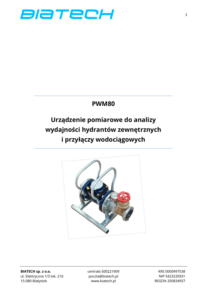 1 PWM80 Urządzenie pomiarowe do analizy wydajności hydrantów zewnętrznych i przyłączy wodociągowych BIATECH sp. z o.o. ul. Elektryczna 1/3 lok. 216 15-080 Białystok centrala 500221909 [email protected] www.biatech.pl KRS 0000497538 NIP 5423235931 REGON 200834957 2 Spis treści 1. Wstęp ................................................................................................................................................. 3 2. Cechy urządzenia ............................................................................................................................. 3 3. Użytkowanie urządzenia ................................................................................................................. 5 BIATECH sp. z o.o. ul. Elektryczna 1/3 lok. 216 15-080 Białystok centrala 500221909 [email protected] www.biatech.pl KRS 0000497538 NIP 5423235931 REGON 200834957 3 1. Wstęp Zastosowanie PWM80 jest urządzeniem pomiarowym, znajdującym szerokie praktyczne zastosowanie np. w diagnostyce wydajności hydrantów zewnętrznych DN80, DN100 i DN150 oraz przyłączy wodociągowych od DN50, w określaniu kontroli zużycia i pomiarów rozliczeniowych wody pobieranej z hydrantów zewnętrznych, w szacowaniu ilości wody na cele przeciwpożarowe. Może służyć w ustalaniu stanu systemu (przyłącza) doprowadzającego wodę oraz do pomiarów ekstremalnie wysokich strumieni objętości, np. za pompami. Łatwy w montażu i obsłudze. PWM80 posiada szeroki zakres pomiaru strumienia objętości, nie wymaga zachowania odcinków prostych przed i za urządzeniem. 2. Cechy urządzenia Funkcje i właściwości urządzenia Parametry pracy urządzenia: zakres pomiaru strumienia objętości 0,2 ÷ 40,0 m3/h, rozruchowy strumień objętości wynosi 0,1 m3/h, dokładność pomiaru 0,001 m3; zakres ciśnienia 0 ÷ 1,6 MPa, błąd pomiaru wynosi ±0,2% zakresu pomiarowego; temperatura pracy w zakresie +1°C ÷ +50°C; wykonanie PN 16. Właściwości urządzenia: czytelna i obrotowa tarcza liczydła wodomierza i manometru; posiada zawór kulowy lub zasuwę – w opcji do wyboru; stabilna podstawa; łatwy w montażu i demontażu; armatura pożarnicza zgodna z PN, posiada atesty CNBOP. Wyposażenie standardowe: urządzenie pomiarowe PWM80; Karta gwarancyjna; Deklaracja zgodności; Świadectwo Sprawdzenia manometru; Dokumentacja techniczno – ruchowa. Wyposażenie dodatkowe: przełącznik aluminiowy 75/52 PN; przełącznik aluminiowy 110/75 PN; pokrywa nasady aluminiowa 75 PN; BIATECH sp. z o.o. ul. Elektryczna 1/3 lok. 216 15-080 Białystok centrala 500221909 [email protected] www.biatech.pl KRS 0000497538 NIP 5423235931 REGON 200834957 4 klucz do hydrantu nadziemnego 75; klucz do hydrantu podziemnego; stojak hydrantowy aluminiowy z wyjściami 75; zawór liniowy kulowy 52 aluminiowy z nasadą obrotową; wąż tłoczny 52, dł. 20m z łącznikami aluminiowymi 52; wąż tłoczny 75, dł. 20m z łącznikami aluminiowymi 75; nasada aluminiowa 52 gw. wewnętrzny; nasada aluminiowa 52 gw. zewnętrzny; nasada aluminiowa 75 gw. wewnętrzny; nasada aluminiowa 75 gw. zewnętrzny. Urządzenie PWM80 wersja z zaworem kulowym wersja z zasuwą z wrzecionem BIATECH sp. z o.o. ul. Elektryczna 1/3 lok. 216 15-080 Białystok centrala 500221909 [email protected] www.biatech.pl KRS 0000497538 NIP 5423235931 REGON 200834957 5 Wymiary urządzenia wymiar wyposażenie z zaworem kulowym z zasuwą z wrzecionem długość całkowita [mm] szerokość [mm] wysokość urządzenia [mm] wysokość całkowita [mm] waga [kg] 545 332 325 470 32,5 485 332 325 470 31,5 2. Użytkowanie urządzenia Sposób podłączenia urządzenia Urządzenie PWM80 należy ustawić stabilnie na podłożu zgodnie z kierunkiem przepływu wody. Podłączyć wąż z hydrantu zewnętrznego do urządzenia. Dokonać niezbędnych czynności i odłączyć urządzenie. BIATECH sp. z o.o. ul. Elektryczna 1/3 lok. 216 15-080 Białystok centrala 500221909 [email protected] www.biatech.pl KRS 0000497538 NIP 5423235931 REGON 200834957