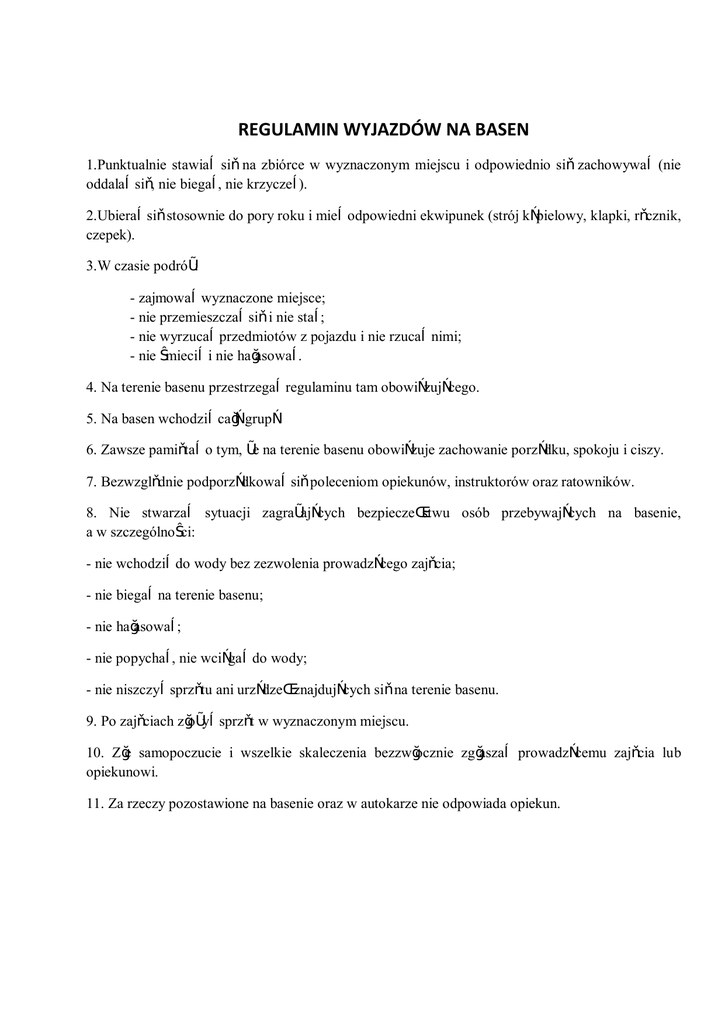 REGULAMIN WYJAZDÓW NA BASEN 1.Punktualnie stawiać się na zbiórce w wyznaczonym miejscu i odpowiednio się zachowywać (nie oddalać się, nie biegać, nie krzyczeć). 2.Ubierać się stosownie do pory roku i mieć odpowiedni ekwipunek (strój kąpielowy, klapki, ręcznik, czepek). 3.W czasie podróż: - zajmować wyznaczone miejsce; - nie przemieszczać się i nie stać; - nie wyrzucać przedmiotów z pojazdu i nie rzucać nimi; - nie śmiecić i nie hałasować. 4. Na terenie basenu przestrzegać regulaminu tam obowiązującego. 5. Na basen wchodzić całą grupą. 6. Zawsze pamiętać o tym, że na terenie basenu obowiązuje zachowanie porządku, spokoju i ciszy. 7. Bezwzględnie podporządkować się poleceniom opiekunów, instruktorów oraz ratowników. 8. Nie stwarzać sytuacji zagrażających bezpieczeństwu osób przebywających na basenie, a w szczególności: - nie wchodzić do wody bez zezwolenia prowadzącego zajęcia; - nie biegać na terenie basenu; - nie hałasować; - nie popychać, nie wciągać do wody; - nie niszczyć sprzętu ani urządzeń znajdujących się na terenie basenu. 9. Po zajęciach złożyć sprzęt w wyznaczonym miejscu. 10. Złe samopoczucie i wszelkie skaleczenia bezzwłocznie zgłaszać prowadzącemu zajęcia lub opiekunowi. 11. Za rzeczy pozostawione na basenie oraz w autokarze nie odpowiada opiekun.