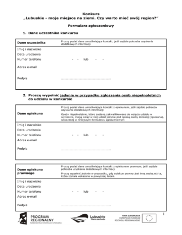 Konkurs „Lubuskie - moje miejsce na ziemi. Czy warto mieć swój region?” Formularz zgłoszeniowy 1. Dane uczestnika konkursu Dane uczestnika Proszę podać dane umożliwiające kontakt, jeśli zajdzie potrzeba uzyskania dodatkowych informacji Imię i nazwisko Data urodzenia Numer telefonu - - lub - - Adres e-mail Podpis ………………………………………………….. 2. Proszę wypełnić jedynie w przypadku zgłoszenia osób niepełnoletnich do udziału w konkursie Proszę podać dane umożliwiające kontakt z opiekunem, jeśli zajdzie potrzeba uzyskania dodatkowych informacji Dane opiekuna Osoby niepełnoletnie, które zostaną zakwalifikowane do wzięcia udziału w wycieczce, mogą wziąć w niej udział jedynie pod opieką osoby dorosłej (opiekuna), wskazanej w niniejszym formularzu zgłoszeniowym Imię i nazwisko Data urodzenia Numer telefonu - - lub - - Adres e-mail Podpis Dane opiekuna prawnego ………………………………………………….. Proszę podać dane umożliwiające kontakt z opiekunem prawnym, jeśli zajdzie potrzeba uzyskania dodatkowych informacji Proszę wypełnić jedynie w przypadku, gdy opiekun prawny jest inną osobą niż ta, która została wskazana w powyższej tabeli. Imię i nazwisko Data urodzenia Numer telefonu - - lub - - Adres e-mail Podpis ………………………………………………….. 1 Wypełniony i podpisany formularz należy wydrukować, a następnie przesłać do 15 stycznia 2014 roku włącznie (decyduje data stempla pocztowego). Prace należy przesłać lub dostarczyć do redakcji "Gazety Lubuskiej" w Zielonej Górze (Gazeta Lubuska, al. Niepodległości 25, 65-042 Zielona Góra). Na kopercie musi być dopisek „15 lat Lubuskiego”. Do wypełnionego formularza należy dołączyć płytę CD lub DVD z nagraną pracą konkursową (należy na niej napisać imię i nazwisko uczestnika konkursu). Przesyłając pracę konkursową wyrażam zgodę na przetwarzanie swoich danych osobowych, podanych na zasadzie dobrowolności, udostępnionych w formularzu rejestracyjnym, przez Urząd Marszałkowski Województwa Lubuskiego, dla celów realizacji konkursu "Lubuskie - moje miejsce na ziemi" organizowanego przez Urząd Marszałkowski Województwa Lubuskiego, Departament Lubuskiego Regionalnego Programu Operacyjnego, zgodnie z ustawą z dnia 29.08.1997 r. o ochronie danych osobowych (j.t. z 2002 r. Dz. U. Nr 101 poz. 926 z późn. zm)”. Zgoda obejmuje przetwarzanie danych teraz i w przyszłości. Osobom wyrażającym zgodę na przetwarzanie danych przysługuje prawo wglądu do przekazanych danych oraz do ich poprawienia, a także ewentualnego usunięcia. Podanie danych jest dobrowolne, ale niezbędne do zarejestrowania się w Konkursie. 2
