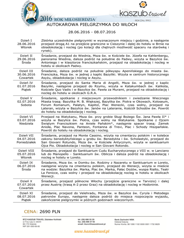 AUTOKAROWA PIELGRZYMKA DO WŁOCH 28.06.2016 - 08.07.2016 Dzień I 28.06.2016 Wtorek Zbiórka uczestników pielgrzymki w wyznaczonym miejscu i godzinie, a następnie przejazd drogą A1 na przejście graniczne w Cieszynie i dalej do hotelu w Brnie na obiadokolację i nocleg (po kolacji dla chętnych możliwość spaceru na starówkę i rynek). Dzień II 29.06.2016 Środa Śniadanie, przejazd do Wiednia, Msza św. w Kościele św. Józefa na Kahlenbergu, panorama Wiednia, dalsza podróż na południe do Padwy, wizyta w Bazylice św. Antoniego i w klasztorze franciszkańskim, przejazd na obiadokolację i nocleg w hotelu w okolicach Padwy. Dzień III 30.06.2016 Czwartek Śniadanie, dalsza podróż na południe półwyspu Apenińskiego do miasta św. Franciszka, Msza św. w jednej z kaplic Bazyliki. Wizyta w centrum historycznego Asyżu, obiadokolacja i nocleg w Asyżu. Dzień IV 01.07.2016 Piątek Śniadanie, przejazd do Santa Maria di Angelli, Msza św. w jednej z kaplic Bazyliki, następnie przejazd do Rzymu, wizyta w Katakumbach św. Kaliksta, Kościele Quo Vadis i w Bazylice św. Pawła za Murami, przejazd na obiadokolację i nocleg do hotelu w okolicach G.R.A. Dzień V 02.07.2016 Sobota Śniadanie, spotkanie z miejscowym Miasta trasą: Bazylika M. B. Większej, Forum Romanum, Palatyn, Kapitol, Lateran, wizyta w Bazylice św. Janów do hotelu na obiadokolację i nocleg. Dzień VI 03.07.2016 Niedziela Przejazd na Watykanu, Msza św. przy grobie Sługi Bożego Św. Jana Pawła II* i wizyta w Bazylice św. Piotra, czas wolny na Watykanie. Spotkanie z Ojcem Świętym Franciszkiem na Aniele Pańskim*, następnie spacer trasą: Zamek Anioła, Plac Navona, Panteon, Fontanna di Trevi, Plac i Schody Hiszpańskie. Powrót do hotelu na obiadokolację i nocleg. Dzień VII 04.07.2016 Poniedziałek Śniadanie, przejazd na Monte Cassino, wizyta na cmentarzu polskim i w kolebce zakonu benedyktyńskiego u grobu św. Benedykta i św. Scholastyki, przejazd do San Giovani Rotundo, Msza św. w Kościele Antycznym, wizyta w sanktuarium Ojca Pio. Obiadokolacja i nocleg w San Giovani Rotondo. Dzień VIII 05.07.2016 Wtorek Śniadanie, przejazd do Sanktuarium Cudu Eucharystycznego z VIII w. w Lanciano lub do Manopello - Sanktuarium św. Oblicza i dalsza podróż na obiadokolację i nocleg w hotelu w Loreto. Dzień IX 06.07.2016 Środa Śniadanie, Msza św. w Domku św. Rodziny z Nazaretu w Sanktuarium w Loreto, następnie wizyta na cmentarzu polskim, przejazd do Wenecji, wizyta w mieście na wodzie: Bazylika św. Marka, Plac św. Marka, Pałac Dożów, wyspa Rialto, Teatr La Fenicce, czas wolny i przejazd na obiadokolację nocleg w hotelu w okolicach Wenecji. Dzień X 07.07.2016 Czwartek Śniadanie, przejazd północne Włochy (przejście graniczne w Tarvizio) i dalej przez Austrię (trasą A-2 przez Graz) na obiadokolację i nocleg w Hodoninie. Dzień XI 08.07.2016 Piątek Śniadanie, przejazd do Velehradu, Msza św. w Bazylice św. Cyryla i Metodego patronów Europy, następnie dalsza podróż do miejsca rozpoczęcia wyjazdu, zakończenie pielgrzymki w późnych godzinach wieczornych. CENA: 2690 PLN przewodnikiem i zwiedzanie Wiecznego Bazylika św. Piotra w Okowach, Koloseum, Plac Wenecki, czas wolny, przejazd na na Lateranie, Kościół Schodów św. Powrót ŚWIADCZENIA: • przejazd autokarem turystycznym zgodnie z programem • 10 noclegów w pokojach 2 osobowych z WC i łazienką • 9 śniadań • 10 obiadokolacji • ubezpieczenie KL, NNW i bagażu w Signal Iduna – wariant podstawowy (nie obejmuje chorób przewlekłych) • opieka pilota na całej trasie • przewodnicy miejscowi zgodnie z programem CENA NIE ZAWIERA: • biletów wstępów do zwiedzanych obiektów • biletów komunikacji miejskiej • indywidualnego nagłośnienia UWAGI: • każdego dnia Msza św, zgodnie z ustaleniami z Opiekunem Duchowym • zastrzega się możliwość zmiany kolejności zwiedzanych obiektów • organizator nie odpowiada za nieprzewidziane zmiany niezależne od niego • * Msza św. przy grobie Sługi Bożego Św. Jana Pawła II – uzależniona od dostępności miejsc • * Spotkanie z Ojcem Świętym Franciszkiem uzależnione od obecności Papieża w Rzymie