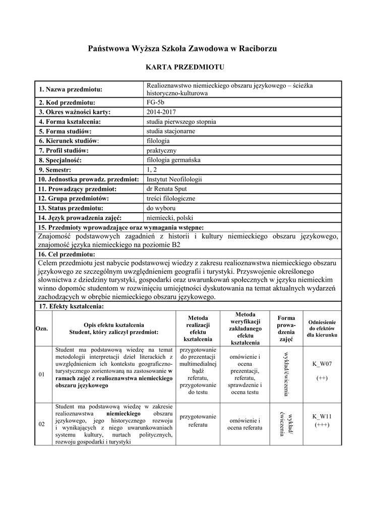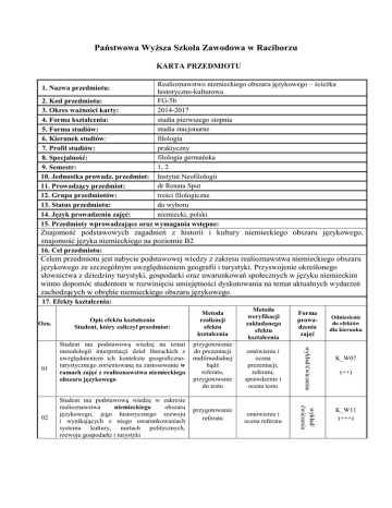 Państwowa Wyższa Szkoła Zawodowa w Raciborzu KARTA PRZEDMIOTU Realioznawstwo niemieckiego obszaru językowego – ścieżka historyczno-kulturowa FG-5b 2. Kod przedmiotu: 2014-2017 3. Okres ważności karty: studia pierwszego stopnia 4. Forma kształcenia: studia stacjonarne 5. Forma studiów: 6. Kierunek studiów: filologia praktyczny 7. Profil studiów: filologia germańska 8. Specjalność: 1, 2 9. Semestr: 10. Jednostka prowadz. przedmiot: Instytut Neofilologii dr Renata Sput 11. Prowadzący przedmiot: treści filologiczne 12. Grupa przedmiotów: 13. Status przedmiotu: do wyboru 14. Język prowadzenia zajęć: niemiecki, polski 15. Przedmioty wprowadzające oraz wymagania wstępne: 1. Nazwa przedmiotu: Znajomość podstawowych zagadnień z historii i kultury niemieckiego obszaru językowego, znajomość języka niemieckiego na poziomie B2 16. Cel przedmiotu: Celem przedmiotu jest nabycie podstawowej wiedzy z zakresu realioznawstwa niemieckiego obszaru językowego ze szczególnym uwzględnieniem geografii i turystyki. Przyswojenie określonego słownictwa z dziedziny turystyki, gospodarki oraz uwarunkowań społecznych w języku niemieckim winno dopomóc studentom w rozwinięciu umiejętności dyskutowania na temat aktualnych wydarzeń zachodzących w obrębie niemieckiego obszaru językowego. 17. Efekty kształcenia: 02 Student ma podstawową wiedzę w zakresie realioznawstwa niemieckiego obszaru językowego, jego historycznego rozwoju i wynikających z niego uwarunkowaniach systemu kultury, nurtach politycznych, rozwoju gospodarki i turystyki przygotowanie do prezentacji multimedialnej bądź referatu, przygotowanie do testu omówienie i ocena prezentacji, referatu, sprawdzenie i ocena testu przygotowanie referatu omówienie i ocena referatu wykład/ ćwiczenia 01 Student ma podstawową wiedzę na temat metodologii interpretacji dzieł literackich z uwzględnieniem ich kontekstu geograficznoturystycznego zorientowaną na zastosowanie w ramach zajęć z realioznawstwa niemieckiego obszaru językowego Forma prowadzenia zajęć wykład/ćwiczenia Ozn. Opis efektu kształcenia Student, który zaliczył przedmiot: Metoda weryfikacji zakładanego efektu kształcenia Metoda realizacji efektu kształcenia Odniesienie do efektów dla kierunku K_W07 (++) K_W11 (+++) udział w dyskusji podsumowanie dyskusji udział w dyskusji, podsumowanie dyskusji wykład/ ćwiczenia 05 Student potrafi zweryfikować swoją postawę, jest otwarty na poglądy innych, potrafi odpowiedzialnie reprezentować polską kulturę w kulturze niemieckiego obszaru językowego podsumowanie dyskusji, omówienie i ocena prezentacji, sprawdzenie i ocena testu wykład/ćwiczenia 04 udział w dyskusji, przygotowanie prezentacji multimedialnej przygotowanie do testu wykład/ćwiczenia 03 Student potrafi samodzielnie zdobywać wiedzę i rozwijać swoje profesjonalne umiejętności z zakresu realioznawstwa niemieckiego obszaru językowego ze szczególnym uwzględnieniem uwarunkowań geograficznoturystycznych korzystając z różnych źródeł w języku polskim i w języku niemieckim i nowoczesnych technologii Student potrafi zweryfikować poziomu swojej wiedzy i umiejętności, rozumie potrzebę ciągłego dokształcania się zawodowego i rozwoju osobistego, dokonuje samooceny własnych kompetencji i doskonali umiejętności w zakresie realioznawstwa niemieckiego obszaru językowego ze szczególnym uwzględnieniem geografii i turystyki, wyznacza kierunki własnego rozwoju i kształcenia K_U04 (++) K_K01 (++) K_K05 (+++) W. (15+15), Ćw. (30+30) 18. Formy i wymiar zajęć: 19. Treści kształcenia: Niemcy, Austria, Szwajcaria: ustrój polityczny, partie polityczne, system edukacyjny, języki urzędowe i dialekty. Germanie. Monarchie: merowińska i karolińska. Feudalizm, Uniwersalizm ottoński. Spór o inwestyturę. Rozwój miast. Wyprawy krzyżowe. Reformacja. Wojna trzydziestoletnia. Pojęcie kultury. Antyk. Chrześcijaństwo. Kultura zachodnia. Rzymianie. Karol Wielki i jego program kulturowy. Schleswig-Holstein. Hamburg. Niedersachsen. Bremen. Nordrhein-Westfalen. Hessen. Rheinland-Pfalz. Saarland. Baden-Württemberg. Mecklenburg-Vorpommern. Sachsen-Anhalt. Berlin. Brandenburg. Thüringen. Sachsen. Bayern. Die Schweiz. Österreich. Typisch deutsch, schweizerisch und österreichisch. Wojny śląskie. Państwa niemieckie pod hegemonią napoleońską. Kongres Wiedeński. Związek Niemiecki. Wiosna Ludów. Związek Północno-Niemiecki. Zjednoczenie Niemiec pod egidą Prus. II Rzesza. I i II wojna światowa. 20. Egzamin: nie, zal. zal/o 21. Literatura podstawowa: Bęza, S.: Eine klenie Landeskunde der deutschsprachiger Länder, Warszawa 2004. Czapliński, W., Galos, A., Korta, W.: Historia Niemiec, Wrocław [etc.] 1981. Paluszyński, T.: Historia Niemiec i państw niemieckich: zarys dziejów politycznych, Poznań 2005. Karolak, Cz., Kunicki, W., Orłowski, H.: Dzieje kultury niemieckiej, Warszawa 2006. Koch, W.: BAUSTILKUNDE. Das Standardwerk zur europäischen Baukunst von der Antike bis zur Gegenwart, Gütersloh/München 2009. 21. Literatura uzupełniająca: Krakuski, J.: Historia Niemiec, Wrocław 2004. Luscher, R.: Landeskunde Deutschland von der Wende bis heute: Daten, Texte, Aufgaben für Deutsch als Fremdsprache, München 2005. Becher, U. A. J., Borodziej, W., Maier, R. (Hg.): Deutschland und Polen im 20. Jahrhundert. Analysen – Quellen – didaktische Hinweise, Bonn 2007. 23. Nakład pracy studenta potrzebny do osiągnięcia efektów kształcenia: Liczba godzin Lp. Forma zajęć kontaktowych / pracy studenta 30 1 Wykład 2 3 Ćwiczenia Laboratorium 60 4 5 Projekt Seminarium Inne: powtórzenie i utrwalenie wiadomości, przygotowanie referatu, 6 przygotowanie prezentacji multimedialnej, przygotowanie do testu, studiowanie literatury Suma godzin 24. Suma wszystkich godzin: 180 26. Liczba punktów ECTS uzyskanych na zajęciach z bezpośrednim 3 udziałem nauczyciela akademickiego: Kryteria oceniania: Efekt kształcenia Ocen