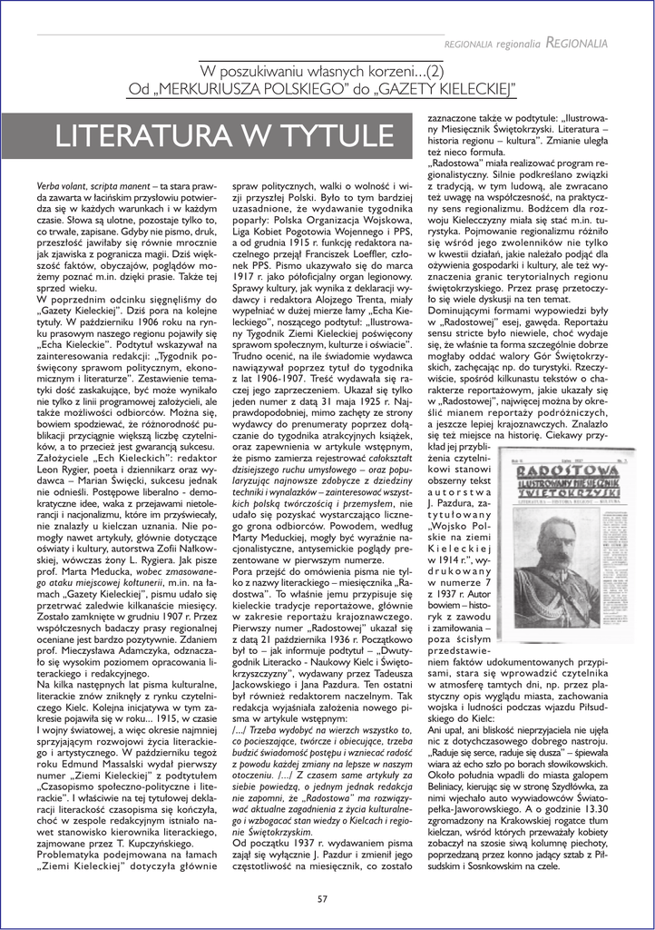 REGIONALIA regionalia REGIONALIA W poszukiwaniu własnych korzeni...(2) Od „MERKURIUSZA POLSKIEGO” do „GAZETY KIELECKIEJ” LITERATURA W TYTULE Verba volant, scripta manent – ta stara prawda zawarta w łacińskim przysłowiu potwierdza się w każdych warunkach i w każdym czasie. Słowa są ulotne, pozostaje tylko to, co trwałe, zapisane. Gdyby nie pismo, druk, przeszłość jawiłaby się równie mrocznie jak zjawiska z pogranicza magii. Dziś większość faktów, obyczajów, poglądów możemy poznać m.in. dzięki prasie. Także tej sprzed wieku. W poprzednim odcinku sięgnęliśmy do „Gazety Kieleckiej”. Dziś pora na kolejne tytuły. W październiku 1906 roku na rynku prasowym naszego regionu pojawiły się „Echa Kieleckie”. Podtytuł wskazywał na zainteresowania redakcji: „Tygodnik poświęcony sprawom politycznym, ekonomicznym i literaturze”. Zestawienie tematyki dość zaskakujące, być może wynikało nie tylko z linii programowej założycieli, ale także możliwości odbiorców. Można się, bowiem spodziewać, że różnorodność publikacji przyciągnie większą liczbę czytelników, a to przecież jest gwarancją sukcesu. Założyciele „Ech Kieleckich”: redaktor Leon Rygier, poeta i dziennikarz oraz wydawca – Marian Święcki, sukcesu jednak nie odnieśli. Postępowe liberalno - demokratyczne idee, waka z przejawami nietolerancji i nacjonalizmu, które im przyświecały, nie znalazły u kielczan uznania. Nie pomogły nawet artykuły, głównie dotyczące oświaty i kultury, autorstwa Zofii Nałkowskiej, wówczas żony L. Rygiera. Jak pisze prof. Marta Meducka, wobec zmasowanego ataku miejscowej kołtunerii, m.in. na łamach „Gazety Kieleckiej”, pismu udało się przetrwać zaledwie kilkanaście miesięcy. Zostało zamknięte w grudniu 1907 r. Przez współczesnych badaczy prasy regionalnej oceniane jest bardzo pozytywnie. Zdaniem prof. Mieczysława Adamczyka, odznaczało się wysokim poziomem opracowania literackiego i redakcyjnego. Na kilka następnych lat pisma kulturalne, literackie znów zniknęły z rynku czytelniczego Kielc. Kolejna inicjatywa w tym zakresie pojawiła się w roku... 1915, w czasie I wojny światowej, a więc okresie najmniej sprzyjającym rozwojowi życia literackiego i artystycznego. W październiku tegoż roku Edmund Massalski wydał pierwszy numer „Ziemi Kieleckiej” z podtytułem „Czasopismo społeczno-polityczne i literackie”. I właściwie na tej tytułowej deklaracji literackość czasopisma się kończyła, choć w zespole redakcyjnym istniało nawet stanowisko kierownika literackiego, zajmowane przez T. Kupczyńskiego. Problematyka podejmowana na łamach „Ziemi Kieleckiej” dotyczyła głównie spraw politycznych, walki o wolność i wizji przyszłej Polski. Było to tym bardziej uzasadnione, że wydawanie tygodnika poparły: Polska Organizacja Wojskowa, Liga Kobiet Pogotowia Wojennego i PPS, a od grudnia 1915 r. funkcję redaktora naczelnego przejął Franciszek Loeffler, członek PPS. Pismo ukazywało się do marca 1917 r. jako półoficjalny organ legionowy. Sprawy kultury, jak wynika z deklaracji wydawcy i redaktora Alojzego Trenta, miały wypełniać w dużej mierze łamy „Echa Kieleckiego”, noszącego podtytuł: „Ilustrowany Tygodnik Ziemi Kieleckiej poświęcony sprawom społecznym, kulturze i oświacie”. Trudno ocenić, na ile świadomie wydawca nawiązywał poprzez tytuł do tygodnika z lat 1906-1907. Treść wydawała się raczej jego zaprzeczeniem. Ukazał się tylko jeden numer z datą 31 maja 1925 r. Najprawdopodobniej, mimo zachęty ze strony wydawcy do prenumeraty poprzez dołączanie do tygodnika atrakcyjnych książek, oraz zapewnienia w artykule wstępnym, że pismo zamierza rejestrować całokształt dzisiejszego ruchu umysłowego – oraz popularyzując najnowsze zdobycze z dziedziny techniki i wynalazków – zainteresować wszystkich polską twórczością i przemysłem, nie udało się pozyskać wystarczająco licznego grona odbiorców. Powodem, według Marty Meduckiej, mogły być wyraźnie nacjonalistyczne, antysemickie poglądy prezentowane w pierwszym numerze. Pora przejść do omówienia pisma nie tylko z nazwy literackiego – miesięcznika „Radostwa”. To właśnie jemu przypisuje się kieleckie tradycje reportażowe, głównie w zakresie reportażu krajoznawczego. Pierwszy numer „Radostowej” ukazał się z datą 21 października 1936 r. Początkowo był to – jak informuje podtytuł – „Dwutygodnik Literacko - Naukowy Kielc i Świętokrzyszczyzny”, wydawany przez Tadeusza Jackowskiego i Jana Pazdura. Ten ostatni był również redaktorem naczelnym. Tak redakcja wyjaśniała założenia nowego pisma w artykule wstępnym: /.../ Trzeba wydobyć na wierzch wszystko to, co pocieszające, twórcze i obiecujące, trzeba budzić świadomość postępu i wzniecać radość z powodu każdej zmiany na lepsze w naszym otoczeniu. /.../ Z czasem same artykuły za siebie powiedzą, o jednym jednak redakcja nie zapomni, że „Radostowa” ma rozwiązywać aktualne zagadnienia z życia kulturalnego i wzbogacać stan wiedzy o Kielcach i regionie Świętokrzyskim. Od początku 1937 r. wydawaniem pisma zajął się wyłącznie J. Pazdur i zmienił jego częstotliwość na miesięcznik, co zostało 57 zaznaczone także w podtytule: „Ilustrowany Miesięcznik Świętokrzyski. Literatura – historia regionu – kultura”. Zmianie uległa też nieco formuła. „Radostowa” miała realizować program regionalistyczny. Silnie podkreślano związki z tradycją, w tym ludową, ale zwracano też uwagę na współczesność, na praktyczny sens regionalizmu. Bodźcem dla rozwoju Kielecczyzny miała się stać m.in. turystyka. Pojmowanie regionalizmu różniło się wśród jego zwolenników nie tylko w kwestii działań, jakie należało podjąć dla ożywienia gospodarki i kultury, ale też wyznaczenia granic terytorialnych regionu świętokrzyskiego. Przez prasę przet
