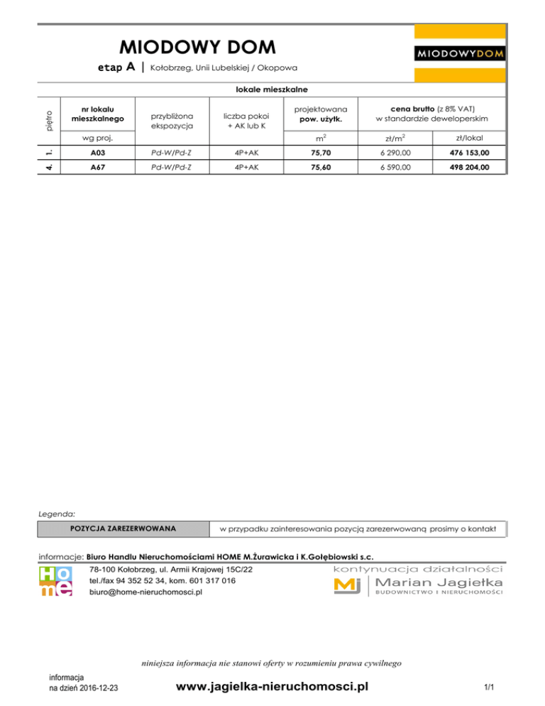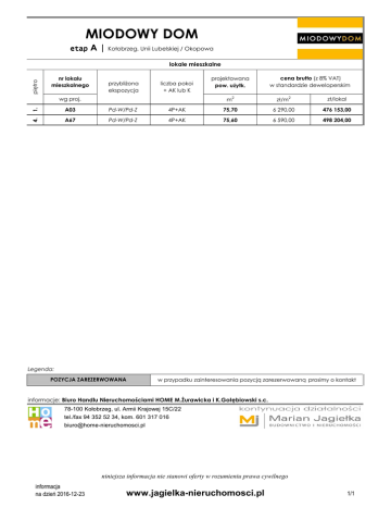MIODOWY DOM etap A | Kołobrzeg, Unii Lubelskiej / Okopowa piętro lokale mieszkalne nr lokalu mieszkalnego przybliŜona ekspozycja liczba pokoi + AK lub K cena brutto (z 8% VAT) w standardzie deweloperskim zł/m2 zł/lokal 1. m2 A03 Pd-W/Pd-Z 4P+AK 75,70 6 290,00 476 153,00 4. wg proj. projektowana pow. uŜytk. A67 Pd-W/Pd-Z 4P+AK 75,60 6 590,00 498 204,00 Legenda: POZYCJA ZAREZERWOWANA w przypadku zainteresowania pozycją zarezerwowaną prosimy o kontakt informacje: Biuro Handlu Nieruchomościami HOME M.śurawicka i K.Gołębiowski s.c. 78-100 Kołobrzeg, ul. Armii Krajowej 15C/22 tel./fax 94 352 52 34, kom. 601 317 016 [email protected] niniejsza informacja nie stanowi oferty w rozumieniu prawa cywilnego informacja na dzień 2016-12-23 www.jagielka-nieruchomosci.pl 1/1