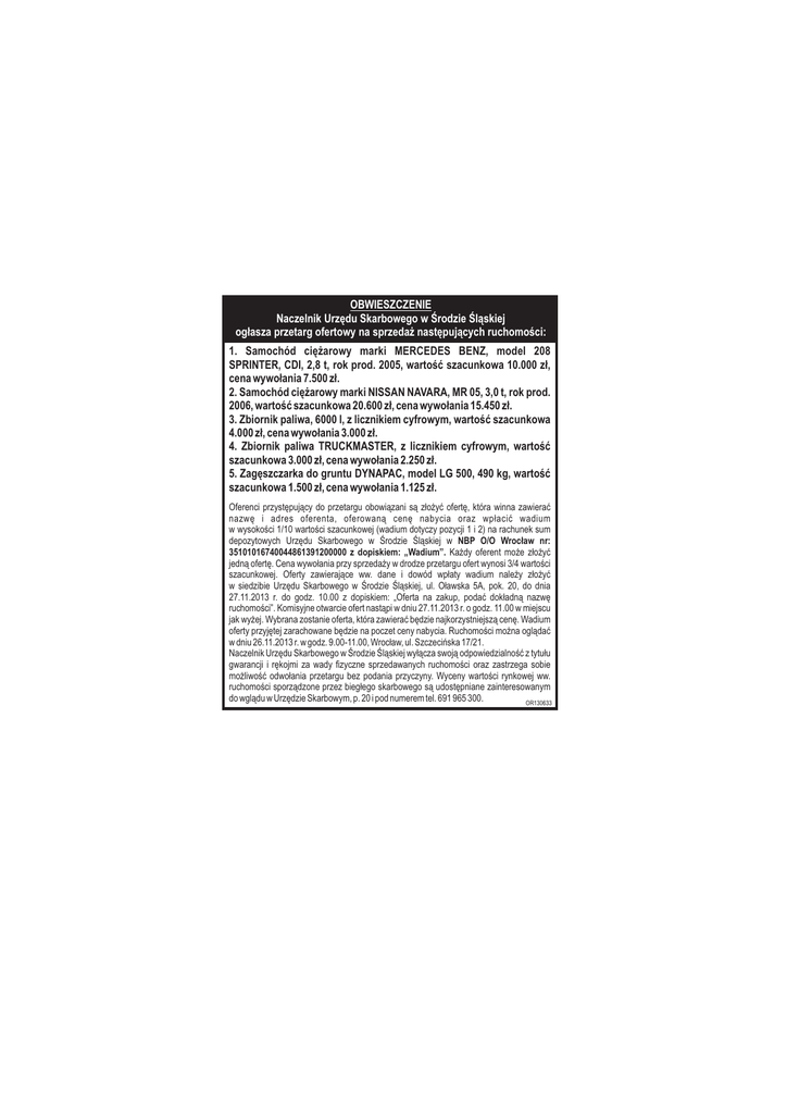 OBWIESZCZENIE Naczelnik Urzêdu Skarbowego w Œrodzie Œl¹skiej og³asza przetarg ofertowy na sprzeda¿ nastêpuj¹cych ruchomoœci: 1. Samochód ciê¿arowy marki MERCEDES BENZ, model 208 SPRINTER, CDI, 2,8 t, rok prod. 2005, wartoœæ szacunkowa 10.000 z³, cena wywo³ania 7.500 z³. 2. Samochód ciê¿arowy marki NISSAN NAVARA, MR 05, 3,0 t, rok prod. 2006, wartoœæ szacunkowa 20.600 z³, cena wywo³ania 15.450 z³. 3. Zbiornik paliwa, 6000 l, z licznikiem cyfrowym, wartoœæ szacunkowa 4.000 z³, cena wywo³ania 3.000 z³. 4. Zbiornik paliwa TRUCKMASTER, z licznikiem cyfrowym, wartoœæ szacunkowa 3.000 z³, cena wywo³ania 2.250 z³. 5. Zagêszczarka do gruntu DYNAPAC, model LG 500, 490 kg, wartoœæ szacunkowa 1.500 z³, cena wywo³ania 1.125 z³. Oferenci przystêpuj¹cy do przetargu obowi¹zani s¹ z³o¿yæ ofertê, która winna zawieraæ nazwê i adres oferenta, oferowan¹ cenê nabycia oraz wp³aciæ wadium w wysokoœci 1/10 wartoœci szacunkowej (wadium dotyczy pozycji 1 i 2) na rachunek sum depozytowych Urzêdu Skarbowego w Œrodzie Œl¹skiej w NBP O/O Wroc³aw nr: 35101016740044861391200000 z dopiskiem: „Wadium”. Ka¿dy oferent mo¿e z³o¿yæ jedn¹ ofertê. Cena wywo³ania przy sprzeda¿y w drodze przetargu ofert wynosi 3/4 wartoœci szacunkowej. Oferty zawieraj¹ce ww. dane i dowód wp³aty wadium nale¿y z³o¿yæ w siedzibie Urzêdu Skarbowego w Œrodzie Œl¹skiej, ul. O³awska 5A, pok. 20, do dnia 27.11.2013 r. do godz. 10.00 z dopiskiem: „Oferta na zakup, podaæ dok³adn¹ nazwê ruchomoœci”. Komisyjne otwarcie ofert nast¹pi w dniu 27.11.2013 r. o godz. 11.00 w miejscu jak wy¿ej. Wybrana zostanie oferta, która zawieraæ bêdzie najkorzystniejsz¹ cenê. Wadium oferty przyjêtej zarachowane bêdzie na poczet ceny nabycia. Ruchomoœci mo¿na ogl¹daæ w dniu 26.11.2013 r. w godz. 9.00-11.00, Wroc³aw, ul. Szczeciñska 17/21. Naczelnik Urzêdu Skarbowego w Œrodzie Œl¹skiej wy³¹cza swoj¹ odpowiedzialnoœæ z tytu³u gwarancji i rêkojmi za wady fizyczne sprzedawanych ruchomoœci oraz zastrzega sobie mo¿liwoœæ odwo³ania przetargu bez podania przyczyny. Wyceny wartoœci rynkowej ww. ruchomoœci sporz¹dzone przez bieg³ego skarbowego s¹ udostêpniane zainteresowanym do wgl¹du w Urzêdzie Skarbowym, p. 20 i pod numerem tel. 691 965 300. OR130633
