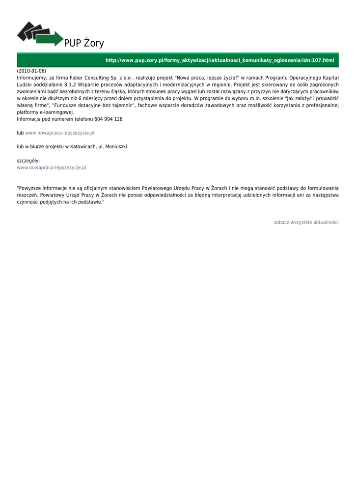 PUP Żory http://www.pup.zory.pl/formy_aktywizacji/aktualnosci_komunikaty_ogloszenia/idn:107.html (2010-01-06) Informujemy, ze firma Faber Consulting Sp. z o.o . realizuje projekt "Nowa praca, lepsze życie!" w ramach Programu Operacyjnego Kapitał Ludzki poddziałanie 8.1.2 Wsparcie procesów adaptacyjnych i modernizacyjnych w regionie. Projekt jest skierowany do osób zagrożonych zwolnieniami bądź bezrobotnych z terenu śląska, których stosunek pracy wygasł lub został rozwiązany z przyczyn nie dotyczących pracowników w okresie nie dłuższym niż 6 miesięcy przed dniem przystąpienia do projektu. W programie do wyboru m.in. szkolenie "Jak założyć i prowadzić własną firmę", "Fundusze dotacyjne bez tajemnic", fachowe wsparcie doradców zawodowych oraz możliwość korzystania z profesjonalnej platformy e-learningowej. Informacja pod numerem telefonu 604 994 128 lub www.nowapraca-lepszezycie.pl lub w biurze projektu w Katowicach, ul. Moniuszki szczegóły: www.nowapraca-lepszezycie.pl "Powyższe informacje nie są oficjalnym stanowiskiem Powiatowego Urzędu Pracy w Żorach i nie mogą stanowić podstawy do formułowania roszczeń. Powiatowy Urząd Pracy w Żorach nie ponosi odpowiedzialności za błędną interpretację udzielonych informacji ani za następstwa czynności podjętych na ich podstawie." zobacz wszystkie aktualności