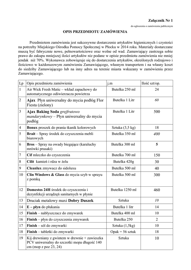 Załącznik Nr 1 do ogłoszenia o zamówieniu publicznym OPIS PRZEDMIOTU ZAMÓWIENIA Przedmiotem zamówienia jest sukcesywne dostarczenie artykułów higienicznych i czystości na potrzeby Miejskiego Ośrodka Pomocy Społecznej w Płocku w 2014 roku. Materiały dostarczane muszą być fabrycznie nowe, pełnowartościowe oraz wolne od wad. Zamawiający zastrzega sobie prawo do zakupu mniejszej ilości artykułów niz podane w opisie przedmiotu zamówienia nie mniej jendak niż 70%. Wykonawca zobowiązuje się do dostarczenia artykułów, określonych rodzajowo i ilościowo w każdorazowym zamówieniu Zamawiającego, własnym transportem i na własny koszt do siedziby Zamawiającego lub na inny adres na terenie miasta wskazany w zamówieniu przez Zamawiającego. Lp Opis przedmiotu zamówienia j.m Ilość szt/op. 1 Air Wick Fresh Matic – wkład zapachowy do automatycznego odświerzacza powietrza Butelka 250 ml 24 2 Ajax Płyn uniwersalny do mycia podłóg Flor Fiesta (zielony) Butelka 1 Litr 60 3 Ajax Baking Soda grejfrutowo mandarynkowy – Płyn uniwersalny do mycia podłóg Butelka 1 Litr 500 4 Bonux proszek do prania tkanik kolorowych Sztuka (3,5 kg) 18 5 Brait – Spray środek do czyszczenia mebli biurowych Butelka 350 ml 400 6 Bros – Spray na owady biegające (karaluchy mrówki prusaki) Butelka 300 ml 5 7 Cif mleczko do czyszczenia Butelka 700 ml 150 8 Cilit kamień i rdza w żelu Butelka 420g 30 9 Cleanlux zmywacz do sidoluxu Butelka 500 ml 40 10 Clin Windows & Glass do mycia szyb w sprayu z pomką Butelka 500 ml 300 12 Domestos 24H środek do czyszczenia i dezynfekcji urządzęń sanitarnych w płynie Butelka 1250 ml 460 13 Druciak metalowy maxi Dobry Duszek Sztuka 10 14 E – płyn do płukania Butelka 1 litr 14 15 Finish – nabłyszczacz do zmywarek Butelka 400 ml 10 16 Finish – płyn do czyszczenia zmywarek Butelka 250 2 17 Finish – sól do zmywarki Sztuka (1,5kg) 10 18 Finish – tabletki do zmywarki Opak = 56 sztuk 18 19 Kij drewniany z gwintem w drewnie + zawieszka PCV uniwersalny do szczotki mopa długość 140 cm (mop z poz 23, 24) Sztuka 10 20 Kostka WC z zawieszką Kostka (40g) 100 21 Kret środek do udrażniania rur kanalizacyjnych Butelka 500 g 3 22 Ludwik Płyn do mycia naczyń miętowy Butelka 1 litr 220 23 MOP Konex- końcówka sznurkowa duża nie mniej niż 200 gramów Sztuka 60 24 MOP Konex- w paski Super HIT Sztuka 60 25 Mop Rozenbal szorujący paskowy, kolor żółty. (Punkty szorujące granatowe.) Sztuka 60 26 Mop mikrowłókno Rozenbal sznurkowy (włókno aktywnie myjące bez dertegentów) Sztuka 100 27 Morana Super – ścieraczka bawełniana 51x37 Opak. = 4 sztuki 60 28 Mydło toaletowe w kostce Luksja 1 kostka 100g 100 29 Mydło w płynie Butelka 5 Litrów 80 30 Mydło w płynie z dozownikiem Luksja Butelka 450 ml 20 31 Odkamieniacz do czajników Sztuka 20g 48 32 Odświerzacz powietrza Brise w sprayu Butelka 300 ml 190 33 Papier toaletowy (typu Mola Eko) biały Rolka 1900 34 Papier toaletowy biały, Rola o średnicy 19 cm szerokość wstęgi 9 cm długości wstęgi nie mniej niż 120 MB Rolka 1600 35 Pasta do szorowania Sama Sztuka 250g 60 36 Płyn do mycia paneli Quick Step Clean Butelka 0,75 litra 10 37 Pojedyńcze ręczniki papierowe gofrowane, składane w "Z" wymiary 25x23 Opak. = 200 listków 3600 38 Premium – stelaż do mopów z mikrofazy ( z poz 23 ) Sztuka 1 39 Ręczniki jednorazowe papierowe (typu AHA) Opak. = 2 sztuki 120 40 Rękawiczki jednorazowe Rozmiar S Opak = 100 sztuk 10 41 Rozembal trzonek metalowy standard 120 cm do mopa mikrowłókno ( z poz. 26) Sztuka 4 42 Rozembal trzonek metalowy standard 120 cm ( szorujący paskowy, kolor żółty poz.25) Sztuka 5 43 Szczotka do wc + podstawka Sztuka 5 44 Szufelka + zmiotka Sztuka 5 45 Ścierka z mikrofibry kolor niebieski Sztuka 150 46 Ścierka z mikrofibry kolor zielony Sztuka 150 47 Ścierka z mikrofibry kolor żółty Sztuka 300 48 Vanish płyn do czyszczenia dywanów Butelka 500 ml 1 49 Vileda super wiadro Sztuka 10 50 Vileda szczotka do zamiatania uniwersalna z drązkiem Sztuka 3 51 Worek na śmieci Merida Ekonomy 120 Litrów Rolka 50 sztuk 80 52 Worki na śmieci czarne 35 Litrów HD Rolka = 50 sztuk 120 53 Worki na śmieci czarne 60 Litrów HD Rolka = 50 sztuk 700 54 Zmywak do naczyń (Gąbka z ostrą stroną o wymiarach nie mniejszych niż 10x7 cm) Opak. = 5 sztuk 100 Opracował: Piotr Berezowski