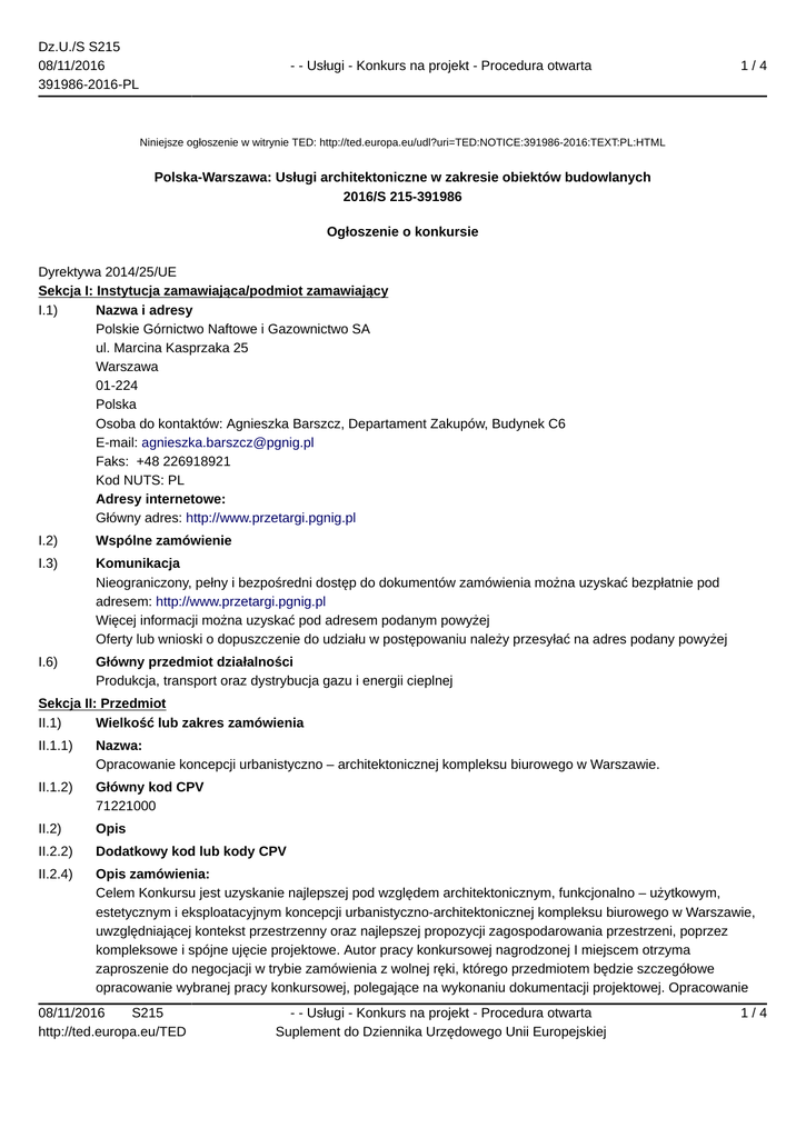 Dz.U./S S215 08/11/2016 391986-2016-PL - - Usługi - Konkurs na projekt - Procedura otwarta 1/4 Niniejsze ogłoszenie w witrynie TED: http://ted.europa.eu/udl?uri=TED:NOTICE:391986-2016:TEXT:PL:HTML Polska-Warszawa: Usługi architektoniczne w zakresie obiektów budowlanych 2016/S 215-391986 Ogłoszenie o konkursie Dyrektywa 2014/25/UE Sekcja I: Instytucja zamawiająca/podmiot zamawiający I.1) Nazwa i adresy Polskie Górnictwo Naftowe i Gazownictwo SA ul. Marcina Kasprzaka 25 Warszawa 01-224 Polska Osoba do kontaktów: Agnieszka Barszcz, Departament Zakupów, Budynek C6 E-mail: [email protected] Faks: +48 226918921 Kod NUTS: PL Adresy internetowe: Główny adres: http://www.przetargi.pgnig.pl I.2) Wspólne zamówienie I.3) Komunikacja Nieograniczony, pełny i bezpośredni dostęp do dokumentów zamówienia można uzyskać bezpłatnie pod adresem: http://www.przetargi.pgnig.pl Więcej informacji można uzyskać pod adresem podanym powyżej Oferty lub wnioski o dopuszczenie do udziału w postępowaniu należy przesyłać na adres podany powyżej I.6) Główny przedmiot działalności Produkcja, transport oraz dystrybucja gazu i energii cieplnej Sekcja II: Przedmiot II.1) Wielkość lub zakres zamówienia II.1.1) Nazwa: Opracowanie koncepcji urbanistyczno – architektonicznej kompleksu biurowego w Warszawie. II.1.2) Główny kod CPV 71221000 II.2) Opis II.2.2) Dodatkowy kod lub kody CPV II.2.4) Opis zamówienia: Celem Konkursu jest uzyskanie najlepszej pod względem architektonicznym, funkcjonalno – użytkowym, estetycznym i eksploatacyjnym koncepcji urbanistyczno-architektonicznej kompleksu biurowego w Warszawie, uwzględniającej kontekst przestrzenny oraz najlepszej propozycji zagospodarowania przestrzeni, poprzez kompleksowe i spójne ujęcie projektowe. Autor pracy konkursowej nagrodzonej I miejscem otrzyma zaproszenie do negocjacji w trybie zamówienia z wolnej ręki, którego przedmiotem będzie szczegółowe opracowanie wybranej pracy konkursowej, polegające na wykonaniu dokumentacji projektowej. Opracowanie 08/11/2016 S215 http://ted.europa.eu/TED - - Usługi - Konkurs na projekt - Procedura otwarta Suplement do Dziennika Urzędowego Unii Europejskiej 1/4 Dz.U./S S215 08/11/2016 391986-2016-PL - - Usługi - Konkurs na projekt - Procedura otwarta 2/4 koncepcji urbanistyczno-architektonicznej stanowić będzie podstawę do opracowania kompletnej dokumentacji projektowej oraz materiałów niezbędnych do przygotowania i przeprowadzenia postępowania o udzielenie zamówienia publicznego na realizację zadania inwestycyjnego polegającego na budowie kompleksu biurowego 2 w Warszawie. Szacowana wielkość kompleksu to około 29 000 m powierzchni biurowej. II.2.13) Informacje o funduszach Unii Europejskiej Zamówienie dotyczy projektu/programu finansowanego ze środków Unii Europejskiej: nie Sekcja III: Informacje o charakterze prawnym, ekonomicznym, finansowym i technicznym III.1) Warunki udziału III.1.10) Kryteria kwalifikacji uczestników: III.2) Warunki dotyczące zamówienia III.2.1) Informacje dotyczące określonego zawodu Udział jest zastrzeżony dla przedstawicieli danego zawodu: tak Proszę określić zawód: Architekt. Sekcja IV: Procedura IV.1) Opis IV.1.2) Rodzaj procedury konkursu Otwarta IV.1.7) Nazwy uczestników już zakwalifikowanych: IV.1.9) Kryteria oceny projektów: Prace konkursowe będą oceniane według następujących kryteriów: a. oryginalność projektu i atrakcyjność rozwiązań urbanistycznych i architektonicznych – waga kryterium: 50 %, b. koszt prac – waga kryterium: 10 %, c. szacunkowe koszty realizacji Obiektu (kompleksu biurowego) – waga kryterium: 20 %, d. aspekty ekonomiczne dotyczące przyszłych kosztów eksploatacyjnych – waga kryterium: 20 %. IV.2) Informacje administracyjne IV.2.2) Termin składania projektów lub wniosków o dopuszczenie do udziału Data: 28/11/2016 Czas lokalny: 12:00 IV.2.3) Data wysłania zaproszeń do udziału zakwalifikowanym kandydatom IV.2.4) Języki, w których można sporządzać projekty lub wnioski o dopuszczenie do udziału: Polski IV.3) Nagrody i sąd konkursowy IV.3.1) Informacje o nagrodzie(-ach) Zostaną przyznane nagrody: tak liczba i wartość przyznawanych nagród: Organizator Konkursu przyzna nagrody Uczestnikom Konkursu, którzy uzyskają najwyższe oceny prac konkursowych odpowiadających warunkom określonym w Regulaminie Konkursu. Nagrody pieniężne zostaną przyznane w ramach puli nagród w wysokości: 60 000 PLN brutto, w tym: pierwsza nagroda 30 000 PLN brutto, druga nagroda 20 000 PLN brutto, trzecia nagroda 10 000 PLN brutto. Sąd Konkursowy może ustanowić inny podział nagród pod warunkiem zachowania puli nagród brutto w wysokości określonej powyżej. Organizator Konkursu ma prawo pobrać z kwoty nagród pieniężnych podatek lub inne należności publicznoprawne, do których pobrania będzie zobowiązany zgodnie z obowiązującymi przepisami. Uczestnik Konkursu, którego 08/11/2016 S215 http://ted.europa.eu/TED - - Usługi - Konkurs na projekt - Procedura otwarta Suplement do Dziennika Urzędowego Unii Europejskiej 2/4 Dz.U./S S215 08/11/2016 391986-2016-PL - - Usługi - Konkurs na projekt - Procedura otwarta 3/4 praca zostanie nagrodzona pierwszą nagrodą otrzyma także nagrodę w postaci zaproszenia do udziału w postępowaniu o udzielenie zamówienia publicznego, prowadzonego w trybie zamówienia z wolnej ręki. IV.3.2) Szczegóły dotyczące płatności dla wszystkich uczestników: IV.3.3) Zamówienia po konkursie Wszelkie zamówienia na usługi następujące po konkursie zostaną udzielone zwycięzcy lub jednemu ze zwycięzców konkursu: tak IV.3.4) Decyzja sądu konkursowego Decyzja sądu konkursowego jest wiążąca dla instytucji zamawiającej/podmiotu zamawiającego: tak IV.3.5) Imiona i nazwiska wybranych członków sądu konkursowego: a) Przewodniczący Sądu – Włodzimierz Mucha b) Sędzia Referent – Roman Dziedziejko c) Sędzia – Maciej Woźniak d) Sędzia