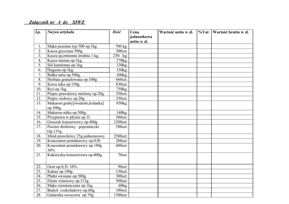 Załącznik nr 4 do SIWZ Lp. Nazwa artykułu Ilość 1. 2. 3. 4. 5. 6. 7. 8. 9. 10. 11. 12. 13. 700 kg. 300szt. 250 kg. 270kg. 330kg. 330kg. 200kg. 660szt. 830szt. 750kg. 350szt. 350szt. 850kg. 21. Mąka pszenna typ 500 op.1kg. Kasza gryczana 500g. Kasza jęczmienna średnia 1 kg. Kasza manna op.1kg. Sól kamienna op.1kg. Degusta op.1kg. Bułka tarta op.500g. Herbata granulowana op.100g. Kawa inka op.150g. Ryż op.1kg. Pieprz prawdziwy mielony op.20g. Pieprz ziołowy op.20g. Makaron gruby[świderki,kolanka] op.500g. Makaron nitka op.500g. Przyprawa w płynie op.1l. Groszek konserwowy op.400g. Pasztet drobiowy –pojemniczki Op.135g. Miód prawdziwy 25g.jednorazowy Koncentrat pomidorowy op.0,9l. Koncentrat pomidorowy op.180g 30% Kukurydza konserwowa op.400g. 22. 23. 24. 25. 26. 27. 28. Ocet op.0,5l. 10% Kakao op.100g. Płatki owsiane op.500g. Dżem wiśniowy op.315g. Mąka ziemniaczana op.1kg. Budyń czekoladowy op.60g. Galaretka owocowa op.79g. 90szt. 150szt. 300szt. 500szt. 60kg. 180szt. 1300szt. 14. 15. 16. 17. 18. 19. 20. 140kg. 360szt. 1200szt. 580szt. 2500szt. 200szt. 600szt. 70szt. Cena jednostkowa netto w zł. Wartość netto w zł. %Vat Wartość brutto w zł. 29. 30. 31. 32. 33. 34. 35. 36. 37. 38. 39. 40. 41. 42. 43. 44. 45. 46. 47. 48. 49. 50. 51. 52. 53. 54. 55. 56. 57. 58. 59. 60. 61. 62. 63. Gałka muszkatałowa op.20g. Imbir op.20g Kwasek cytrynowy op.20g. Kisiel op.60g. Liść laurowy op.20g. Miód sztuczny op.400g. Majeranek op.7g. Mięta pieprzowa exp.op.30g. Makaron zacierka 250 g. Papryka mielona słodka op.20g. Żelatyna op.1kg. Kukurydza konserwowa op.2,65 kg. Ogórki konserwowe op.0,9 l. Płatki kukurydziane 1 kg. Fasolka konserwowa op.2,6kg. Pieczarka marynowana op.300g Musztarda op.180g. Ketchup op.500 g. Majonez op. 315g Chrzan op. 315g. Olej op.1 l Olej op.0,5l Smalec op.200g ,250 g Zupy pieczarkowa w proszku op.40g Zupa ogonowa w proszku op.50g Zupa kalafiorowa w proszku . Zupa grochowa w proszku op.70g Sos myśliwski do mięsa op.35g Sos grzybowy do mięsa op.35g Sos sałatkowy Sos cygański do mięsa Barszcz biały w proszku op 60g. Koncentrat barszczu czerwonego op.210ml. Ciastka kruche op. 250g Cukierki owocowe na wagę 30szt. 20szt. 20szt. 1500szt. 100szt. 100szt. 300szt. 130op. 160kg. 100szt. 15kg. 6 szt. 500szt. 220kg. 50szt. 30szt. 400szt. 200szt. 700szt. 130szt. 170l. 70szt. 330kg. 280szt. 320szt. 15kg. 200szt. 700szt. 600szt. 13kg. 2,50kg. 900szt. 50szt. 270szt. 6kg. 64. 65. 66. 67. 68. 69. 70. 71. 72. 73. 74. 75. 76. 77. 78. 79. 80. 81. 82. 83. Czekolady mleczne op.100g. Ciastka w czekoladzie op. 250g Cukierki czekoladowe na wagę Ciastka kruche na wagę Ciastka w czekoladzie na wagę Budyń śmietankowy, wanilinowy op.60g. Makaron łazanki op.500g Dżem truskawkowy op.315g Sos węgierski Cukier wanilinowy op.16g Cukier kryształ Kompot wiśniowy op.0,9l. Kompot truskawkowy op.0,9l. Kompot porzeczkowy op.0,9l. Wafle w czekoladzie typu” Grześki’ op.36g. Napoje gazowane smakowe 1,5 l. Kawa naturalna rozpuszczalna op.200g. Herbata expressowa op.100szt. Żurek w proszku op.60g. Barszcz biały w płynie op.0,5l. Szynka mielona –konserwa op.300g. 660szt. 270szt. 10kg. 6kg. 6kg. 700szt. 12op. 500szt. 7kg. 30szt. 3500kg. 500szt. 500szt. 800szt. 60szt. 20 szt. 6szt. 3 op. 900szt. 100szt. 300szt. Wartość ogółem netto i brutto: Pieczęć i podpis Wykonawcy:…………………………………………………………………………….. …………………………. Miejscowość i data…………………………………………………………………………………………………………………….