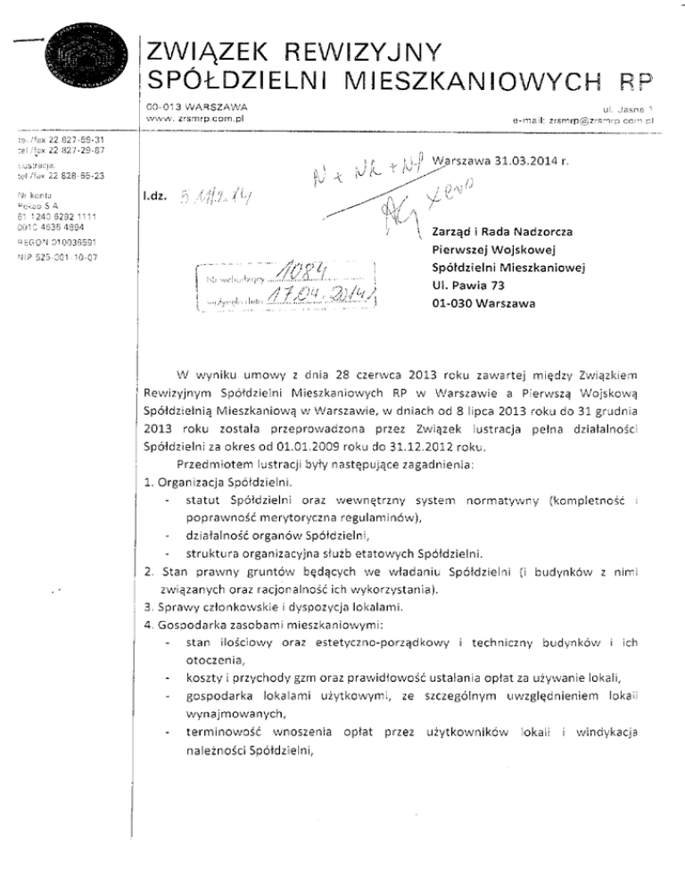 ZWIAZEK R EWIZYJ NY SPOt-DZIELI\I M IESZKANIOWYCl-fl OO, 01 3 WARSZAWA wllrw ZfSmrp corr.pl e-ma li zf RP ! Jaslra snrfi(dzrs-rf fi ccrf t. it.r 22 B2l 69-31 :e tJN 22 Il21-29 B7 rszawa 31,03,2014 r, rrl lidx 22 828 65-23 /"' | Dl(ira S,1 e't ', ?.4N 6292 1111 t01i a t(i0 'i l.,t t' l. t v- 4635 4894 \ \ i,111.036591 fl ir 52ii c01 o'r; ,.rrqa i Rada Nadzorcza Pierwszej Wojskowej 10.07 , ,,t,, r,,,,',r- Sp6tdzielni Mieszkaniowej (/(/' (| Ul. Pawia 73 01-030 Warszawa W wyniku umowy z dnia 28 czerwca 2013 roku zawartej miqdzy Zwiqzkiem Rewizyjnym Sp6tdzielni Mieszkaniowych RP w Warszawie a PierwszE Wojskowq Spoldzielniq Mieszkaniowq w Warszawie, w dniach od 8lipca 2013 roku do 31 grudnia 2013 roku zostala przeprowadzona przez Zwiqzek lustracja pelna dziaialnodc Sp6ldzielniza okres od 01,01,2009 roku do 31.12.2012 roku, Przedmiotem lustracji by'iy nastQpujEce zagadnienia I 1. Organizacja Spdld z ie In i, - statut Spotdzielni oraz wewnqtrzny system normatywny (kompletno(i i pop rawnoSi merytoryczna regu lam in6w), - dz iala In oii organow Sp6idzielni, struktura organizacyjna slu2b etatowych Spoidzielni, 2, Stan prawny grunt6w bqdEcych we w'ladaniu Sp6tdzielni (i budynk6w z nimi zwiqzanych oraz racjonalno5c ich wykorzystania), 3, Sprawy czlonkowskie i dyspozycja lokalami, 4. Gospodarka zasobami mieszkaniowymi: - stan ilo6ciowy oraz estetycz - n o- porz qd kowy i techniczny budynk6w i ich otoczenia, koszty i przychody gzm oraz prawid'towodc ustalania optat za u2ywanie lokali, gospodarka lokalami uzytkowymi, ze szczegolnym uwzglqdnieniem lokaii wynajmowanych, - terminowo6i wnoszenia op'fat przez u2ytkownikdw lokali nale2noici Sp old zie In i, i windykacja p - treii um6w o ustugi komunalne 5mieci, cieplo iich realizacja (wodno-kanalizacyjne, wywoz ), 5. Gospodarka remontowa w zasobach mieszkaniowych: - nadz6r techniczny i ustalanie potrzeb remontowych, ze szczegolnym uwzglqdn ien iem dziatan energooszczqdnych. - akumulacja 6rodkow finansowych na remonty, tryb doboru wykonawcow rob6t remontowych, tredi zawartych umow i ich realizac.ja. 6. G oso od a rka finansowa: - stan funduszy, wielkoSi wolnych Srodkdw finansowych i sposdb ich wykorzystania, efektywnoSi zaanga2owania finansowego Spoldzielni w zakup akcji lub udzial6ww innych podmiotach gospodarczych, - rozliczanie koszt6w o96lnych Spdtdzielni, obstuga splaty kredytow mieszkaniowych, terminowo(c regulowania zobowiqzari finansowych Sp6ldzielni (podatki, ZUS, PFRON). 7, dochodzenie nale2no6ci Sp6ldzielni, w tym dotacji bud2etowych, rozliczenie finansowe z czlonkami z tytulu wktad6w. Ocena realizacji przez Spoidzielniq obowiqzkdw wynikajqcych spoldzielniach m ieszka z ustawy o nlowych, 8, Zbadanie zagadnied dodatkowych ujqtych w skardze Komitetu Domowego. Ustalenia lustracji wynikajq ze stwierdzonych faktow na podstawie przedto2onych lustratorom dokument6w oraz wyja5nieri zlo2onych przez cztonk6w Tarzqdu i podlegtych im pracownik6w Sp6ldzielni, W szczeg6lno6ci ustaleniom lustracji stuiyly; - statut iinne unormowania wewnqtrzne Sp6ldzielni, uchwaly idecyz.je organow samorzqdowych, dokumenty czto n kows kie, dokumentacja dotyczqca robot remontowych, ewidencjafinansowo-ksiqgowa. Ustalenia lustracji zostaly zawarte w protokole lustracji, ktory tqcznie z niniejszym listem polustracyjnym stanowi integralnq ca'lo(i. Protok6l lustracji zostat podpisany przez Zarzqd Sp6ldzielni bez zastrzeieh. W wyniku badania ustalono, 2e Spotdzielnia nie przestrzega terminowo(ci poddawania siq badaniu lustracyjnemu okreSlonej w art, 91. ustawy Prawo spoldzielcze. Poprzednie badanie lustracyjne Sp6'ldzielni odbylo siq bowiem w 2009 r, i objqlo swoim zakresem lata 2006-2008. W wyniku lustracji do Spotdzielni zostata sklerowana ocena polustracyjna wraz z wnioskami, ktore zostaly om6wione na Walnym Zgromadzeniu Cztonkow w 2010 r. Sp6ldzielnia dziatala w lustrowanym okresie w oparciu o statut uchwalony w 2007 r., a znowelizowany w 201.0 r,, 201.1. r. i 201-2 r. Statut ten zosta.l dostosowany do aktualnych rozwiqzan prawnych obowiEzujEcych sp6ldzielnie mieszkaniowe. Sp6ldzielnia posiada opracowane iwdro2one, wymagane statutem iwynikajqce jej potrzeb, normy wewnqtrzne o charakterze regulaminowym, Unormowania te z sE i poprawne merytorycznie, a takze zosta.ly ucnwarone przez organy uprawnione. lednak2e czq6c z tych norm wymaga analizy w kierunku petnej zgodno(ci kompletne wszystkich ich postanowien z obowiqzujqcymi przepisami prawa. w W badanym okresie w Spdldzielni funkcjonowaly wszystkie organy wymienione jej statucie, tj, Walne Zgromadzenie, Rada Nadzorcz a, Zarzad oraz Komitetv Do mowe, W zakresie prawidlowo6ci obrad Walnego Zgromadzenia lustracja ustalita, i2 czlonkowie Spdldzielni o terminie i miejscu Walnego Zgromadzenia zawiadamiani byli z zachowaniem ustawowego terminu, w spos6b przewidziany w statucie. Walne zajmowalo siq najistotniejszymi sprawami dotyczqcymi dziatalnodci Sp6ldzielni, a dokumentacja z obrad tego organu byta kompletna i prawidtowo przechowywana, Podejmowane uchwaly mie6ci.ly siq w ramach kompetencji tego organu okre6lonych przepisami ustawy i postanowieniami statutu. Lustracja nie wykazata uchybieri i iep rawidtowoSci od noin ie czqstotliwoici, terminowo6ci isposobu zwotania ob ra d. W 2010 r. odbyly siq wybory sk.ladu Rady Nadzorczej na kadencjq 2010-2013. W wyniku lustracji stwierdzono zgodno(i dokonanych wyborow z postanowieniami ustawy i statutu. W badanym okresie Rada Nadzorcza zgodnie z zakresem swoich n siq najistotniejszymi sprawami zwiqzanymi z bieiqcq dzialalno(ciq Sp6ldzielni wypelniajqc funkcje kontroli i nadzoru, a dokumentacja pracy teSo organu jest kompletna iwla5ciwie archiwizowana. Czqstotliwo5i posiedzen Rady byla zgodna z wymogami regulaminowymi. Rada wy.lonila ze swojego grona trzy komisje tj, Komisjq Rewizyjna, Komisjq Gospodarczq oraz Komisjq Czlonkowsko- kompetencji zajmowata Mieszkaniowq. Zarzqd bqdqcy organem wykonawczym w strukturze organow samorzadowych pelni'l jednoczeSnie rolq kierowniczq w bie2qcej dzialalno6ci Spotdzielni