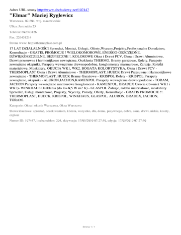 Adres URL strony http://www.abcbudowy.net/107447 "Elmar" Maciej Ryglewicz Warszawa, 02-804, woj. mazowieckie Ulica: Jastrzębia 25 Telefon: 602363126 Fax: 226431214 Strona www: http://thermoplast.com.pl 17 LAT DZIAŁALNOŚCI Sprzedaż, Montaż, Usługi;. Oferty,Wyceny,Projekty,Profesjonalne Doradztwo, Konsultacje - GRATIS, PROMOCJE ! WIELOKOMOROWE, ENERGO-OSZCZĘDNE, DŻWIĘKOSZCZELNE, BEZPIECZNE !, KOLOROWE Okna i Drzwi PCV, Okna i Drzwi Aluminiowe, Drzwi przesuwne i harmonijkowe zewnętrzne, Oszklenia THERMO, Bramy garażowe, Rolety, Parapety zewnętrzne okapniki, Parapety wewnętrzne drewnopodobne, konglomeraty marmurowe, Żaluzje, Roletki materiałowe, Moskitiery, OKUCIA WK1, WK2. BOGATA KOLORYSTYKA, Okna i Drzwi PCV THERMOPLAST Okna i Drzwi Aluminiowe - THERMOPLAST, HUECK Drzwi Przesuwne i Harmonijkowe zewnętrzne - THERMOPLAST, HUECK Bramy Garażowe - KRISPOL Rolety - KRISPOL Parapety zewnętrzne, okapniki - ALURON,JACHON,KAMEXPOL Parapety wewnętrzne drewnopodobne - TORAM, JACHON Parapety wewnętrzne marmurowe konglomerat - KAMEXPOL, BRADEX Okucia (również WK1 i WK2)- WINKHAUS Oszklenia (do U= 0,5 W m2 K) - GLASPOL Żaluzje, roletki materiałowe, moskitiery Sprzedaż, Usługi montażowe, Projekty, Wyceny, Porady, Oferty, Konsultacje - GRATIS PROMOCJE !!. THERMOPLAST, HUECK, KRISPOL, WINKHAUS, GLASPOL, ALURON, BRADEX, JACHON, TORAM. Kategorie: Okna i okucia Warszawa, Okna Warszawa Słowa kluczowe: sprostać, oczekiwaniom, klienta, wszystko, dla, domu, pasywnego, dobre, okna, drzwi, niskie, koszty, exploat Numer ID: 107447, liczba odsłon: 204, aktywacja: 17/05/2010 07:27:50, edycja: 17/05/2010 07:27:50 Strona 1 / 1