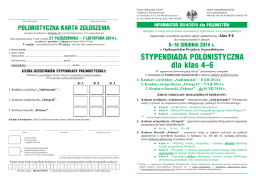 .................................................................. .................................................................. (pieczątka szkoły) (miejscowość, data) POLONISTYCZNA KARTA ZGŁOSZENIA (dostępna do pobrania w formacie A4 na stronie Organizatora: www.stypendiada.pl) Firma Edukacyjna „Orzeł” I Oddział w Skierniewicach ul. Trzcińska 21/23, 96-100 Skierniewice tel./fax 46/831-01-66 tel. kom. 798-760-266 INFORMATOR 2014/2015 dla POLONISTÓW (dostępny w wersji pdf na stronie internetowej Organizatora: www. stypendiada.pl) Zapraszamy wszystkich uczniów szkoły podstawowej z klas do wzięcia udziału w dniach 27 PAŹDZIERNIKA – 7 LISTOPADA 2014 r. Kartę zgłoszenia należy wysłać w dniach na jeden z 3. sposobów: I./ faksem pod numer 46/831-01-66, II./ mailem – [email protected] lub III./ pocztą – decyduje data stempla pocztowego. kod pocztowy ............................................................ poczta ............................................................................. województwo ......................................................................... telefon .............. / - .............. - ........... - ........... LICZBA UCZESTNIKÓW STYPENDIADY POLONISTYCZNEJ: kl. 5 w Ogólnopolskim Projekcie Stypendialnym: STYPENDIADA POLONISTYCZNA dla klas 4–6 W tegorocznej innowacyjnej edycji1) proponujemy zmagania w następujących konkursach tematycznych z zakresu edukacji polonistycznej: (Minimum 12 uczestników, łącznie z klas 4-6, w dowolnie wybranym konkursie lub w dowolnie wybranych konkursach.) kl. 4 4-6 8–16 GRUDNIA 2014 r. 1. Nazwa szkoły ..................................................................................................................................................... 2. Adres szkoły: miejscowość .............................................................. ulica/numer .................................................................... e-mail: [email protected] www.stypendiada.pl NIP 836-101-99-24 REGON 140813170 kl. 6 1. Konkurs czytelniczy „Vademecum” – 1. Konkurs czytelniczy „Vademecum” – 8 XII 2014 r. 2. Konkurs ortograficzny „Ortograf” – 9 XII 2014 r. 3. Konkurs literacki „Polonus” – do 16 XII 2014 r. Zakres tematyczny poszczególnych konkursów: 1. Konkurs czytelniczy „Vademecum” – temat przewodni: „Ahoj przygodo!”. W konkursie należy wykazać się znajomością treści następującego (jednego) utworu literackiego: ● klasa 4 – Jan Brzechwa „Akademia Pana Kleksa” ● klasa 5 – Edmund Niziurski „Niewiarygodne przygody Marka Piegusa”2) ● klasa 6 – Adam Bahdaj „Wakacje z duchami”3) 2. Konkurs ortograficzny „Ortograf” – 3. Konkurs literacki „Polonus” – 2-3) Utwory dostępne do przeczytania w wersji pdf na stronie internetowej Organizatora: www.stypendiada.pl Szkolny Koordynator: (Imię i nazwisko prosimy wpisać drukowanymi literami.) .................................................. /imię/ ............................................................ .................................................. /nazwisko/ /telefon prywatny/ Liczba uczniów → biorących udział w trzech konkursach. → Liczba pozostałych nauczycieli przygotowujących uczniów do poszczególnych konkursów (realizatorów Projektu Stypendialnego). ................................................................................................. (czytelny podpis Szkolnego Koordynatora lub pieczątka Dyrektora Szkoły) Numer konta bankowego Rady Rodziców, na które zostaną przelane środki na stypendia naukowe: - - - - - - /Prosimy wpisać – BRAK KONTA – w przypadku nieposiadania przez Radę Rodziców konta bankowego./ 2. Konkurs ortograficzny „Ortograf” – sprawdza w poszczególnych klasach 4-6 znajomość następujących reguł ortograficznych: ● u – ó, ż– rz, h – ch 3. Konkurs literacki „Polonus” – uczniowie mają za zadanie wykonać na podłożu papierowym o dowolnym kształcie, w formacie A3, A4 lub A5, techniką dowolną, pracę literacko-plastyczną na podany temat: ● klasa 4 – Wykonaj własną, oryginalną i zabawną okładkę dowolnej książki przygodowej lub baśni. ● klasa 5 – Przygotuj, w imieniu samorządu uczniowskiego, indywidualne zaproszenie na szkolne jasełka adresowane do Twoich rodziców. ● klasa 6 – Zaprojektuj plakat reklamujący koncert swojego ulubionego piosenkarza, piosenkarki lub zespołu muzycznego. 1) Zmiany w tegorocznej Stypendiadzie Polonistycznej zostały podyktowane kontynuacją procesu dostosowywania stopnia trudności poszczególnych konkursów do: 1. wieku uczestników, 2. możliwości edukacyjnych dzieci, 3. obowiązujących treści programowych i dotyczą w szczególności konkursu ortograficznego. REGULAMIN Konkurs czytelniczy trwa 45 minut. Ma charakter testu wyboru. Test zawiera łącznie 20 zadań zamkniętych i składa się z 4 części: A, B, C, D liczących po 5 zadań. Do każdego z 20. zadań podano cztery odpowiedzi: A, B, C, D. Karta odpowiedzi jest wkomponowana w arkusz konkursowy. Składa się z pięciu okienek: A, B, C, D, E. Uczeń zamalowuje na karcie odpowiedzi, pod numerem danego zadania, zawsze tylko jedno okienko: A, B, C lub D, jeżeli w danym zadaniu wystąpi jedna prawidłowa odpowiedź, E – jeżeli w zadaniu stwierdzi więcej niż jedną prawidłową odpowiedź lub jej brak. Konkurs ortograficzny trwa 45 minut. Arkusz zawiera łącznie 20 zadań otwartych podzielonych na cztery części (po 5 zadań każda): część A – krzyżówka, część B – zagadki ortograficzne, część C – fabryka wyrazów, część D – dyktando z lukami. Konkurs literacki trwa do 75 minut, odbywa się w szkole, a uczniowie przystępujący do konkursu winni uprzednio przygotować materiały oraz przybory niezbędne do wykonania danej pracy: okładki, zaproszenia, plakatu. Uwaga! Konkurs literacki może odbyć się w dowolnym terminie – nie później jednak niż do 16 g