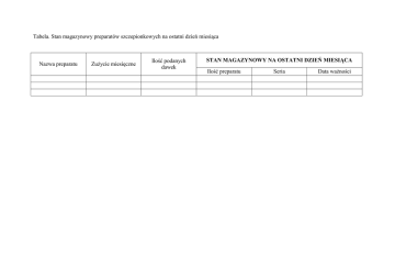 Tabela. Stan magazynowy preparatów szczepionkowych na ostatni dzień miesiąca Nazwa preparatu Zużycie miesięczne Ilość podanych dawek STAN MAGAZYNOWY NA OSTATNI DZIEŃ MIESIĄCA Ilość preparatu Seria Data ważności