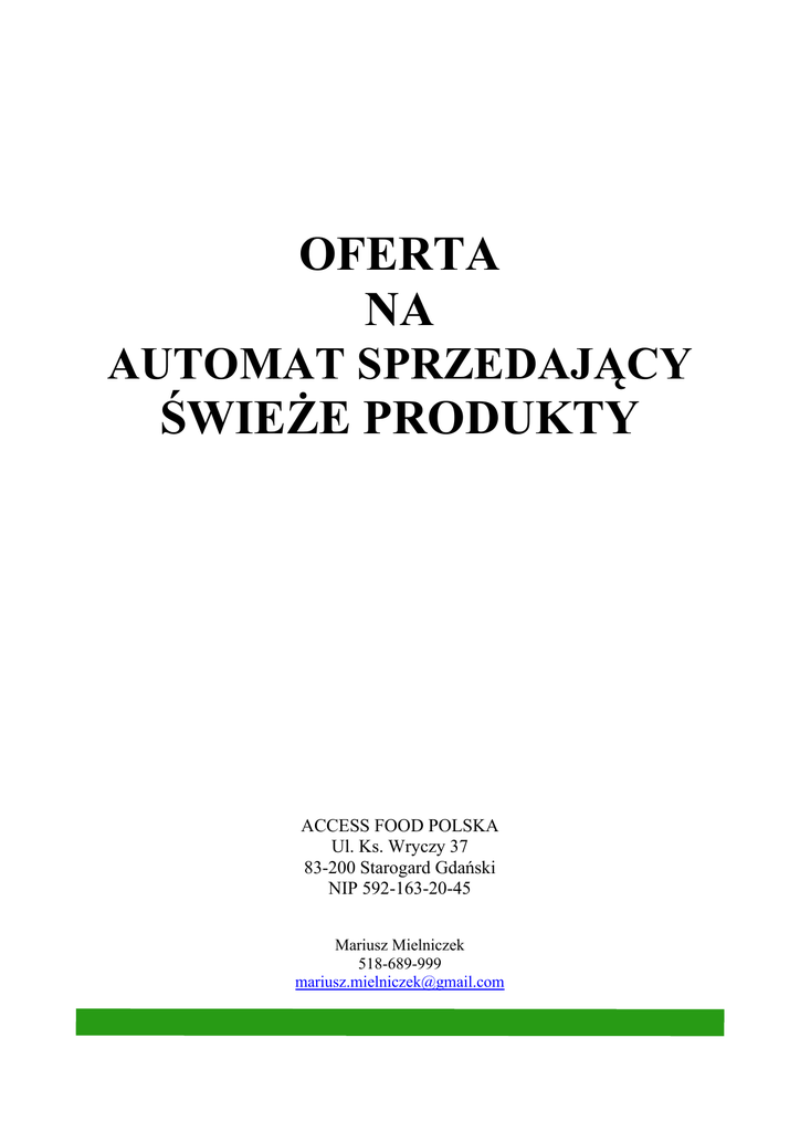 OFERTA NA AUTOMAT SPRZEDAJĄCY ŚWIEŻE PRODUKTY ACCESS FOOD POLSKA Ul. Ks. Wryczy 37 83-200 Starogard Gdański NIP 592-163-20-45 Mariusz Mielniczek 518-689-999 [email protected] Instalacja automatów vendingowych Firma "ACCESS FOOD POLSKA" zajmuje się instalacją i obsługą automatów vendingowych (czyli automatów sprzedających). W przypadku dysponowaniem lokalizacją, w której istnieje chęć wstawienia naszego automatu proszę śmiało o kontakt. Nasza firma postawiła na automat renomowanej firmy Necta Starfood. Wysokość 1830 mm Szerokość 850 mm Głębokość 900 mm Instalacja i serwis maszyny vendingowej jest bezpłatna. Pełna oferta produktów w automacie jest ustalana indywidualnie. Automat wydaje resztę z wrzuconych monet. Obsługa tego automatu jest intuicyjna, co pozwala zaoszczędzić czas i nerwy klientów. Produkty mogą być schłodzone do temperatury 4 stopni, przez co umieszczone tam sałatki i kanapki zachowują świeżość przez cały dzień. SPECJALNA OFERTA DLA SZKÓŁ PODSTAWOWYCH, GIMNAZJI, SZKÓŁ ŚREDNICH I UCZELNI WYŻSZYCH Proponujemy wstawienie automatu vendingowego ze świeżą i zdrową żywnością. Świeże produkty są codziennie wcześnie rano przygotowywane i dostarczane do automatu a menu sukcesywnie urozmaicane i zmieniane. Wśród produktów, które oferujemy w automacie znajdują się między innymi: - bułka z serem, szynką, tuńczykiem, kurczakiem i inne w cenie od 2,00 zł - tortilla z fetą, kurczakiem, gyrosem i inne w cenie od 4,50 zł - sałatka hawajska, z kurczakiem, z tuńczykiem i inne w cenie od 4,00 zł - świeże drożdżówki w cenie od 2,00 zł - paszteciki z mięsem, kapustą i grzybami w cenie od 2,00 zł - galaretki owocowe w cenie od 2,00 zł - owoce ( jabłka, banany, brzoskwinie) w cenie od 0,90 zł - rogalik 7days w cenie od 1,80 zł - woda 0,5l gaz/niegaz w cenie od 0,90 zł - napoje puszka 0,33 (pepsi, 7up, nestea) w cenie od 1,70 zł - napoje Tymbark 0,25 różne w cenie od 1,50 zł - soki Tarczyn 0,25 różne w cenie od 2,00 zł - batony (mars, snickers, twix, prince polo) w cenie od 1,60 zł Koszty związane z funkcjonowaniem automatu pokrywamy w całości na podstawie zawartej umowy i wystawionego rachunku, bądź w postaci darowizny dla szkoły, zakupu pomocy naukowych lub inne.