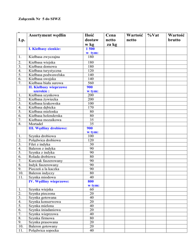 Załącznik Nr 5 do SIWZ Asortyment wędlin Ilość dostaw w kg I. Kiełbasy cienkie: 1 500 w tym: 180 Lp. 1. Kiełbasa zwyczajna 2. 3. 4. 5. 6. 7. Kiełbasa wiejska Kiełbasa domowa Kiełbasa turystyczna Kiełbasa podwawelska Kiełbasa swojska Kiełbasa biała surowa II. Kiełbasy wieprzowe szerokie : Kiełbasa szynkowa Kiełbasa Ŝywiecka Kiełbasa krakowska Kiełbasa dębicka Kiełbasa mielonka Kiełbasa holenderska Kiełbasa mozaikowa Mortadel III. Wędliny drobiowe: 1. 2. 3. 4. 5. 6. 7. 8. 1. 2. 3. 4. 5. 6. 7. 8. 9. 10. 11. Szynka drobiowa Polędwica drobiowa Filet z indyka Baleron z indyka Szynka z indyka Rolada drobiowa Kurczak faszerowany Indyk faszerowany Pieczeń a la kaczka Baleron indyczy Szynka miodowa IV. Wędliny wieprzowe: 1. 2. 3. 4. 5. 6. 7. 8. 9. 10. 11. Szynka wiejska Szynka pieczona Szynka gotowana Szynka konserwowa Szynka mielona Szynka śniadaniowa Szynka wieprzowa Szynka firmowa Szynka prasowana Baleron gotowany Polędwica sopocka 180 180 120 140 140 560 900 w tym: 200 200 100 170 80 80 35 35 900 w tym: 100 120 30 90 90 80 90 90 90 80 40 800 w tym: 60 20 40 20 40 20 40 80 20 20 40 Cena netto za kg Wartość %Vat netto Wartość brutto 12. 13. 14. 15. 16. 17. 18. 19. 20. 21. 22. 23. 24. 1. 2. Wędzonka krotoszyńska Łopatka prasowana Łopatka gotowana Łopatka pieczona Schab pieczony Boczek pieczony Boczek wędzony paski Boczek delikatesowy Boczek rolowany Podgardle wędzone Kark pieczony Rolada schabowa Ogonówka V. Salcesony: Salceson biały Salceson ozorkowy VI. Kaszanki : 1. 2. Kaszanka Kaszanka VII .Parówki : 1. 2. 3. 4. Parówki śląskie Parówki grube Parówkowa Serdelki VIII. Pasztetowa , pasztety, pieczenie : Pasztetowa drobiowa Pasztetowa wieprzowa Pasztetowa luksusowa Pasztet wieprzowy Pasztet drobiowy Pieczeń rzymska Pieczeń firmowa IX .Kości wędzone: Wartość ogółem netto i brutto: 1. 2. 3. 4. 5. 6. 7. 20 40 20 20 20 20 20 100 20 20 40 40 20 60 w tym: 30 30 300 w tym: 150 150 680 w tym: 150 130 300 100 660 w tym: 180 60 60 60 60 120 120 200 Podpis i pieczęć Wykonawcy: ………………………………………………………………………………………………………… ………………………………………………………………………………………………………… Miejscowość i data: …………………………………………………………………………………………………………