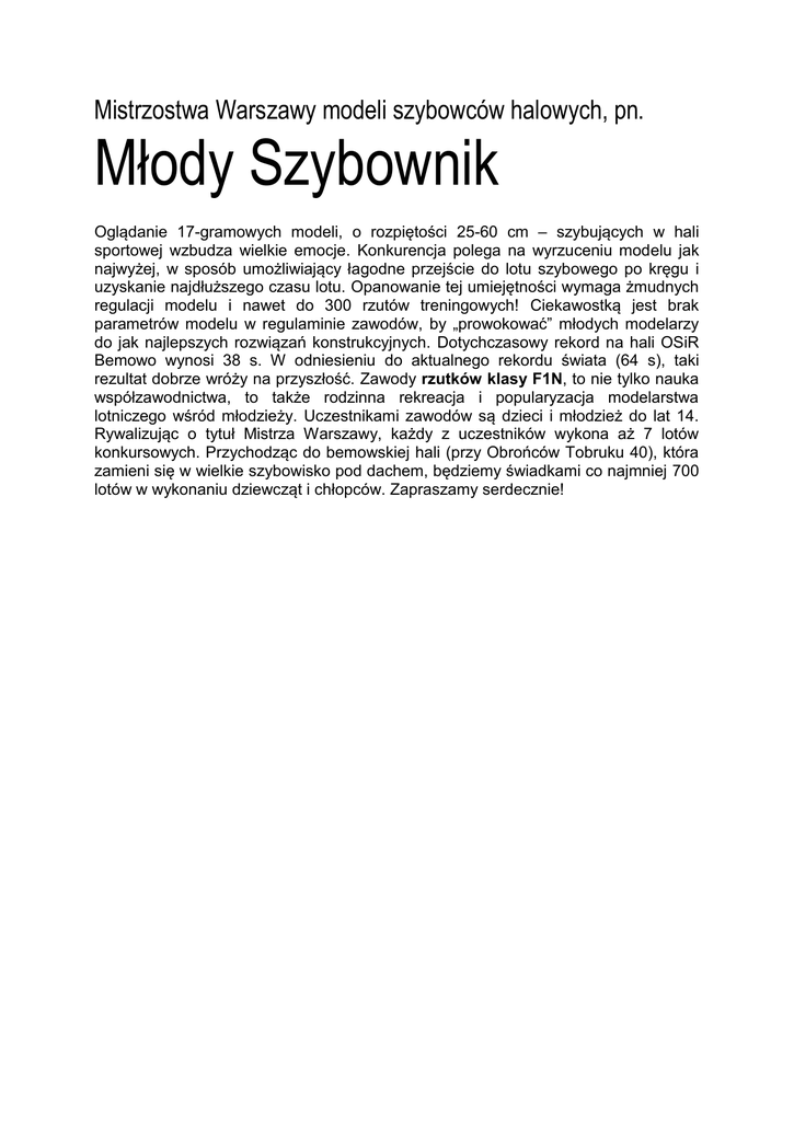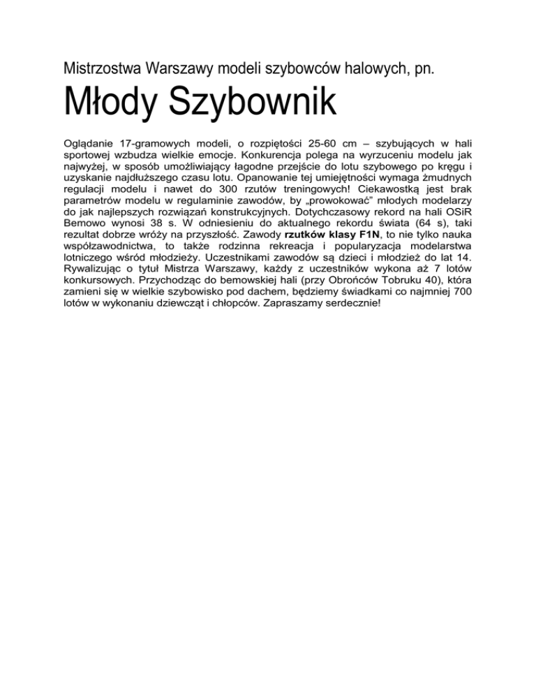 Mistrzostwa Warszawy modeli szybowców halowych, pn. Młody Szybownik Oglądanie 17-gramowych modeli, o rozpiętości 25-60 cm – szybujących w hali sportowej wzbudza wielkie emocje. Konkurencja polega na wyrzuceniu modelu jak najwyżej, w sposób umożliwiający łagodne przejście do lotu szybowego po kręgu i uzyskanie najdłuższego czasu lotu. Opanowanie tej umiejętności wymaga żmudnych regulacji modelu i nawet do 300 rzutów treningowych! Ciekawostką jest brak parametrów modelu w regulaminie zawodów, by „prowokować” młodych modelarzy do jak najlepszych rozwiązań konstrukcyjnych. Dotychczasowy rekord na hali OSiR Bemowo wynosi 38 s. W odniesieniu do aktualnego rekordu świata (64 s), taki rezultat dobrze wróży na przyszłość. Zawody rzutków klasy F1N, to nie tylko nauka współzawodnictwa, to także rodzinna rekreacja i popularyzacja modelarstwa lotniczego wśród młodzieży. Uczestnikami zawodów są dzieci i młodzież do lat 14. Rywalizując o tytuł Mistrza Warszawy, każdy z uczestników wykona aż 7 lotów konkursowych. Przychodząc do bemowskiej hali (przy Obrońców Tobruku 40), która zamieni się w wielkie szybowisko pod dachem, będziemy świadkami co najmniej 700 lotów w wykonaniu dziewcząt i chłopców. Zapraszamy serdecznie!