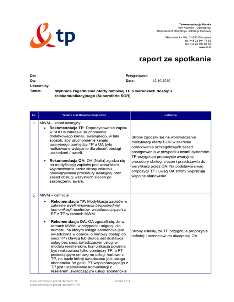 Telekomunikacja Polska Pion Klientów - Operatorów Departament Marketingu i Strategii Hurtowej Skierniewicka 10a, 01-230 Warszawa tel. +48 22 594 71 52 fax +48 22 594 61 90 www.tp.pl raport ze spotkania Do: Przygotował: Dw: Data: 12.10.2010 Uczestnicy: Temat: Wybrane zagadnienia oferty ramowej TP o warunkach dostępu telekomunikacyjnego (Superoferta SOR) Lp. 1. Tematy oraz Rekomendacje stron Ustalenia MWM - kanał awaryjny: · Rekomendacja TP: Doprecyzowanie zapisu w SOR w zakresie uruchomienia dodatkowego kanału awaryjnego, w taki sposób, aby uruchomienie kanału awaryjnego pomiędzy TP a OA było realizowane wyłącznie dla zleceń obsługi uszkodzeń / awarii. · Rekomendacja OA: OA (Netia) zgadza się na modyfikację zapisów pod warunkiem wypracowania przez strony zakresu obowiązywania procedury awaryjnej oraz zasad obsługi wszystkich zleceń po zakończeniu awarii. 2. Strony zgodziły się na wprowadzenie modyfikacji oferty SOR w zakresie opracowania szczegółowych zasad postępowania w przypadku awarii systemów. TP przygotuje propozycje awaryjnej procedury obsługi zleceń i przedstawiła do weryfikacji przez OA. Na podstawie uwag propozycji TP i uwag OA strony wypracują wspólne stanowisko. MWM – definicje · Rekomendacja TP: Modyfikacja zapisów w zakresie wyeliminowania bezpośredniej komunikacji reselerów współpracujących z PT z TP w ramach MWM · Rekomendacja OA: OA zgodzili się, że w ramach MWM, w przypadku migracji dla numeru, na którym usługa abonencka jest Strony ustaliły, że TP przygotuje propozycje świadczona w oparciu o hurtowy dostęp do definicji i przedstawi do akceptacji OA. sieci TP i Dawcą lub Biorcą jest dostawcą usług bez sieci, świadczącym usługi w modelu resellerskim, komunikacja powinna być realizowana tylko pomiędzy TP, a PT posiadającym umowę na usługi hurtowe z TP, na bazie której świadczona jest usługa abonencka. W gestii PT współpracującego z TP jest ustanowienie komunikacji z reselerem, świadczącym usługi abonenckie Dane chronione przed Detalem TP Dane chronione przed Detalem PTK Strona 1 z 4 na bazie jego umowy o hurtowym dostępie z TP. 3. MWM – terminy realizacji procesów oraz NP – terminy realizacji: · Rekomendacja TP: a) uspójnienie terminów realizacji procesów poprzez usunięcie zapisu dodanego w Rozdziale 4.4. pkt 11 oraz w Rozdziale 5.2.1 pkt 2. b) proces realizacji WLR na NP powinien być zaimplementowany w PLI CBD c) realizacja dostarczania usług regulowanych (w tym LLU z NP) powinna być realizowana zgodnie terminami MWM · Rekomendacja OA: a) OA zgodzili się, że proces realizacji WLR na NP powinien być zaimplementowany w PLI CBD b) według OA powinny zostać skrócone terminy dla dostarczania usług regulowanych z NP, a więc WLR , LLU (Uwaga UPC: W naszej opinii, rekomendacja OA była jednoznaczna, że terminy dla przeniesienia numeru (niezależnie od tego jak technicznie/regulacyjnie realizowany jest dostęp do sieci dla abonenta – WLR czy LLU) powinny być takie jak w RMI) Uwaga TP: Stanowisko nie było jednoznaczne (Netia wycofała się z LLU z NP) Strony ustaliły, że proces realizacji WLR na NP powinien być zaimplementowany w PLI CBD. Rozbieżność : TP i OA posiadają rozbieżne stanowiska w kwestii terminów dostarczania usługi LLU z NP. Stanowisko TP do pkt. b): zgodnie z ustaleniami z UKE dot. wdrożenia procesów w PLI CBD realizacja LLU z NP podlega pod wyłączenia wynikające z Rozdziału 4 ust. 11 RMI (odmowa realizacji NP dla Abonenta w terminie 7 DR wynika z braku infrastruktury w lokalizacji Abonenta) Załączona notatka z warsztatów w UKE 4. MWM - zasady realizacji procesów (milcząca zgoda i potwierdzanie z Dawcą) · Rekomendacja TP: a) Zastosowanie tzw. zgody milczącej b) uznanie braku wdrożenia MWM przez Dawcę jako brak woli uczestniczenia w procesie komunikacji z TP, akceptacja realizacji zamówienia zgodnie z trybem i terminem wskazanym przez Abonenta w Oświadczeniu przekazanym przez Biorcę do Dawcy przed zainicjowaniem procesu migracji do TP. Brak komunikacji "dodatkowej " w czasie trwania procesu z Dawcą, który nie podpisał MWM Alternatywnie c) TP proponuje aby informacja o dezaktywacji była przesyłana do Dawcy wyłącznie poprzez ISI oraz data Dane chronione przed Detalem TP Dane chronione przed Detalem PTK Strona 2 z 4 Strony ustaliły, że należy odpytać OA dlaczego nie chcą przystępować do MWM oraz, że komunikacja z Dawcą powinna być ograniczona do komunikatu o dezaktywacji w dniu realizacji zamówienia migracji a nie na wcześniejszych etapach (do 5 DR od daty wymaganej, może bowiem dojść do anulacji zamówienia). powiadomienia następowała po realizacji zamówienia, będzie to potwierdzenie dezaktywacji usługi , zgodnie z oświadczeniem jakie złożył Abonent za pośrednictwem Biorcy · 5. BSA – interfejsy PDU · · 6. Rekomendacja TP: Proponujemy uspójnienie zapisów dotyczących liczby interfejsów i pozostawienie jednego interfejsu 1GE w PDU na poziomie IP Zarządzany. Rekomendacja OA: Z uwagi na problemy techniczne związane z obciążeniem wielu interfejsów w PDU oraz z migracjami abonentów, operatorzy zgodzili się z propozycja TP, jednak zwrócili uwagę na konieczność zapewnienie rozwiązania problemu w przypadku pojawienia się przeciążenia interfejsu. RIO – rodzaje interfejsów · Rekomendacja TP: W przypadku wystąpienia OA o realizację Usługi RIO w oparciu o STM-1/4/16, takie zamówienie będzie realizowane jak występujący w SOR Tryb Połączenia Liniowego (TPL), który technicznie jest tożsamy z wymaganiami UKE. Opłaty będą pobierane zgodnie z TPL (demultipleksacja + wymagane porty E1). · 7. Rekomendacja OA: OA zgłosili zagrożenie wynikające z braku realizacji obowiązku przesyłania oświadczeń przez Biorcę do Dawcy i odpowiedzialności Biorcy wobec Dawcy. Rekomendacja OA : OA potwierdzili, że usługa RIO realizowana jest w oparciu o wiązki E1. OA zgodzili się z propozycja TP pod 