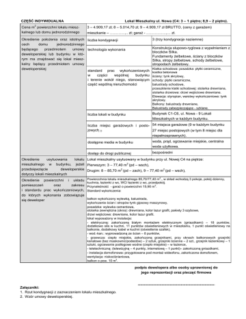 CZĘŚĆ INDYWIDUALNA 2 Cena m powierzchni lokalu mieszkalnego lub domu jednorodzinnego Lokal Mieszkalny ul. Nowa (C4: 3 – 1 piętro; 8,9 – 2 piętro). 3 – 4.909,17 zł; 8 – 5.014,70 zł; 9 – 4.909,17 zł BRUTTO, (ceny z garażem) mieszkanie – …………,.. zł; garaż - …………….,… zł. Określenie położenia oraz istotnych liczba kondygnacji cech domu jednorodzinnego będącego przedmiotem umowy technologia wykonania deweloperskiej lub budynku w którym ma znajdować się lokal mieszkalny będący przedmiotem umowy deweloperskiej standard prac wykończeniowych w części wspólnej budynku i terenie wokół niego, stanowiącym część wspólną nieruchomości liczba lokali w budynku 3 (trzy kondygnacje naziemne) Konstrukcja słupowo-ryglowa z wypełnieniem z bloczków Silka. Fundamenty żelbetowe, ściany z bloczków Silka, stropy żelbetowe, schody żelbetowe, stropodach żelbetowy. Klatka schodowa: posadzka: płytki ceramiczne, kostka betonowa ściany: tynk akrylowy, schody: płytki ceramiczne, balustrady schodowe, przeszklenie klatki schodowej: stolarka drewniana, stolarka drzwiowa: drzwi wejściowe drewniane. Elewacja: styropian, warstwy wykończeniowe: tynk akrylowy. Balkony: balustrady drewniane, Balustrady zabezpieczające - szklane. Budynek C1-C6, ul. Nowa - 9 Lokali Mieszkalnych w każdym budynku. liczba miejsc garażowych i posto- 54 miejsca garażowe (9 w każdym budynku jowych 27 miejsc postojowych (w tym 8 miejsc dla niepełnosprawnych). dostępne media w budynku woda, prąd, ogrzewanie miejskie, centralna woda użytkowa. dostęp do drogi publicznej bezpośredni Określenie usytuowania lokalu Lokal mieszkalny usytuowany w budynku przy ul. Nowej C4 na piętrze: mieszkalnego w budynku, jeżeli Pierwszym: 3 – 77,40 m2 (pd – wsch), przedsięwzięcie deweloperskie Drugim: 8 – 85,70 m2 (pd – zach), 9 – 77,40 m2 (pd – wsch), dotyczy lokali mieszkalnych Określenie powierzchni i układu pomieszczeń oraz zakresu i standardu prac wykończeniowych, do których wykonania zobowiązuje się deweloper Powierzchnia lokalu mieszkalnego 85,70/77,40 m2., w skład wchodzą 3 pokoje, pokój dzienny, kuchnia, łazienki z wc, WC/ łazienki z wc, przedpokój. Przynależność - garaż o powierzchni 15,90 m2. Standard wykończenia: balkon wykończony wylewką, balustrada, wykończenie ścian i stropów tynk gipsowy maszynowy, posadzka: wylewka cementowa, stolarka zewnętrzna (okna): drewniana, kolor lazur grafit, pakiety 3 szybowe, drzwi wejściowe: drewniane, kolor lazur grafit. lokal wyposażony w instalacje: - elektryczną: zakończoną białym montażem elektrycznym (gniazdkami) – 18 punktów, dodatkowo siła w kuchni, 11 punktów oświetleniowych w mieszkaniu, 1 punkt oświetleniowy na balkonie, dodatkowy kabel w kuchni (oświetlenie szafek), - wod.-kan.: wyprowadzoną ze ścian – 8 punktów, - grzewcza: ciepło miejskie, zakończoną grzejnikami, przy oknach balkonowych grzejniki kanałowe (bez maskownic/podestów) – 2 sztuk, grzejniki ścienne – 2 szt., grzejnik łazienkowy – 1 sztuki, ogrzewanie podłogowe wodne (ciepło miejskie) – w łazience, - teletechniczną: (telewizyjną – 4 punkty, internetową – 1 punkt)– zakończoną gniazdkami, - instalacja domofonowa: przygotowana pod montaż wideofonu, zakończona domofonem, wentylacja: niskociśnieniowa, balkon o pow. 10 m2. podpis dewelopera albo osoby uprawnionej do jego reprezentacji oraz pieczęć firmowa Załączniki: 1. Rzut kondygnacji z zaznaczeniem lokalu mieszkalnego. 2. Wzór umowy deweloperskiej.