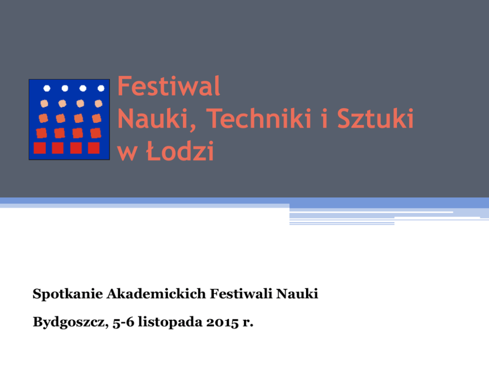 Festiwal Nauki, Techniki i Sztuki w Łodzi Spotkanie Akademickich Festiwali Nauki Bydgoszcz, 5-6 listopada 2015 r. Festiwal (FNTiS) - informacje ogólne Pierwszy odbył się w 2001 r. , w 2015 – 15 Czas trwania – 8 dni; kwiecień Partnerzy Festiwalu – MNiSW, Miasto Łódź Patronat medialny: TVP Łódź, Polskie Radio Łódź, „Dziennik Łódzki” Festiwal ma swój sygnał dźwiękowy i logo (znak) oraz hasło festiwalowe (co roku inne) Festiwal - organizatorzy Łódzkie Towarzystwo Naukowe (ŁTN) – rola przewodnia, koordynacja wszystkich działań, siedziba biura Festiwalu Uczelnie wyższe – UŁ, PŁ, UMed, ASP, AM, PWSFTviT, WSD w Łodzi Udział innych instytucji naukowych i kulturalnych m. in. instytuty n-b PAN, NOT, łódzkie muzea, Palmiarnia, ZOO, Ogród Botaniczny, Planetarium, niektóre uczelnie niepubliczne Wspierająca rola Konferencji Rektorów Państwowych Szkół Wyższych w Łodzi i Rady ds. Nauki i Szkolnictwa Wyższego przy Prezydencie Miasta Łodzi Festiwal - organizacja Działania koordynuje Komitet Organizacyjny w ŁTN Na uczelniach działają lokalne komitety organizacyjne Powoływany jest też Komitet Honorowy Ponad 1000 osób (pracowników naukowych, studentów z kół naukowych) zaangażowanych w przygotowanie merytoryczne i realizację imprez festiwalowych Festiwal – imprezy „centralne” Inauguracja z udziałem władz miejskich, wręczenie Statuetek „Łódzkie Eureka” dla wyróżnionych badaczy i artystów ze szkół wyższych w Łodzi Koncerty – inauguracyjny, wieczór chórów, koncerty kameralne (rola AM) Spektakl studentów PWSFTviT (zwykle na uroczystym zakończeniu Festiwalu) Wykład rektorski Festiwal - program Imprezy na uczelniach i w instytucjach naukowych i kulturalnych podzielone na bloki tematyczne Konferencje naukowe, wykłady, warsztaty, pokazy, mini-sympozja, dni otwarte, zwiedzania np. elektrociepłowni, muzeów, wycieczki z przewodnikami (parki łódzkie, okolice Łodzi) Konkurs piosenki dla uczniów szkół gimnazjów i szkół ponadgimnazjalnych Specjalny program dla seniorów (UMedŁ) PIKNIK NAUKOWY na rynku Manufaktury w Łodzi Festiwal - promocja Strona internetowa - www.festiwal.lodz.pl Fan page Festiwalu na Facebooku Program festiwalu dostępny jest w formie elektronicznej na www Festiwalu oraz jest drukowany w formie dodatku do gazety „Dziennik Łódzki” Kalendarze, plakaty, ulotki promujące Festiwal oraz poszczególne imprezy festiwalowe Informacja o Festiwalu przesyłana jest drogą mailową do wszystkich szkół i przedszkoli oraz do różnych instytucji oświatowych i kulturalnych w województwie łódzkim Dziękuję za uwagę