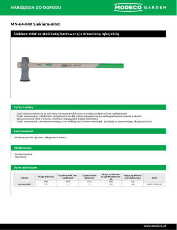 NARZĘDZIA DO OGRODU MN-64-040 Siekiera-młot Siekiera-młot ze stali kutej hartowanej z drewnianą rękojeścią Cechy i zalety • • • • Część robocza wykonana ze stali kutej, hartowana indukcyjnie co zwiększa odporność na rozklepywanie Dzięki zastosowanej tulei klinowi narzędzie jest bardzo dobrze zabezpieczone przed wypadnięciem trzonka z obucha Specjalny kształt klina w obuchu umożliwia rozłupywanie dużych elementów Dzięki zastosowaniu drewna jesionowego trzon siekiery jest zarówno twardy jak i sprężysty co zapewnia jego długą żywotność Zastosowanie • Przeznaczona do rąbania i rozłupywania drewna Użytkownicy • Majsterkowicze • Ogrodnicy Dane techniczne Indeks MN-64-040 Waga siekiery Opakowanie jed nostkowe Opakowanie zbiorcze Waga opakowa nia jednostkowe go Waga opakowa nia zbiorczego [kg] [szt] [szt] [kg] [kg] 2.5 1 5 2.8 13.8 EAN 5906757909281 www.modeco.pl NARZĘDZIA DO OGRODU Ostrzeżenia • • • • Zawsze używaj ubrań ochronnych (kombinezon, ogrodniczki, kurtka) Zawsze używaj ochrony oczu (okulary, gogle lub przyłbice ochronne) Zawsze używaj ochrony rąk (rękawice) Zawsze używaj ochrony nóg (buty robocze) www.modeco.pl