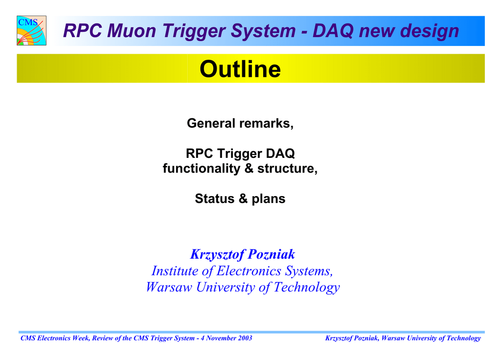 C M S R P C M u o n T r ig g e r S y s te m - D A Q n e w d e s ig n O u tlin e G e n e ra l re m a rk s , R P C T r ig g e r D A Q fu n c tio n a lity & s tr u c tu r e , S ta tu s & p la n s K r z y s z to f P o z n ia k In s titu te o f E le c tr o n ic s S y s te m s , W a r s a w U n iv e r s ity o f T e c h n o lo g y C M S E le c tr o n ic s W e e k , R e v ie w o f th e C M S T r ig g e r S y s te m - 4 N o v e m b e r 2 0 0 3 K r z y s z to f P o z n ia k , W a r s a w U n iv e r s ity o f T e c h n o lo g y C M S R P C M u o n T r ig g e r S y s te m - D A Q n e w d e s ig n R a te o f h its fo r a s in g le b u n c h c r o s s in g M B 4 M E 1 M E 2 M E 3 M E 4 B A R R E L M B 3 M B M B 2 _ 1 2 _ 2 [c m ] 7 0 0 0 .0 0 .0 0 .0 0 .0 0 .1 0 1 0 5 1 0 5 0 0 0 h it h it h it h it h it s /b s /b s /b s /b s /b x /c x /c x /c x /c x /c h a h a h a h a h a m b m b m b m b m b e r e r e r e r e r 6 0 0 5 0 0 4 0 0 M B 1 _ 1 M E 1 _ 2 3 0 0 M E 0 2 0 0 1 0 0 E N D C A P 0 in te r a c tio n p o in t 2 0 0 T r ig g e r a lg o r ith m is b a s e d T h e h its a r e tr a n s m itte T h e (d iffe r e n c e 4 0 0 o n m d fr o h its o f tw u o m ra o C M S E le c tr o n ic s W e e k , R e v ie w o f th e C M S T r ig g e r S y s te m 6 0 0 n tr a c k p a tte th e d e te c to r te d is tr ib u tio o rd e rs o f m a 8 0 0 rn re to th n is n g n itu - 4 N o v e m b e r 2 0 0 3 c o g n itio n e c o u n tig o t h o m o g d e fr o m D 1 0 0 0 1 2 0 0[c m ] w ith h its fr o m R P C c h a m b e r s . r o o m b y fib r e o p tic lin k s . e n e o u s = 0 to D = 2 .1 ) . K r z y s z to f P o z n ia k , W a r s a w U n iv e r s ity o f T e c h n o lo g y C M S R P C M u o n T r ig g e r S y s te m - D A Q n e w d e s ig n R P C c h a m b e r s g r o u p p in g fo r o p tic a l lin k s M B 4 M E 1 M E 2 M E 3 [c m ] 7 0 0 M E 4 B A R R E L 1 R P C c h a m b e r p e r 1 lin k 2 R P C c h a m b e r s p e r 1 lin k 3 R P C c h a m b e r s p e r 1 lin k 6 0 0 M B 3 5 0 0 M B 2 _ 1 M B 2 _ 2 M B 1 _ 1 M E 1 _ 2 4 0 0 3 0 0 M E 0 2 0 0 1 0 0 E N D C A P 0 in te r a c tio n p o in t 2 0 0 4 0 0 6 0 0 8 0 0 1 0 0 0 1 2 0 0 [c m ] C o m p r e s s io n a lg o r ith m e x p lo its lo w o c c u p a n c y o f th e R P C c h a m b e r s In h o m o g e n e o u s d is tr ib u tio n o f th e r a te im p lie s th a t m o r e lin k s is r e q u ir e d fo r th e a r e a s o f h ig h h it r a te D u e to c o m p e s s io n , th e n u m b e r o f o p tic a l lin k s is r e d u c e d b y a fa c to r o f s ix a t le a s t C M S E le c tr o n ic s W e e k , R e v ie w o f th e C M S T r ig g e r S y s te m - 4 N o v e m b e r 2 0 0 3 K r z y s z to f P o z n ia k , W a r s a w U n iv e r s ity o f T e c h n o lo g y C M S R P C M u o n T r ig g e r S y s te m R P C D A Q - D A Q n e w d e s ig n b a s e d o n c o m p re s s e d d a ta IN P U T - D A T A C O M P R E S S IO N - T R A N S M IS S IO N D 2 3 D 2 2 D 2 1 D 2 0 D 1 9 D 1 8 D 1 7 D 1 6 D 1 5 D 1 4 D 1 3 D 1 2 D 1 1 D 1 0 D 9 D 8 D 7 D 6 D 5 D 4 D 3 D 2 D 1 D 0 - P A C K E T D E C O M P R E S S IO N P 5 D A T A B U F F E R M E M O R Y P 4 D E R A N D O M IZ A T IO N P R O C E S S P 3 p a c k e t P 2 p a c k e t p a c k e t 4 0 1 2 3 5 2 2 1 0 1 0 b x = 5 b x = 4 P 0 b x = 2 b x = 1 rt m la lu itio n b e r y e d a ta o f p a r titio n P 1 b x = 3 p a n u d e v a b x = 3 b x = 2 b x = 1 b x = 0 m a x im u m p a c k e t le n g th fo r m a x im u m d e la y v a lu e = 3 p a c k e t p a c k e t p a c k e t 4 0 1 2 3 5 2 2 1 0 1 0 b x = 5 b x = 4 b x = 3 b x = 2 b x = 1 b x = 0 b x = 0 L 1 A c c e p t E x a m p le fo r 2 O n ly n o n -e m p ty p a r titio n s a r e s e n t. T h e P a c k e t d e c o m p r e s s o r s e le c ts p a c k e T h e 4 -b it d a ta w p a r titio n s w ts fr o m d a ta s e le c te d p a C M S E le c tr o n ic s W e e k , R e v ie w o f th e C M S T r ig g e r S y s te m o rd . D ith a d s tr e a m c k e ts a a ta e la y c o re s w o g r rre to r - 4 N o v e m b e r 2 0 0 3 r d is d iv id e d in to e a te r th a n a llo w e s p o n d in g to th e b e d in d a ta b u ffe r s ix 4 -b it p a r titio n s d m a x . v a lu e w ill b e lo s t ( w o r s t c a s e < 0 .5 % ) . u n c h c r o s s in g g iv e n b y L 1 A c c e p t s ig n a l. m e m o ry . K r z y s z to f P o z n ia k , W a r s a w U n iv e r s ity o f T e c h n o lo g y C M S R P C M u o n T r ig g e r S y s te m R P C D A Q L in k B o a r d s - D A Q n e w fu n c tio n a l s tr u c tu r e S p litte r s R e a d o u t C o n c e n tra to r E C A L - D C C b o a rd G lo b a l D a ta A c q u is itio n F E B o a rd s C h a m b e rs R e a d o u t R P C d e s ig n L d e m u x 's P a c M a tr ix S o r tin g tr e e S o r tin g T r e e T r ig g e r G h o s t B u s te r E ta G lo b a l M u o n T r ig g e r G h o s t B u s te r P h i T r ig g e r B o a r d s R P C R e a d o u t S y s te m u s e s th e s a m e c o m p r e s s e d d a ta p a c k e ts a s T r ig g e r S y s te m . S in g le R e a d o u t C o n c e n tr a to r is p la c e d o n e a c h T r ig g e r B o a r d . E C A L D C C b o a r d is u s e d a s M a in R e a d o u t C o n c e n tr a to r . C M S E le c tr o n ic s W e e k , R e v ie w o f th e C M S T r ig g e r S y s te m - 4 N o v e m b e r 2 0 0 3 K r z y s z to f P o z n ia k , W a r s a w U n iv e r s ity o f T e c h n o lo g y C M S R P C M u o n T r ig g e r S y s te m - D A Q n e w d e s ig n T r ig g e r B o a r d R e a d o u t C o n c e n tr a to r S y n c h r. P A C S e c to r P ro c e s s o r P A C S e c to r P ro c e s s o r P A C S e c to r P ro c e s s o r V M E C o n tro l (J ta g , II) E tra x (o p tio n a l) V M E E th e rn e t G B , S o rte r R e a d o u t C o n c e n tra to r T lk 2 5 0 1 P A C S e c to r P ro c e s s o r R e a d o u t s u b s y s te m G O H D e d ic a te d F P G A c h ip (A lte r a C y c lo n e ) is u s e d fo r R e a d o u t C o n c e n tr a tio n o n T B . R e a d o u t c o n c e n tr a to r s e r v e s u p to 1 8 fib r e lin k s . G O L O p to h y b r id