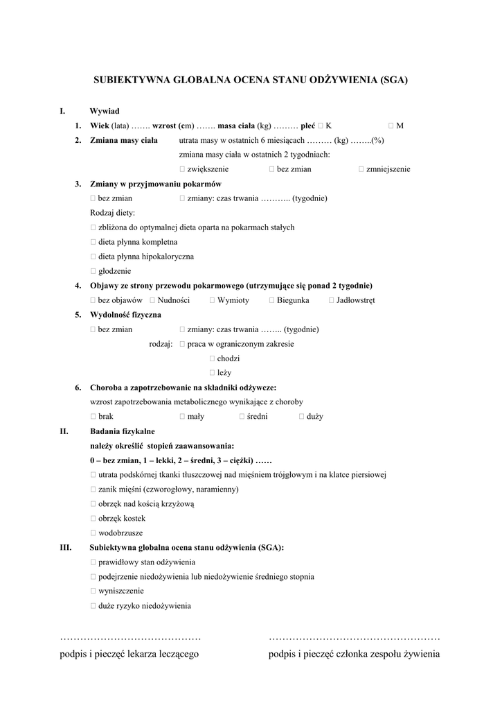 SUBIEKTYWNA GLOBALNA OCENA STANU ODŻYWIENIA (SGA) I. Wywiad 1. Wiek (lata) ……. wzrost (cm) ……. masa ciała (kg) ……… płeć K 2. Zmiana masy ciała M utrata masy w ostatnich 6 miesiącach ……… (kg) ……..(%) zmiana masy ciała w ostatnich 2 tygodniach: zwiększenie 3. bez zmian zmniejszenie Zmiany w przyjmowaniu pokarmów bez zmian zmiany: czas trwania ……….. (tygodnie) Rodzaj diety: zbliżona do optymalnej dieta oparta na pokarmach stałych dieta płynna kompletna dieta płynna hipokaloryczna głodzenie 4. Objawy ze strony przewodu pokarmowego (utrzymujące się ponad 2 tygodnie) bez objawów Nudności 5. Wymioty Biegunka Jadłowstręt Wydolność fizyczna bez zmian zmiany: czas trwania …….. (tygodnie) rodzaj: praca w ograniczonym zakresie chodzi leży 6. Choroba a zapotrzebowanie na składniki odżywcze: wzrost zapotrzebowania metabolicznego wynikające z choroby brak II. mały średni duży Badania fizykalne należy określić stopień zaawansowania: 0 – bez zmian, 1 – lekki, 2 – średni, 3 – ciężki) …… utrata podskórnej tkanki tłuszczowej nad mięśniem trójgłowym i na klatce piersiowej zanik mięśni (czworogłowy, naramienny) obrzęk nad kością krzyżową obrzęk kostek wodobrzusze III. Subiektywna globalna ocena stanu odżywienia (SGA): prawidłowy stan odżywienia podejrzenie niedożywienia lub niedożywienie średniego stopnia wyniszczenie duże ryzyko niedożywienia …………………………………… …………………………………………… podpis i pieczęć lekarza leczącego podpis i pieczęć członka zespołu żywienia