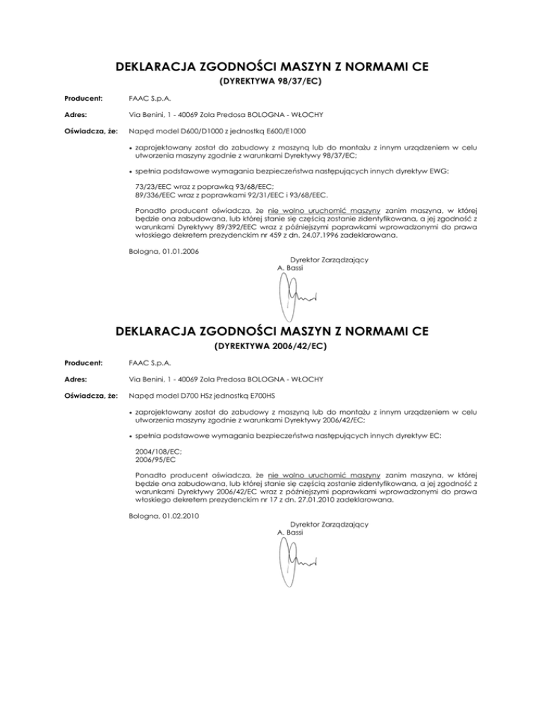 DEKLARACJA ZGODNOŚCI MASZYN Z NORMAMI CE (DYREKTYWA 98/37/EC) Producent: FAAC S.p.A. Adres: Via Benini, 1 - 40069 Zola Predosa BOLOGNA - WŁOCHY Oświadcza, że: Napęd model D600/D1000 z jednostką E600/E1000 zaprojektowany został do zabudowy z maszyną lub do montażu z innym urządzeniem w celu utworzenia maszyny zgodnie z warunkami Dyrektywy 98/37/EC; spełnia podstawowe wymagania bezpieczeństwa następujących innych dyrektyw EWG: 73/23/EEC wraz z poprawką 93/68/EEC; 89/336/EEC wraz z poprawkami 92/31/EEC i 93/68/EEC. Ponadto producent oświadcza, że nie wolno uruchomić maszyny zanim maszyna, w której będzie ona zabudowana, lub której stanie się częścią zostanie zidentyfikowana, a jej zgodność z warunkami Dyrektywy 89/392/EEC wraz z późniejszymi poprawkami wprowadzonymi do prawa włoskiego dekretem prezydenckim nr 459 z dn. 24.07.1996 zadeklarowana. Bologna, 01.01.2006 Dyrektor Zarządzający A. Bassi DEKLARACJA ZGODNOŚCI MASZYN Z NORMAMI CE (DYREKTYWA 2006/42/EC) Producent: FAAC S.p.A. Adres: Via Benini, 1 - 40069 Zola Predosa BOLOGNA - WŁOCHY Oświadcza, że: Napęd model D700 HSz jednostką E700HS zaprojektowany został do zabudowy z maszyną lub do montażu z innym urządzeniem w celu utworzenia maszyny zgodnie z warunkami Dyrektywy 2006/42/EC; spełnia podstawowe wymagania bezpieczeństwa następujących innych dyrektyw EC: 2004/108/EC; 2006/95/EC Ponadto producent oświadcza, że nie wolno uruchomić maszyny zanim maszyna, w której będzie ona zabudowana, lub której stanie się częścią zostanie zidentyfikowana, a jej zgodność z warunkami Dyrektywy 2006/42/EC wraz z późniejszymi poprawkami wprowadzonymi do prawa włoskiego dekretem prezydenckim nr 17 z dn. 27.01.2010 zadeklarowana. Bologna, 01.02.2010 Dyrektor Zarządzający A. Bassi