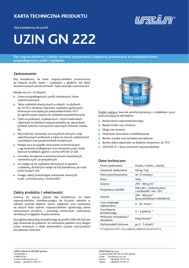 KARTA TECHNICZNA PRODUKTU Klej kontaktowy do profili UZIN GN 222 Klej rozpuszczalnikowy o bardzo wysokiej wytrzymałości połączenia, przeznaczony do przyklejania listew przypodłogowych, profili i wykładzin Zastosowanie: Klej kontaktowy na bazie rozpuszczalników przeznaczony do klejenia profili, listew i wykładzin z gładkimi lub lekko strukturowanymi powierzchniami. Tylko wewnątrz pomieszczeń. Nadaje się m.in. do klejenia: ÷ Listew przypodłogowych, profili schodowych, listew wykończeniowych ÷ Także wykładzin elastycznych w rolkach i w płytkach, np. PCV/CV, linoleum, kauczuku, wykładzin, gumowych, korkowych oraz będących połączeniem korka i PCV (w ograniczonym stopniu do wykładzin polyolefinowych) ÷ ÷ Tylko na podłożach, wykładzinach i innych materiałach odpornych na działanie rozpuszczalników np. jastrychach, tynkach, betonie, tworzywach sztucznych, drewnie, metalu itp. Klej może być stosowany na wszystkich równych, wzgl. szpachlowanych podłożach, a także na starych wykładzinach i powłokach oraz powierzchniach metalowych. ÷ Nadaje się w przypadku stosowania na konstrukcjach z ogrzewaniem podłogowym oraz obciążania przez fotele biurowe na kółkach zgodne z norma DIN EN 12 529. ÷ normalne obciążenia w pomieszczeniach mieszkalnych, rzemieślniczych i przemysłowych ÷ nie nadaje się do wykładzin tekstylnych ze spodem z włókniny, do których nadaje się klej kontaktowy do ścian UZIN Fondur® GN ÷ Uwaga: należy przestrzegać wskazówek zawartych w pkt. „Ochrona pracy i środowiska”. Zalety produktu / właściwości: Gotowy do użycia, płynny klej kontaktowy na bazie rozpuszczalników, charakteryzujący się licznymi zaletami w zakresie techniki klejenia. Łatwo zapalność oraz uwalnianie się dużych ilości oparów rozpuszczalników ograniczają zakres zastosowania produktu i powodują konieczność zachowania określonych względów bezpieczeństwa. Szczególną zaletą kleju kontaktowego do profili UZIN GN 222 jest jego doskonała przydatność do nanoszenia pędzlem przy długim czasie otwartym, a także ekstremalnie wysoka wytrzymałość początkowa i końcowa. UZIN | A Brand of UFLOOR Systems Dieselstraße 3 D-89079 Ulm E-mail: [email protected] Telefax: +49 (0)731-409 72 1 Środek wiążący: kauczuk polichloroprenowy z dodatkiem żywic podwyższających siłę klejenia. ÷ Bardzo łatwe rozprowadzanie kleju ÷ Bardzo krótki czas schnięcia ÷ Długi czas otwarty ÷ Możliwość nanoszenia z butelek/puszek ÷ Bardzo wysoka wytrzymałość początkowa ÷ Bardzo dobra odporność na działanie temperatur do 75°C ÷ GISCODE S1 / duża zawartość rozpuszczalników Dane techniczne: Forma opakowania: Puszka / wiadro z blachy Zawartość opakowania: 0,6 kg, 5 kg Okres przechowywania: do 12 miesięcy Kolor: żółty Zużycie: 250 - 300 g /m2 Patrz pkt. „ Ochrona pracy i środowiska” min. 10oC 250 - 400 g/m2 (przy podwójnym nakładaniu) Temperatura obróbki: Zużycie: Czas wstępnego odparowania: Czas klejenia kontaktowego: Możliwość wchodzenia / obciążania: Wytrzymałość końcowa: 5 - 20 minut * 2 – 3 godziny * Natychmiast * po 2 - 3 dniach* * W temperaturze 20°C i przy względnej wilgotności powietrza 65 %. UZIN Polska Sp. z.o.o. ul. Jaworzyńska 287 | PL-59-220 Legnica E-Mail [email protected] Telefon +48 (0)76-723 91 50 Telefax +48 (0)76-723 91 51 UZIN GN 222 Przygotowanie podłoża: Ważne wskazówki: Podłoże musi być mocne i stabilne, bez spękań, suche, czyste i wolne od substancji mogących zmniejszać przyczepność. Podłoże należy sprawdzić w oparciu o obowiązujące normy i odpowiednie instrukcje. W razie stwierdzenia odchyleń należy zgłosić zastrzeżenia. ÷ Przy przechowywaniu w umiarkowanie chłodnym i suchym miejscu oryginalne opakowania zachowują trwałość przez do 12 miesięcy. Napoczęte opakowania szczelnie zamknąć, a ich zawartość szybko zużyć. Materiał składowany w zbyt zimnym pomieszczeniu należy aklimatyzować w temperaturze pokojowej i przed użyciem dokładnie wymieszać. ÷ Najlepsze warunki do obróbki to: temperatura 15 – 25°C, temperatura podłoża ponad 10°C i wilgotność względna powietrza poniżej 75%. Zbyt wysoka wilgotność powietrza może skutkować kondensowaniem się pary wodnej na klejonych kontaktowo powierzchniach, co prowadzi do zdecydowanie gorszej wytrzymałości połączenia. ÷ Podłoża wrażliwe na działanie rozpuszczalników, np. asfalt, podłoża bitumiczne itp. należy zawsze szpachlować. ÷ Klej może być bez problemu stosowany na podłożach zagruntowanych dwuskładnikowym preparatem uszczelniającym na bazie epoksydowej UZIN PE 460 lub wygładzonych dwuskładnikową masą poliuretanową UZIN KR 410. Powierzchnie, które mają być klejone metoda kontaktową muszą być możliwie gładkie i równe. Podłoża kredowe i pylące np. anhydryt, gips, płyty wiórowe itp. należy zagruntować rozcieńczonym klejem UZIN GN 222 (UZIN VE 100). Gładkie i niechłonne powierzchnie np. tworzywo sztuczne, metal, stare wykładziny, powłoki itp. należy dokładnie przeszlifować i oczyścić. Nierówne lub bardzo szorstkie podłoża należy zagruntować i szpachlować. Tak przygotowane podłoże należy w zależności od jego rodzaju i właściwości zagruntować odpowiednim środkiem gruntującym z palety produktów UZIN. Środek gruntujący i masę szpachlową należy zawsze pozostawiać do całkowitego wyschnięcia. Podczas pracy należy przestrzegać wskazówek zawartych w kartach technicznych stosowanych produktów. Ochrona pracy i środowiska: Obróbka: 1. Klej przed użyciem należy dokładnie wymieszać, a następnie równomiernie rozprowadzić cienką warstwę za pomocą gładkiej bądź bardzo drobnej szpachli zebatej (np. A1 lub A5) lub pędzla. Klej należy nakładać oddzielnie na podłoże i spód wykładziny. 2.Obie warstwy kleju pozostawić do odparowania, co najmniej na taki czas (ok. 10 min.), by klej prawie się nie kleił pr
