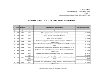 Załącznik Nr 3 do Uchwały Nr ... Rady Gminy Sejny z dnia … w sprawie zmian budżetu Gminy Sejny na 2016 rok ZADANIA INWESTYCYJNE GMINY SEJNY W 2016 ROKU L.p. Dział Rozdział § Nazwa zadania inwestycyjnego Rok budżetowy 2016 6 1 2 3 4 5 1. 400 40002 6060 Zakup oprogramowania do rozliczania opłat za wodę 18 000,00 2. 400 40002 6060 Zakup sprężarki do hydroforni Burbiszki 9 120,00 3. 400 40002 6060 Zakup zestawu inkasenckiego 12 000,00 4. 600 60016 6050 5. 600 60016 6050 6. 600 60016 6050 Przebudowa drogi gminnej Bosse - Pomorze Nr 102273 B o długości 557 m 39 134,00 7. 600 60016 6050 Przebudowa drogi gminnej Dziedziule - Klejwy - Michnowce Nr 101741 B o długości 550 m 75 109,00 8. 600 60016 6050 Przebudowa drogi gminnej Gryszkańce przez wieś Nr 102222 B o długości 630 m 83 992,00 Przebudowa drogi gminnej Nr 102244 B Dworczysko - Hołny Wolmera, Gmina Sejny 20 000,00 12 679,00 7 248,00 39 927,00 Przebudowa drogi gminnej Hołny Wolmera - Podlaski - Berżniki Nr 102247 B o długości 730 m 97 324,00 9. 600 60016 6050 6057 6059 Razem 10. 600 60016 6050 Przebudowa drogi gminnej Berżniki - Dubowo - Wigrańce Nr 102237 B o długości 709 m Przebudowa drogi gminnej Berżniki - Granica Państwa Nr 102250 B o długości 300 m ~Strona 1 ~Zadania inwestycyjne Gminy Sejny w 2016 roku 54 335,00 32 198,00 L.p. Dział Rozdział § Nazwa zadania inwestycyjnego Rok budżetowy 2016 6 1 2 3 4 5 11. 600 60016 6050 Przebudowa drogi gminnej Jodeliszki - Jenorajście Nr 102228 B o długości 600 m 79 993,00 12. 600 60016 6050 Przebudowa drogi gminnej Kielczany przez wieś Nr 102270 B o długości 206 m 13 201,00 13. 600 60016 6050 Przebudowa drogi gminnej Krejwińce przez wieś Nr 102281 B o długości 1 380 m 183 983,00 14. 600 60016 6050 Przebudowa drogi gminnej Nowosady - Bubele Nr 102221 B o długości 602 m 41 628,00 15. 600 60016 6050 Przebudowa drogi gminnej Posejny - Posejanka Nr 102261 B o długości 511 m 37 626,00 16. 600 60016 6050 Przebudowa drogi gminnej Żegary - Krasnogruda Nr 102236 B o długości 590 m 42 446,00 17. 600 60016 6050 Przebudowa drogi gminnej Żłobin - Sumowo Nr 102050 B o długości 457 m 33 278,00 18. 600 60017 6050 Przebudowa drogi wewnętrznej Krasnogruda przez wieś o długości 450 m 32 370,00 19. 600 60017 6050 Przebudowa drogi wewnętrznej Sumowo przez wieś o długości 595 m 43 746,00 20. 801 80101 6050 Termomodernizacja Szkoły Podstawowej w Krasnowie 50 000,00 Termomodernizacja budynku Szkoły Podstawowej w Poćkunach w Gminie Sejny 100 000,00 354 448,00 283 368,00 737 816,00 21. 801 80101 6050 6057 6059 Razem 22. 801 80113 6060 Zakup autokaru 131 000,00 23. 900 90095 6050 Zakup i montaż pieca c.o. w kotłowni przy Urzędzie Gminy Sejny 23 000,00 24. 921 92109 6050 Termomodernizacja Domu Kultury w Berżnikach 50 000,00 OGÓŁEM: ~Strona 2 ~Zadania inwestycyjne Gminy Sejny w 2016 roku 1 961 226,00