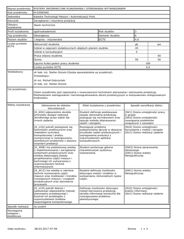 Nazwa przedmiotu SYSTEMY INFORMACYJNE PLANOWANIA I STEROWANIA WYTWARZANIEM Kod przedmiotu M:03583W0 Jednostka Katedra Technologii Maszyn i Automatyzacji Prod. Kierunek Zarządzanie i inżynieria produkcji Obszary kształcenia Nauki techniczne Profil kształcenia ogólnoakademicki Rok studiów 3 Typ przedmiotu Obowiąkowy Semestr studiów 6 Poziom studiów I stopnia - inżynierskie ECTS 4.0 Liczba punktów ECTS Aktywność studenta gk Udział w zajęciach dydaktycznych objętych planem studiów 45 Udział w konsultacjach pw 5 Praca własna studenta 50 Suma Wykładowcy 50 50 Łączna liczba godzin pracy studenta 100 Liczba punktów ECTS 4.0 dr hab. inż. Stefan Dzionk (Osoba opowiedzialna za przedmiot) Prowadzący: dr inż. Michał Dobrzyński dr hab. inż. Stefan Dzionk Cel przedmiotu Celem przedmiotu jest zapoznanie z nowoczesnymi technikami planowania i sterowania produkcją. Możliwościami szeregowania i harmonogramowania zleceń produkcyjnych w komputerowo zintegrowanym środowisku. Efekty kształcenia Sposób realizacji Odniesienie do efektów kierunkowych Efekt kształcenia z przedmiotu Sposób weryfikacji efektu [K_K04] odpowiednio określa priorytety służące realizacji określonego przez siebie lub innych zadania Student definiuje podstawowe zasady sterowania produkcją, posługuje się normatywami oraz opisuje metody bilansowania zadań i obciążeń, [SK1] Ocena umiejętności pracy w grupie [SK5] Ocena umiejętności rozwiązania problemów związanych z zawodem [K_U16] potrafi posługiwać się technikami analitycznymi oraz metodami symulacji komputerowej i analizy numerycznej w rozwiązywaniu określonych problemów z obszaru inżynierii produkcji Rozwiązuje problemy podejmowania decyzji w obszarze przydziału zadań produkcyjnych i szeregowania produkcji z wykorzystaniem aplikacji komputerowych. [SU4] Ocena umiejętności korzystania z metod i narzędzi [SU1] Ocena realizacji zadania [K_W08] ma podstawową wiedzę z implementowania i zarządzania systemami produkcyjnymi oraz wiedzę obejmującą zasady projektowania części maszyn i technologii ich wytwarzania z wykorzystaniem technik informacyjnych Student porównuje główne charakterystyki systemuu wytwarzania. [SW3] Ocena opracowania tekstowego [SW1] Ocena wiedzy faktograficznej [K_W12] ma wiedzę w zakresie technik wytwarzania części maszyn oraz możliwości i trendów rozwojowych maszyn i urządzeń produkcyjnych oraz sterowania procesami Student definiuje możliwości dotyczące metod i środków w wytwarzaniu różnorodnych typów części. [SW1] Ocena wiedzy faktograficznej [K_U19] potrafi dobrać i zastosować odpowiednie metody planowaniu przedsięwzięć i kontroli ich przebiegów z wykorzystaniem środków wspomagania komputerowego Definiuje możliwości dotyczące metod sterowania produkcją, określa informacje konieczne dla rozwiązywania problemu planistycznego. [SU2] Ocena umiejętności analizy informacji [SU1] Ocena realizacji zadania na uczelni Wymagania wstępne i dodatkowe Data wydruku: 08.03.2017 07:59 Strona 1 z 3 Zalecane komponenty przedmiotu Treść przedmiotu WYKŁAD Zintegrowane informatyczne systemy planowania i sterowania produkcją. Techniczno – ekonomiczne aspekty sterowania produkcją, Istota sterowania przepływem produkcji, podstawowe zasady sterowania, normatywy sterowania, planowanie zadań i obciążeń, bilansowanie zadań ze zdolnością produkcyjną, metody międzykomórkowego sterowania przepływem produkcji, metody wewnątrzkomórkowego sterowania przepływem produkcji, dokumentacja związana ze sterowaniem przepływem produkcji, ewidencja i kontrola przepływu produkcji. Inne techniki planowania i sterowania produkcją Trendy w planowaniu i sterowaniu produkcją. LABORATORIUM Definiowanie produktów: atrybuty produktu, możliwe marszruty, zasoby, czasy przezbrojeń i operacji, atrybuty operacji. Dane o zasobach: zasoby, ograniczenia, grupy zasobów. PROJEKT: Wprowadzanie zleceń: metody wyznaczania partii, kalendarz i zmiany produkcyjne. Szeregowanie zleceń. Standardowe i algorytmiczne reguły przydziału. Analiza harmonogramu. Raporty. Wykres Gantta. Wykres przebiegu zleceń. Wykresy ograniczeń. Zalecana lista lektur Literatura podstawowa 1. 2. 3. 4. 5. 6. Brzeziński M.: Organizacja i sterowanie produkcją. Placet, Warszawa, 2002. Durlik I.: Inżynieria zarządzania, t.1 i 2, Placet, Warszawa, 1998. Sawik T.: Planowanie i sterowanie produkcji w elastycznych systemach montażowych, WNT, 1996. Lis S., Santarek K., Strzelczak S.: Organizacja elastycznych systemów produkcyjnych, PWN, Warszawa, 1994. Wróblewski K.: Podstawy sterowania przepływem produkcji, WNT, Warszawa, 1993. I. Pisz, T. Sęk, W. Zielecki: logistyka w przedsiębiorstwie, Polskie Wydawnictwo Ekonomiczne 2013. Literatura uzupełniająca 1. 2. Formy zajęć i metody nauczania Knosala R., Ziomek T.: Laboratorium z komputerowych systemów zarządzania produkcją, WPŚ, Gliwice, 1998. Preactor Software– Instrukcja obsługi systemu Planowania i Sterowania Produkcją. Forma zajęć Liczba godzin zajęć Suma godzin dydaktycznych w semestrze, objętych planem studiów Wykład Ćwiczenia Laboratorium Projekt Seminarium 15.0 0.0 15.0 15.0 0.0 45 W tym kształcenie na odległość: 0.0 Data wydruku: 08.03.2017 07:59 Strona 2 z 3 Metody i kryteria oceniania Kryteria oceniania: składowe Próg zaliczeniowy Procent oceny końcowej Cwiczenie praktyczne 60.0 20.0 Egzamin Pisemny 60.0 40.0 Laboratorium 50.0 10.0 Projekt 50.0 30.0 Przykładowe zagadnienia / Przykładowe zadania / Realizowane zadania 1. 2. 3. 4. 5. 6. 7. 8. 9. 10. 11. 12. 13. 14. 15. 16. 17. 18. 19. 20. 21. 22. 23. 24. 25. 26. 27. 28. 29. 30. 31. Język wykładowy Teoria sterowania – pojęcia podstawowe. Przedsiębiorstwo jako układ cybernetyczny. Istota sterowania przepływem produkcji. Hierarchiczność układów sterowania.. Złożoność sterowania przepływem produkcji. Sprawność sterowania przepływem produkcji. Zasady sterowania (AI-AIII, 