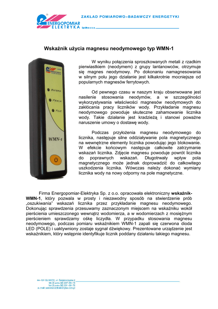 Wskaźnik uŜycia magnesu neodymowego typ WMN-1 W wyniku połączenia sproszkowanych metali z rzadkim pierwiastkiem (neodymem) z grupy lantanowców, otrzymuje się magnes neodymowy. Po dokonaniu namagnesowania w silnym polu jego działanie jest kilkakrotnie mocniejsze od popularnych magnesów ferrytowych. Od pewnego czasu w naszym kraju obserwowane jest nasilenie stosowania neodymów, a w szczególności wykorzystywania właściwości magnesów neodymowych do zakłócania pracy liczników wody. Przykładanie magnesu neodymowego powoduje skuteczne zahamowanie licznika wody. Takie działanie jest kradzieŜą i stanowi powaŜne naruszenie umowy o dostawę wody. Podczas przyłoŜenia magnesu neodymowego do licznika, następuje silne oddziaływanie pola magnetycznego na wewnętrzne elementy licznika powodując jego blokowanie. W efekcie końcowym następuje całkowite zatrzymanie wskazań licznika. Zdjęcie magnesu powoduje powrót licznika do poprawnych wskazań. Długotrwały wpływ pola magnetycznego moŜe jednak doprowadzić do całkowitego uszkodzenia licznika. Wówczas naleŜy dokonać wymiany licznika wody na nowy odporny na pole magnetyczne. Firma Energopomiar-Elektryka Sp. z o.o. opracowała elektroniczny wskaźnikWMN-1, który pozwala w prosty i niezawodny sposób na stwierdzenie prób „oszukiwania” wskazań licznika przez przykładanie magnesu neodymowego. Dokonując sprawdzenia przesuwamy zaznaczonym miejscem na wskaźniku wokół pierścienia umieszczonego wewnątrz wodomierza, a w wodomierzach z mosięŜnym pierścieniem sprawdzamy ośkę liczydła. W przypadku stosowania magnesu neodymowego, podczas pomiaru wskaźnikiem WMN-1 zapali się czerwona dioda LED (POLE) i uaktywniony zostaje sygnał dźwiękowy. Prezentowane urządzenie jest wskaźnikiem, który wstępnie identyfikuje licznik poddany działaniu takiego magnesu. W przypadku instalacji wykonanych z tworzyw zachodzi konieczność przymocowania do licznika elementu wraŜliwego na pole magnetyczne. MontaŜu magnetoczułego elementu naleŜy dokonać w czasie poprzedzającym kontrolę pola. Nie dajmy się okradać! Aby jak najszybciej zapobiec narastającemu zjawisku nielegalnego poboru wody przez nieuczciwych odbiorców, firma Energopomiar-Elektryka Sp. z o.o. proponuje jednostkom Administracji Mieszkaniowej oraz dostawcom mediów wyposaŜenie inkasentów we wskaźniki WMN-1. W przypadku konieczności zastosowania dodatkowych elementów zabezpieczających, proponujemy wykorzystanie pasków magnetoczułych zabezpieczonych jednorazowymi plombami z numerem seryjnym lub wykorzystanie plomb zaciskowych stosowanych na śrubunki. Paski magnetoczułe w momencie zbliŜenia magnesu neodymowego ulegają trwałemu namagnesowaniu. PoniŜej prezentujemy miejsce sprawdzania wodomierza oraz stosowane dodatkowe zabezpieczenie w postaci paska magnetoczułego. Pasek magnetoczuły z plombą
