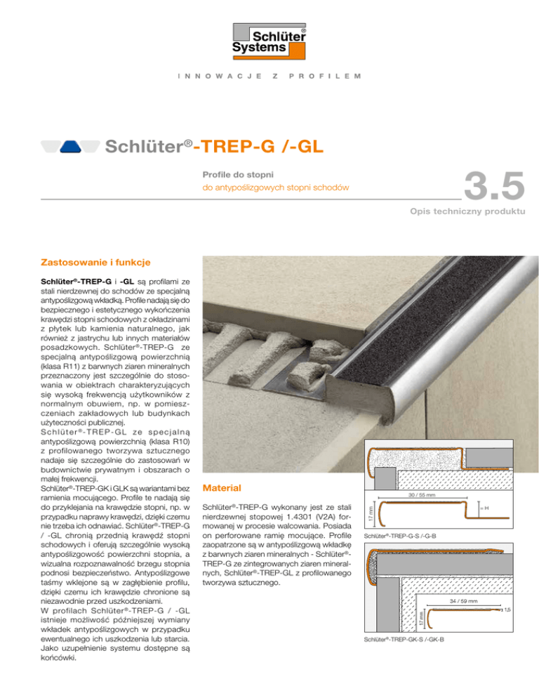 Schlüter®-TREP-G /-GL 3.5 Profile do stopni do antypoślizgowych stopni schodów Opis techniczny produktu Zastosowanie i funkcje Material Schlüter®-TREP-G wykonany jest ze stali nierdzewnej stopowej 1.4301 (V2A) formowanej w procesie walcowania. Posiada on perforowane ramię mocujące. Profile zaopatrzone są w antypoślizgową wkładkę z barwnych ziaren mineralnych - Schlüter®TREP-G ze zintegrowanych ziaren mineralnych, Schlüter®-TREP-GL z profilowanego tworzywa sztucznego. 30 / 55 mm 17 mm Schlüter®-TREP-G i -GL są profilami ze stali nierdzewnej do schodów ze specjalną antypoślizgową wkładką. Profile nadają się do bezpiecznego i estetycznego wykończenia krawędzi stopni schodowych z okładzinami z płytek lub kamienia naturalnego, jak również z jastrychu lub innych materiałów posadzkowych. Schlüter ®-TREP-G ze specjalną antypoślizgową powierzchnią (klasa R11) z barwnych ziaren mineralnych przeznaczony jest szczególnie do stosowania w obiektrach charakteryzujących się wysoką frekwencją użytkowników z normalnym obuwiem, np. w pomieszczeniach zakładowych lub budynkach użyteczności publicznej. S c h l ü t e r ®- T R E P - G L z e s p e c j a l n ą antypoślizgową powierzchnią (klasa R10) z profilowanego tworzywa sztucznego nadaje się szczególnie do zastosowań w budownictwie prywatnym i obszarach o małej frekwencji. Schlüter®-TREP-GK i GLK są wariantami bez ramienia mocującego. Profile te nadają się do przyklejania na krawędzie stopni, np. w przypadku naprawy krawędzi, dzięki czemu nie trzeba ich odnawiać. Schlüter®-TREP-G / -GL chronią przednią krawędź stopni schodowych i oferują szczególnie wysoką antypoślizgowość powierzchni stopnia, a wizualna rozpoznawalność brzegu stopnia podnosi bezpieczeństwo. Antypoślizgowe taśmy wklejone są w zagłębienie profilu, dzięki czemu ich krawędzie chronione są niezawodnie przed uszkodzeniami. W profilach Schlüter ® -TREP-G / -GL istnieje możliwość późniejszej wymiany wkładek antypoślizgowych w przypadku ewentualnego ich uszkodzenia lub starcia. Jako uzupełnienie systemu dostępne są końcówki. Schlüter®-TREP-G-S /-G-B Schlüter®-TREP-GK-S /-GK-B =H 3.5 Schlüter®-TREP-G /-GL Właściwości materiału i zakres zastosowania: Profil powinien zostać dopasowany do chemicznego, mechanicznego lub innego rodzaju obciążenia, któremu poddawana będzie gotowa okładzina. Schlüter®-TREP-G /-GL nadaje się szczególnie do zastosowań, w których w zależności od typu, obok wysokiej odporności na obciążenia mechaniczne wymagana jest odporność na oddziaływania chemiczne, np. odporność na kwasy, zasadowe roztwory lub środki czyszczące. Profile można stosować wewnątrz i na zewnątrz budynków. Przezroczysta wkładka posiada jednakże ograniczoną odporność na promienie UV i dlatego nadaje się do stosowania wyłącznie we wnętrzach budynków. Obróbka Schlüter®-TREP-G /-GL Schlüter®-TREP-GK /-GLK 1.Schlüter®-TREP-G /-GL dobrać odpowiednio do grubości płytek. 2. Najpierw ułożyć płytki podstopnicy, tak aby ich górna krawędź leżała na tym samym poziomie co stopień. 3. Na krawędź stopnia nałożyć odpowiedni klej do płytek. 4. Puste przestrzenie spodniej strony profilu należy wypełnić odpowiednim klejem do płytek. Uwaga do pkt. 3 i 4: przy grub-szych warstwach kleju w obszarze brzegu stopnia, należy użyć hydraulicznie wiążący klej cienkowarstwowy zgodnie z instrukcją producenta w nieco mniejszym stężeniu lub zaprawę średniowarstwową. 5.Schlüter®-TREP-G /-GL osadzić na całej powierzchni w warstwie kleju i odpowiednio ustawić, tak aby czołowa krawędź profilu nachodziła na płytki podstopnicy. 6. Trapezoidalnie perforowane ramię mocujące i powierzchnię stopnia w całości przeszpachlować klejem do płytek. 7. Płytki układane na stopniu należy mocno docisnąć i tak ułożyć, aby powierzchnia licowa profilu leżała w jednej powierzchni z płytkami. Płytki graniczące z profilem muszą być na całej powierzchni zatopione w warstwie kleju. 8. Pomiędzy płytkami a profilem należy pozostawić 2-milimetrową spoinę. 9. Puste przestrzenie pomiędzy płytkami a profilem należy wypełnić klejem do płytek. W trakcie spoinowania zaleca się zabezpieczenie powierzchni antypoślizgowej za pomocą odpowiednij taśmy klejącej. 10.Przy wbudowaniu profilu Schlüter®TREP-G /-GL w powierzchnie jastrychowe, profil zostaje w całości wtopiony w zaprawę. Należy zwrócić uwagę, aby trapezoidalnie perforowane ramię mocujące pokryte zostało warstwą zaprawy jastrychowej grubości co najmniej 15 mm. Obróbka Schlüter®-TREP-GK /-GLK 1. Krawędzie stopni oczyścić i naprawić ewentualne uszkodzenia. 2. Spodnią stronę Schlüter ®-TREP-GK /-GLK oczyścić względnie odtłuścić. 3. Profil przykleić na całej powierzchni odpowiednim klejem (w zależności od podłoża np. klejem epoksydowym lub Schlüter®-KERDI-FIX). Wskazówka: W miejscu profilu powstaje 1,5-milimetrowe podwyższenie w stosunku do okładziny schodów. Wymiana wkładki antypoślizgowej Przy wymianie wkładki antypoślizgowej należy przestrzegać minimalnej temperatury otoczenia 10°C. 1. Całkowicie usunąć starą taśmę klejącą 2. Przed przyklejeniem nowej taśmy powierzchnię profilu dokładnie oczyścić rozpuszczalnikiem. 3. Pasek ochronny zdjąć na szerokości ok 5. cm i samoprzylepną taśmę wypozycjonować na powierzchni profilu. Nie dotykać powierzchni klejącej palcami. 4. R ó w n o m i e r n i e ś c i ą g a j ą c p a s e k ochronny naklejać taśmę klejącą. 5. Na zakończenie należy docisnąć taśmę gumowym wałkiem. Należy przy tym wałkować od środka w kierunku brzegów. 3.5 Schlüter®-TREP-G /-GL Wskazówki Schlüter-TREP-G i GL nie wymagają żadnych specjalnych zabiegów konserwacyjnych lub pielęgnacyjnych. Regularne usuwanie brudu i innych pozostałości pozwala na zachowanie właściwości antypośliz