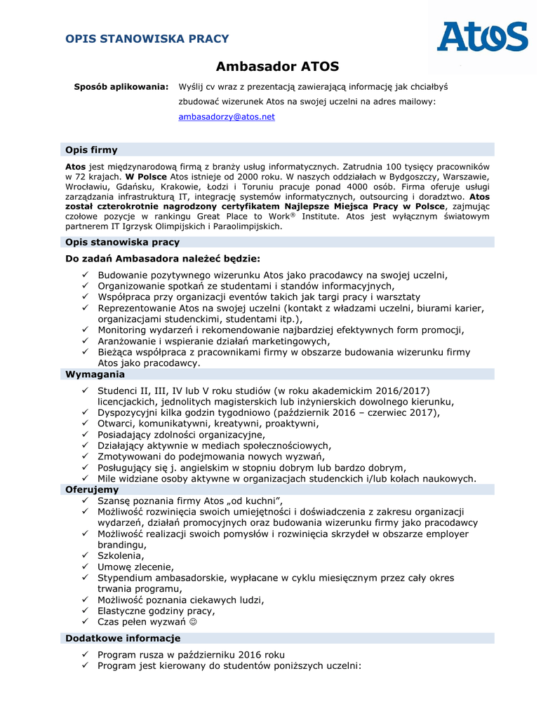 OPIS STANOWISKA PRACY Ambasador ATOS Sposób aplikowania: Wyślij cv wraz z prezentacją zawierającą informację jak chciałbyś zbudować wizerunek Atos na swojej uczelni na adres mailowy: [email protected] Opis firmy Atos jest międzynarodową firmą z branży usług informatycznych. Zatrudnia 100 tysięcy pracowników w 72 krajach. W Polsce Atos istnieje od 2000 roku. W naszych oddziałach w Bydgoszczy, Warszawie, Wrocławiu, Gdańsku, Krakowie, Łodzi i Toruniu pracuje ponad 4000 osób. Firma oferuje usługi zarządzania infrastrukturą IT, integrację systemów informatycznych, outsourcing i doradztwo. Atos został czterokrotnie nagrodzony certyfikatem Najlepsze Miejsca Pracy w Polsce, zajmując czołowe pozycje w rankingu Great Place to Work® Institute. Atos jest wyłącznym światowym partnerem IT Igrzysk Olimpijskich i Paraolimpijskich. Opis stanowiska pracy Do zadań Ambasadora należeć będzie: Budowanie pozytywnego wizerunku Atos jako pracodawcy na swojej uczelni, Organizowanie spotkań ze studentami i standów informacyjnych, Współpraca przy organizacji eventów takich jak targi pracy i warsztaty Reprezentowanie Atos na swojej uczelni (kontakt z władzami uczelni, biurami karier, organizacjami studenckimi, studentami itp.), Monitoring wydarzeń i rekomendowanie najbardziej efektywnych form promocji, Aranżowanie i wspieranie działań marketingowych, Bieżąca współpraca z pracownikami firmy w obszarze budowania wizerunku firmy Atos jako pracodawcy. Wymagania Studenci II, III, IV lub V roku studiów (w roku akademickim 2016/2017) licencjackich, jednolitych magisterskich lub inżynierskich dowolnego kierunku, Dyspozycyjni kilka godzin tygodniowo (październik 2016 – czerwiec 2017), Otwarci, komunikatywni, kreatywni, proaktywni, Posiadający zdolności organizacyjne, Działający aktywnie w mediach społecznościowych, Zmotywowani do podejmowania nowych wyzwań, Posługujący się j. angielskim w stopniu dobrym lub bardzo dobrym, Mile widziane osoby aktywne w organizacjach studenckich i/lub kołach naukowych. Oferujemy Szansę poznania firmy Atos „od kuchni”, Możliwość rozwinięcia swoich umiejętności i doświadczenia z zakresu organizacji wydarzeń, działań promocyjnych oraz budowania wizerunku firmy jako pracodawcy Możliwość realizacji swoich pomysłów i rozwinięcia skrzydeł w obszarze employer brandingu, Szkolenia, Umowę zlecenie, Stypendium ambasadorskie, wypłacane w cyklu miesięcznym przez cały okres trwania programu, Możliwość poznania ciekawych ludzi, Elastyczne godziny pracy, Czas pełen wyzwań Dodatkowe informacje Program rusza w październiku 2016 roku Program jest kierowany do studentów poniższych uczelni: OPIS STANOWISKA PRACY o o o o o Uniwersytet Kazimierza Wielkiego w Bydgoszczy Politechnika Poznańska Uniwersytet im. Adama Mickiewicza w Poznaniu Uniwersytet Zielonogórski Wyższa Szkoła Bankowa