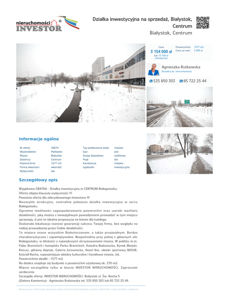 Działka inwestycyjna na sprzedaż, Białystok, Centrum Białystok, Centrum Cena 3 154 000 zł Powierzchnia Cena za metr 1577 m2 2 000 zł lub 13 709 zł miesięcznie Agnieszka Rutkowska Doradca ds. nieruchomości 535 850 303 Informacje ogólne Nr oferty 30674 Typ podłączenia wody miejska Województwo Podlaskie Gaz jest Miasto Białystok Droga dojazdowa asfaltowa Dzielnica Centrum Prąd tak Powierzchnia 1577 m2 Kanalizacja miejska Forma własności własność typdzialki inwestycyjna Wyłączność tak Szczegółowy opis Wyjątkowa GRATKA - Działka inwestycyjna w CENTRUM Białegostoku. Oferta objęta klauzulą wyłączności !!! Poważna oferta dla zdecydowanego Inwestora !!! Niezwykle atrakcyjna, centralnie położona działka inwestycyjna w sercu Białegostoku. Ogromne możliwości zagospodarowania powierzchni oraz szeroki wachlarz działalności, jaką można z niewątpliwym powodzeniem prowadzić w tym miejscu sprawiają, iż jest to idealna propozycja na biznes dla każdego. Doskonała lokalizacja stanowi gwarancję sukcesu Twojej firmy, bez względu na rodzaj prowadzonej przez Ciebie działalności. To miejsce znane wszystkim Białostoczanom, a także przyjezdnym. Bardzo charakterystyczne i zapamiętywalne. Bezpośrednio przy jednej z głównych ulic Białegostoku, w bliskości z największymi skrzyżowaniami miasta. W pobliżu m.in. Pałac Branickich i kompleks Parku Branickich, Katedra Białostocka, Rynek Miejski, Ratusz, główny deptak, Galeria Jurowiecka, Hotel Ibis, obiekt sportowy MOSiR, Kościół Rocha, najważniejsze obiekty kulturalne i handlowe miasta, itd. Powierzchnia działki : 1577 m2. Na działce znajduje się budynek o powierzchni użytkowej ok. 270 m2. Więcej szczegółów tylko w biurze INVESTOR NIERUCHOMOŚCI. Zapraszam serdecznie. Szczegóły oferty: INVESTOR NIERUCHOMOŚCI, Białystok ul. Św. Rocha 5 (Zielona Kamienica) - Agnieszka Rutkowska tel. 535 850 303 lub 85 722 25 44. Nota prawna: Informacje dotyczące opisu nieruchomości podane są przez właściciela, mają charakter wyłącznie 85 722 25 44 informacyjny i mogą podlegać aktualizacji. Oferta dotycząca nieruchomości stanowi zaproszenie do rokowań zgodnie z art. 71 Kodeksu Cywilnego i nie stanowi oferty określonej w art. 66 i następnych KC. Oddział Białystok, ul. Św. Rocha 5 (Zielona Kamienica) , 15-879 Białystok 77 400 01 76 • [email protected] • www.investor.net.pl 2017-03-08 06:59:41 Strona 1 z 1
