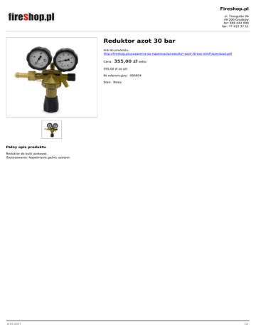 Fireshop.pl ul. Traugutta 9A 49-200 Grodków tel: 888 444 998 fax: 77 415 37 11 Reduktor azot 30 bar link do produktu: http://fireshop.pl/urzadzenia-do-napelniania/reduktor-azot-30-bar.html?download.pdf Cena: 355,00 zł netto 355,00 zł za szt. Nr referencyjny: 093604 Stan: Nowy Pełny opis produktu Reduktor do butli azotowej. Zastosowanie: Napełnianie gaśnic azotem. 8-03-2017 1/1