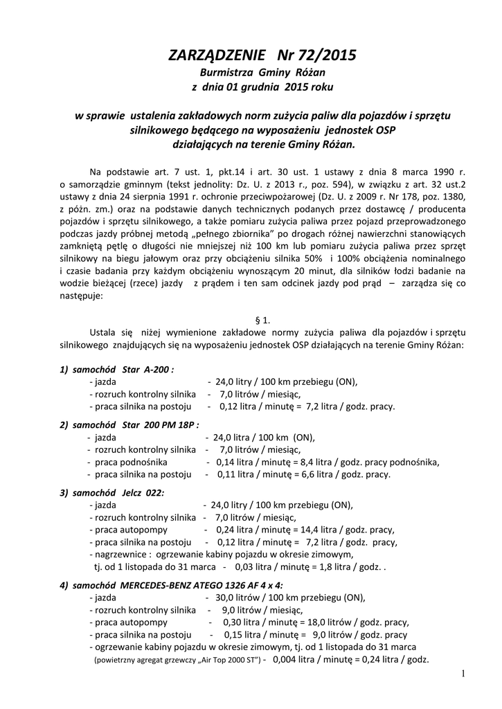 ZARZĄDZENIE Nr 72/2015 Burmistrza Gminy Różan z dnia 01 grudnia 2015 roku w sprawie ustalenia zakładowych norm zużycia paliw dla pojazdów i sprzętu silnikowego będącego na wyposażeniu jednostek OSP działających na terenie Gminy Różan. Na podstawie art. 7 ust. 1, pkt.14 i art. 30 ust. 1 ustawy z dnia 8 marca 1990 r. o samorządzie gminnym (tekst jednolity: Dz. U. z 2013 r., poz. 594), w związku z art. 32 ust.2 ustawy z dnia 24 sierpnia 1991 r. ochronie przeciwpożarowej (Dz. U. z 2009 r. Nr 178, poz. 1380, z póżn. zm.) oraz na podstawie danych technicznych podanych przez dostawcę / producenta pojazdów i sprzętu silnikowego, a także pomiaru zużycia paliwa przez pojazd przeprowadzonego podczas jazdy próbnej metodą „pełnego zbiornika” po drogach różnej nawierzchni stanowiących zamkniętą pętlę o długości nie mniejszej niż 100 km lub pomiaru zużycia paliwa przez sprzęt silnikowy na biegu jałowym oraz przy obciążeniu silnika 50% i 100% obciążenia nominalnego i czasie badania przy każdym obciążeniu wynoszącym 20 minut, dla silników łodzi badanie na wodzie bieżącej (rzece) jazdy z prądem i ten sam odcinek jazdy pod prąd – zarządza się co następuje: § 1. Ustala się niżej wymienione zakładowe normy zużycia paliwa dla pojazdów i sprzętu silnikowego znajdujących się na wyposażeniu jednostek OSP działających na terenie Gminy Różan: 1) samochód Star A-200 : - jazda - rozruch kontrolny silnika - praca silnika na postoju - 24,0 litry / 100 km przebiegu (ON), - 7,0 litrów / miesiąc, - 0,12 litra / minutę = 7,2 litra / godz. pracy. 2) samochód Star 200 PM 18P : - jazda - rozruch kontrolny silnika - praca podnośnika - praca silnika na postoju - 24,0 litra / 100 km (ON), - 7,0 litrów / miesiąc, - 0,14 litra / minutę = 8,4 litra / godz. pracy podnośnika, - 0,11 litra / minutę = 6,6 litra / godz. pracy. 3) samochód Jelcz 022: - jazda - 24,0 litry / 100 km przebiegu (ON), - rozruch kontrolny silnika - 7,0 litrów / miesiąc, - praca autopompy - 0,24 litra / minutę = 14,4 litra / godz. pracy, - praca silnika na postoju - 0,12 litra / minutę = 7,2 litra / godz. pracy, - nagrzewnice : ogrzewanie kabiny pojazdu w okresie zimowym, tj. od 1 listopada do 31 marca - 0,03 litra / minutę = 1,8 litra / godz. . 4) samochód MERCEDES-BENZ ATEGO 1326 AF 4 x 4: - jazda - 30,0 litrów / 100 km przebiegu (ON), - rozruch kontrolny silnika - 9,0 litrów / miesiąc, - praca autopompy - 0,30 litra / minutę = 18,0 litrów / godz. pracy, - praca silnika na postoju - 0,15 litra / minutę = 9,0 litrów / godz. pracy - ogrzewanie kabiny pojazdu w okresie zimowym, tj. od 1 listopada do 31 marca (powietrzny agregat grzewczy „Air Top 2000 ST”) - 0,004 litra / minutę = 0,24 litra / godz. 1 5) samochód FS Lublin III Combi 3524: - jazda - 10,2 litra / 100 km przebiegu (ON), - rozruch kontrolny silnika - 3,0 litrów / miesiąc, - praca silnika na postoju - 0,05 litra / minutę = 3,0 litra / godz. pracy. 6) samochód Ford Transit 330 M: - jazda - rozruch kontrolny silnika - praca silnika na postoju - 9,0 litra /100 km przebiegu (ON), 3,0 litry / miesiąc, 0,05 litra / minutę = 3,0 litra / godz. pracy. 7) samochód Ford Transit 350 M: - jazda - 11,7 litra / 100 km przebiegu (ON), - rozruch kontrolny silnika - 3,0 litry / miesiąc, - praca silnika na postoju - 0,05 litra / minutę = 3,0 litra / godz. pracy. 8) samochód Ford Transit VAN 350 M: - jazda - 10,9 litra / 100 km przebiegu (ON), - rozruch kontrolny silnika - 3,0 litry / miesiąc, - praca silnika na postoju - 0,05 litra / minutę = 3,0 litra / godz. pracy. 9) motopompa M8/8-1 „SPEC-POŻ” : - praca - rozruch kontrolny silnika - 7,5 litra / godz. pracy (etylina), 1,5 litra / miesiąc. 10) motopompa P0-5: - praca - 12,0 litrów / godz. pracy (etylina), - rozruch kontrolny silnika - 2,0 litry / miesiąc. 11) motopompa TOHATSU, model VC82ASE: - praca - 18 litrów / godz. pracy (etylina). 12) motopompa pływająca „NIAGARA” : - praca - 1,0 litr / godz. pracy (etylina) . 13) pompa szlamowa WT 40X, z silnikiem HONDA, model GX 340K1: - praca - 3,0 litry / godz. pracy (etylina). 14) pompa szlamowa WT 30X, z silnikiem HONDA, model GX240: - praca - 2,6 litra / godz. pracy (etylina). 15) pompa szlamowa samozasysająca PTX 301T, z silnikiem ROBIN- SUBARU , model EX27: - praca - 2,4 litra / godz. pracy (etylina). 16) agregat pompowy Geco Power SPD-F 6/12: - praca - 3,0 litra / godz. pracy (ON) 17) agregat wodny wysokociśnieniowy, typ As 150b: - praca - 1,5 litra / godz. pracy (etylina), 18) agregat wodny wysokociśnieniowy, typ AW 40/40 Jadar, z silnikiem HONDA GX160: - praca - 1,5 litra / godz. pracy (etylina). 2 19) piła spalinowa do drzewa „STIHL MS 361” : - praca - 1,0 litr / godz. pracy (etylina). 20) piła spalinowa do drzewa „STIHL MS 261 C-M VW” : - praca - 1,0 litr / godz. pracy (etylina). 21) piła spalinowa do drzewa „STIHL MS 440” : - praca - 1,2 litra / godz. pracy (etylina). 22) piła spalinowa ratownicza „STIHL MS 460 R” : - praca - 1,5 litra / godz. pracy (etylina). 23) piła spalinowa ratownicza „STIHL MS 461 R” : - praca - 1,5 litra / godz. pracy (etylina). 24) piła spalinowa do cięcia betonu i stali: - praca - 1,0 litr / godz. pracy (etylina). 25) urządzenie hydrauliczne „LUCAS 1244 G1” : - praca - 1,0 litr / godz. pracy (etylina), 26) zestaw uniwersalnych narzędzi hydraulicznych: - pompa SR 40 PC 2, nożyce CU 4050 C NCT II, - rozpieracz ramieniowy SP 4240 C, - wąż hydrauliczny C 10 OU CORE, - wąż hydrauliczny C 10 BU CORE - praca - 0,8 litra / godz. pracy (etylina), 27) agregat prądotwórczy, typ EA 2000 IP54: - praca - 1,0 litr / godz. pracy (etylina), 28) agregat prądotwórczy, typ EA 3000: - praca - 1,3 litr / godz. pracy (etylina), 29) agregat prądotwórczy trójfazowy, typ ECT 7000 PGV: - praca - 2,7 litr / godz. pracy (etylina), 30) agregat prądotwórczy trójfazowy, typ Fogo FH 7540 ER: - praca - 2,7 litr / godz. pracy (etylina), 31)