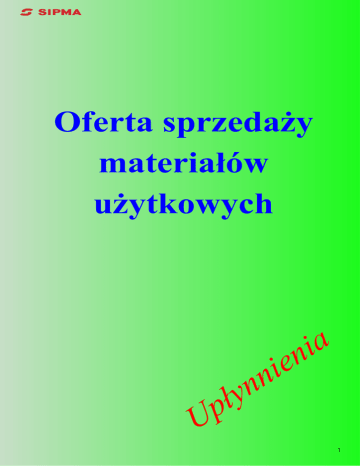 Oferta sprzedaŜy materiałów uŜytkowych n y ł p U a i n e i n 1 ELEMENTY I PODZESPOŁY HANDLOWE • • • • Elementy kooperacyjne po zaniechanej produkcji Normalia oraz nietypowe elementy złączne Elementy hydrauliki siłowej: przewody hydrauliczne, złączki hydrauliczne i siłowniki Podzespoły oraz części zamienne do obrabiarek wycofanych z procesu produkcyjnego MATERIAŁY HUTNICZE • • • • Pełnowartościowe materiały hutnicze w szerokim asortymencie: blachy, kształtowniki, rury i pręty Upłynnienia materiałowe i końcówki serii produkcyjnych Szeroki zakres długości oraz gabarytów MoŜliwość negocjacji cen 2 BLACHY POKRYCIOWE • • • • Blachy pokryciowe z materiałów hutniczych Odpady technologiczne z procesów cięcia Upłynnienia materiałów hutniczych Szeroki zakres grubości oraz formatów KSZTAŁTOWNIKI I PROFILE • Odpady technologiczne kształtowników i profili zamkniętych powstające w procesach wycinania laserowego 3D • Odpady technologiczne kształtowników, rur, wałków i profili zamkniętych powstające w procesach cięcia na przecinarkach taśmowych Szeroki zakres długości oraz gabarytów • 3 BROKI Z PROCESÓW CIĘCIA • • • • • Broki powstające w procesach wycinania laserowego Broki powstające w procesach wykrawania i dziurowania Szeroki zakres kształtów, grubości i rozmiarów MoŜliwość wykorzystania jako elementy ogrodzeń, zaślepki, łączniki MoŜliwość zamówienia usługi przetłaczania AśURY STALOWE • AŜury z procesów wycinania laserowego oraz wykrawania na prasach konwencjonalnych • Szeroki zakres grubości • Maksymalne gabaryty: 1500x3000 mm • MoŜliwość wykorzystania jako elementy ogrodzeń lub konstrukcji metalowych 4 SILNIKI SPALINOWE • • • • • • Silniki spalinowe Briggs&Stratton do kosiarek trawnikowych Typ wałka: Ø 25x55 mm Gwint: 7/16” UNF Zapłon: ręczny Podzespoły i części zamienne do kosiarek trawnikowych Dodatkowo istnieje moŜliwość zakupu osłony silnika z tworzywa sztucznego NARZĘDZIA • • • • • Szeroki pakiet narzędzi handlowych do obróbki skrawaniem Wiertła, frezy i noŜe tokarskie Narzędzia ze stali szybkotnącej oraz z węglików spiekanych Gwintownik ręczne i maszynowe Płyty traserskie 5