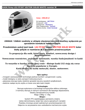 Informacje o produkcie Utworzono 08-03-2017 KASK firmy LS2 FF397 VECTOR SOLID WHITE rozmiar M Cena : 499,00 zł er m ar k Nr katalogowy : AK77014 Producent : LS2 Dostępność : Dostępny Stan magazynowy : wysoki Średnia ocena : brak recenzji UWAGA ! Odbiór osobisty w sklepie stacjonarnym jest możliwy wyłącznie po uprzednim kontakcie telefonicznym. Przedmiotem aukcji jest kask LS2 FF397 model VECTOR SOLID WHITE kolor biały połysk w rozmiarze M z wizjerem przeźroczystym To propozycja dla osób, które cenią, komfort, nowoczesny design i bezpieczeństwo. ● ● ● ● w at Nowoczesne wzornictwo, znakomite wykonanie, wysoka funkcjonalność to kaski LS2. To wszystko w bardzo atrakcyjnej cenie - dlatego kaski LS2 stają się coraz bardziej popularne w Europie. Kask idealny na każdy motocykl, skuter, motorower. Opis ogólny: mnogość zastosowanych technologii podnosi komfort i przyjemność z jazdy, model dostępny w wielu wersjach kolorystycznych, opływowa skorupa kasku świetnie sprawdzi się przy wysokich prędkościach, świetnie nadaje się do użytku w trasie oraz jako kask miejski. Technologie: Skorupa wykonana w technologii kompozytów włókna szklanego. 3 rozmiary skorupy w różnych rozmiarach dla lepszego dopasowania. Owalny aerodynamiczny kształt. Waga 1390g +/- 50g. Wizjer: System FFS zapobiegający parowaniu wizjera. Łatwo demontowany wizjer bez użycia specjalnych narzędzi. Powłoka chroniąca przed nadmiernym promieniowaniem UV. Odporna na zarysowania oraz uszkodzenia mechaniczne szyba. er m ar k Ergonomicznie opuszczana i podnoszona blenda przeciwsłoneczna. Komfort: Całkowicie demontowana wyściółka wewnętrzna przystosowana do prania. Hypoalergiczna wyściółka kasku. Laserowo wycinane elementy wewnętrzne dla jeszcze lepszego komfortu i spasowania ze sobą. Oddychający materiał. Deflektor ograniczający parowanie wizjera w czasie oddychania. Bezpieczeństwo: Ergonomiczne odpinanie kasku. Wzmocnione paski montażowe. ERS umożliwia bezpieczniejsze ściąganie kasku przez ratownika medycznego w razie wypadku. EPS patent który umożliwia precyzyjne dopasowanie do głowy oraz dodatkową ochronę. Precyzyjnie umieszczone i wzmocnione metalowe mocowania pasków do skorupy kasku. Wbudowany ochraniacz szyi. Światła odblaskowe poprawiające widoczność z tyłu. Wentylacja: Opatentowany system wentylacyjny odczuwalny już przy niskich prędkościach. Kanał wentylacyjny w przedniej części. Kanał wentylacyjny na szczycie kasku. Wyloty z tyłu kasku. tak Wyciągalna wyściółka: tak Materiał: Kompozyt włókna szklanego Nosek: tak Mocowanie na pinlok: tak nie w Miejsce na interkom: at Blenda: Rodzaj zapięcia: Mikrometryczne Płeć: Męski Wentylacja: tak