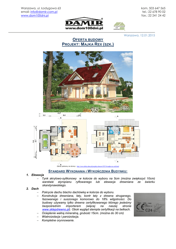 Warszawa, ul. Łodygowa 63 email: [email protected] www.dom100dni.pl kom. 503 647 565 tel.: 22 678 90 02 fax.: 22 241 24 42 Warszawa, 12.01.2015 OFERTA BUDOWY PROJEKT: M AJKA REX (SZK.) Obraz pobrany ze strony: http://www.dobry-dom.pl/projekty-domow/5557-0-majka-rex-szk.html STANDARD WYKONANIA I WYKOŃCZENIA BUDYNKU: 1. Elewacja Tynk akrylowo-sylikonowy w kolorze do wyboru na 5cm (można zwiększyć 10cm) warstwie styropianu ryflowanego lub elewacja drewniana ze świerku skandynawskiego. 2. Dach Pokrycie dachu blacho dachówką w kolorze do wyboru. Konstrukcja drewniana, łaty, kontr łaty z drewna struganego, fazowanego i suszonego komorowo do 18% wilgotności. Do budowy używamy tylko drewna certyfikowanego którego jesteśmy bezpośrednim importerem (więcej na naszej stronie www.sklepdrewno.pl). Obok wygląd stempla certyfikacji na belkach. Ocieplenie wełną mineralną, grubość 15cm. (można do 30 cm) Wiatroizolacja i paroizolacja. Kompletne orynnowanie. 3. Kominy Kanały spalinowy i wentylacyjne z systemowych bloczków kominowych. Kominek wewnętrzny standardowy z rozprowadzeniem ciepła do pomieszczeń (koszt wyszczególniony oddzielnie w tabeli poniżej). Z zewnątrz komin otynkowany. 4. Fundament- proponujemy trzy rozwiązania (A,B,C) w tej samej cenie A- szlichta cementowa ocieplona 10cm styropianu - Na głębokość przemarzania 90-120cm, - Szerokość ściany fundamentowej 24cm, - Wysokość od gruntu do papy ok..30 cm B- płyta fundamentowa ocieplana zbrojona wg/projektu C- podłoga podwieszana ocieplona wełną mineralną gr.15cm (można do 35cm) z piwnicą techniczną wysokości ok. 60cm. Piwnica ułatwia rozprowadzenie; rekuperacji, pompy ciepła, ukrycia rur gazowych, kanalizacji i wszelkich instalacji tzw. Inteligentnego domu o które będzie można doposażyć dom później. 5. Konstrukcja domu Ściany prefabrykowane w naszym zakładzie w Filipowie. Konstrukcja nośna to zabudowane belki drewniane, strugane, fazowane, suszone komorowo do 18% wilgotności. 6. Ściany zewnętrzne Z zewnątrz tynk akrylowy lub szalówka drewniana. Obłożone warstwą styropianu ryflowanego grubości 5cm (można zwiększyć 10cm). Wiatroizolacje Płyty MFP 12mm Konstrukcja z przekrojów 45mm x 145mm Ocieplone od wewnątrz wełną mineralną grubości 15cm (można zwiększyć do 30 cm) Paroizolacje Od wewnątrz płyty GK, szpachlowane i malowane dwukrotnie na kolor biały. Sposób montażu można obejrzeć na krótkiej prezentacji naszej firmy http://www.youtube.com/watch?v=X29-rT3DdvQ&feature=gupl&context=G22fb74fAUAAAAAAAFAA 7. Ściany wewnętrzne Konstrukcja z przekrojów 45mm x 95mm lub 45mm x 145mm. Ściany konstrukcyjne wzmocnione płytami MFP. Wygłuszone wełną mineralną 10 cm Wykończone płytą GK W pomieszczeniach „mokrych” wykończone płytą wodoodporną Ściany szpachlowane i malowane dwukrotnie na kolor biały (oprócz ścian okładanych glazurą). 8. Podłogi Na podłogach pozostaje płyta MFP lub szlichta. (dodatkowa opcja to panele lub deski) Strop nad parterem wygłuszony 15 cm wełny mineralnej. 9. Okna Okna białe PCV zgodne z projektem , bez szprosów, (producenci okien biorą dopłatę ok.20% za okna np.: brąz zewnątrz białe wewnątrz, 40% dopłaty za okna obustronnie w kolorze do wyboru). Okna połaciowe firmy FAKRO 4szt. Parapety zewnętrzne – blacha powlekana w kolorze blacho-dachówki. 10. Drzwi zewnętrzne Zakres cenowy 2000zł. 11. Drzwi wewnętrzne Zakres cenowy 400zł/szt. ilość zgodna z projektem 12. Kuchnia i łazienka Bez białego montażu, glazury i terakoty. 13. Instalacja elektryczna do 24-polowej tablicy bezpiecznikowej Przewody, puszki. str. 2 14. 15. 16. 17. 18. 19. 20. 21. Tablica bezpiecznikowa zlokalizowana w wiatrołapie, Ilość punktów elektrycznych: według projektu. Jeden wyłącznik różnicowo prądowy Instalacja kanalizacyjna Kompletna: piony i podejścia do urządzeń sanitarnych. Instalacja wodna Z podejściami do odbiorników w tym do termy i pralki. Ogrzewanie Zabezpieczona instalacja elektryczna pod grzejniki elektryczne (grzejniki zakupuje Inwestor). Ogrzewanie kominkowe z rozprowadzeniem ciepła do pomieszczeń z turbiną i anemostatami (koszt wyszczególniony oddzielnie w tabeli poniżej). Inne sposoby ogrzewania do ustalenia. Możemy wykonać ogrzewanie: tradycyjne wodne, pompę ciepła z odwiertami, rekuperację itd. Przy podejmowaniu decyzji należy pamiętać, że domy w tej technologii są zdecydowanie lepiej ocieplone. Wentylacja Grawitacyjna lub mechaniczna w łazienkach i w kuchni. (przy zamontowaniu rekuperacji za dopłatą można nie budować kominów wentylacyjnych). Schody Standardowe ażurowe, sosnowe – do uzgodnienia. Garaż Na szlichcie betonowej ocieplonej 5cm styropianu. Podłogę stanowi szlichta betonowa. Brama garażowa uchylna w kolorze białym lub brązowym z automatyką. Balkon Konstrukcja drewniana (przedłużenie stropu). Pokryty deską tarasową (ażurowy) lub płytą MFP gr. 22mm. Barierki drewniane impregnowane. Tarasy Wycena go nie obejmuje ,do ustalenia przy wykonywaniu fundamentu pod dom. (wszelkie powierzchnie betonowe przy domu pod które należy wykonać pełny fundament jak np. schody należy przyjąć 300 zł/m2 powierzchni zajmowanej na gruncie, tańsza i przyjemniejsza naszym zdaniem opcja to tarasy z desek tarasowych – 180 zł/m2). KALKULACJA KOSZTÓW NETTO (VAT 8%): Koszt budowy domu wg powyższych standardów ( 155,00m2 podłóg). *Kominek wewnętrzny standardowy (fundament, wkład i obudowa z montażem). **Ogrzewanie kominkowe z rozprowadzeniem ciepła do pomieszczeń (z turbiną). Transport z montażem – województwo mazowieckie. Transport z montażem – dopłata województwa ościenne do mazowieckiego. Transport z montażem – dopłata pozostałe województwa. 311 300,00 zł +9 000,00 zł +5 000,00 zł +4 000,00 zł +6 900,00 zł +8 900,00 zł str. 3
