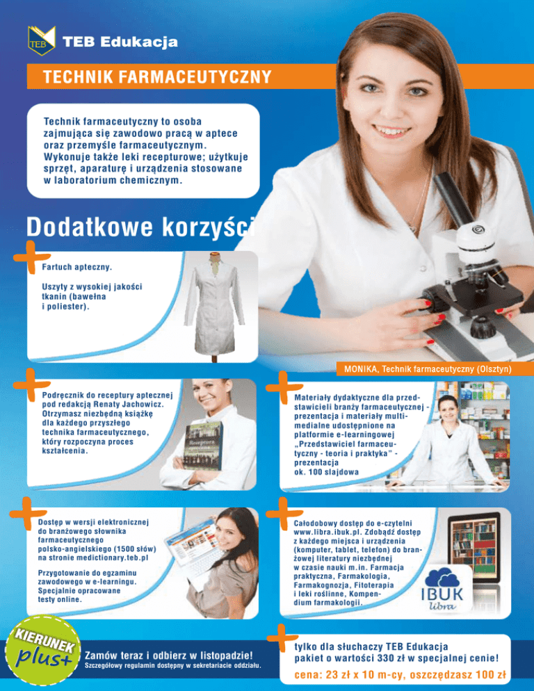 TECHNIK FARMACEUTYCZNY Technik farmaceutyczny to osoba zajmująca się zawodowo pracą w aptece oraz przemyśle farmaceutycznym. Wykonuje także leki recepturowe; użytkuje sprzęt, aparaturę i urządzenia stosowane w laboratorium chemicznym. Dodatkowe korzyści Fartuch apteczny. Uszyty z wysokiej jakości tkanin (bawełna i poliester). MONIKA, Technik farmaceutyczny (Olsztyn) Podręcznik do receptury aptecznej pod redakcją Renaty Jachowicz. Otrzymasz niezbędną książkę dla każdego przyszłego technika farmaceutycznego, który rozpoczyna proces kształcenia. Dostęp w wersji elektronicznej do branżowego słownika farmaceutycznego polsko-angielskiego (1500 słów) na stronie medictionary.teb.pl - Przygotowanie do egzaminu zawodowego w e-learningu. Specjalnie opracowane testy online. KIER UNE plus K Zamów teraz i odbierz w listopadzie! Szczegółowy regulamin dostępny w sekretariacie oddziału. Materiały dydaktyczne dla przedstawicieli branży farmaceutycznej prezentacja i materiały multimedialne udostępnione na platformie e-learningowej „Przedstawiciel farmaceutyczny - teoria i praktyka” prezentacja ok. 100 slajdowa Całodobowy dostęp do e-czytelni www.libra.ibuk.pl. Zdobądź dostęp z każdego miejsca i urządzenia (komputer, tablet, telefon) do branżowej literatury niezbędnej w czasie nauki m.in. Farmacja praktyczna, Farmakologia, Farmakognozja, Fitoterapia i leki roślinne, Kompendium farmakologii. tylko dla słuchaczy TEB Edukacja pakiet o wartości 330 zł w specjalnej cenie! cena: 23 zł x 10 m-cy, oszczędzasz 100 zł