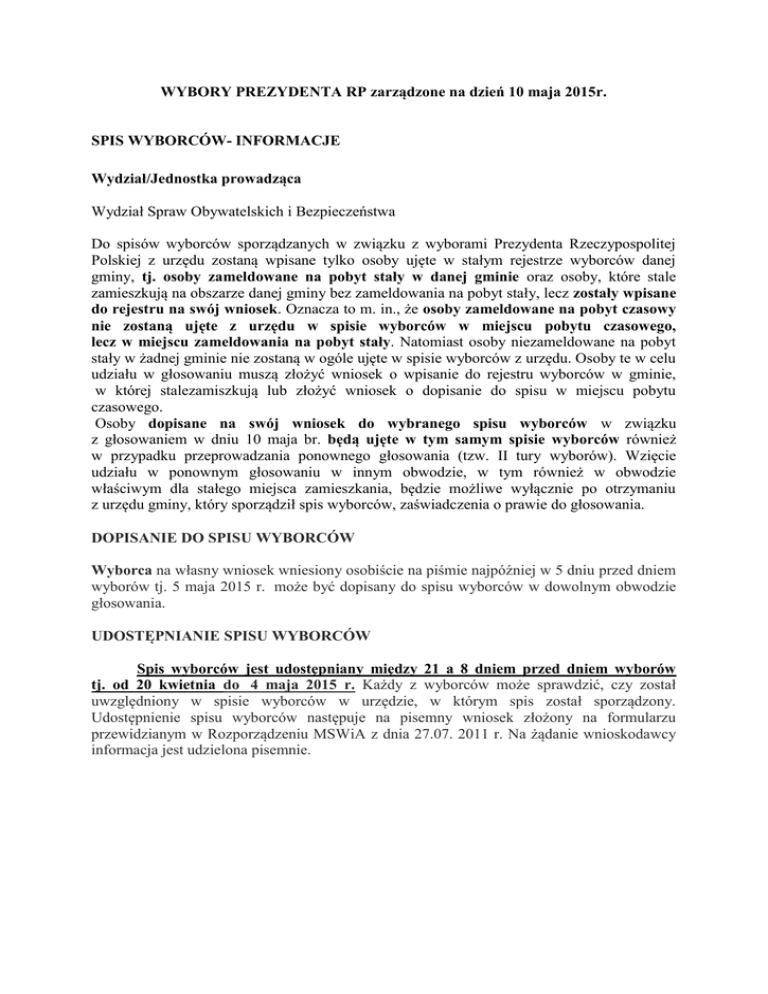 WYBORY PREZYDENTA RP zarządzone na dzień 10 maja 2015r. SPIS WYBORCÓW- INFORMACJE Wydział/Jednostka prowadząca Wydział Spraw Obywatelskich i Bezpieczeństwa Do spisów wyborców sporządzanych w związku z wyborami Prezydenta Rzeczypospolitej Polskiej z urzędu zostaną wpisane tylko osoby ujęte w stałym rejestrze wyborców danej gminy, tj. osoby zameldowane na pobyt stały w danej gminie oraz osoby, które stale zamieszkują na obszarze danej gminy bez zameldowania na pobyt stały, lecz zostały wpisane do rejestru na swój wniosek. Oznacza to m. in., że osoby zameldowane na pobyt czasowy nie zostaną ujęte z urzędu w spisie wyborców w miejscu pobytu czasowego, lecz w miejscu zameldowania na pobyt stały. Natomiast osoby niezameldowane na pobyt stały w żadnej gminie nie zostaną w ogóle ujęte w spisie wyborców z urzędu. Osoby te w celu udziału w głosowaniu muszą złożyć wniosek o wpisanie do rejestru wyborców w gminie, w której stalezamiszkują lub złożyć wniosek o dopisanie do spisu w miejscu pobytu czasowego. Osoby dopisane na swój wniosek do wybranego spisu wyborców w związku z głosowaniem w dniu 10 maja br. będą ujęte w tym samym spisie wyborców również w przypadku przeprowadzania ponownego głosowania (tzw. II tury wyborów). Wzięcie udziału w ponownym głosowaniu w innym obwodzie, w tym również w obwodzie właściwym dla stałego miejsca zamieszkania, będzie możliwe wyłącznie po otrzymaniu z urzędu gminy, który sporządził spis wyborców, zaświadczenia o prawie do głosowania. DOPISANIE DO SPISU WYBORCÓW Wyborca na własny wniosek wniesiony osobiście na piśmie najpóźniej w 5 dniu przed dniem wyborów tj. 5 maja 2015 r. może być dopisany do spisu wyborców w dowolnym obwodzie głosowania. UDOSTĘPNIANIE SPISU WYBORCÓW Spis wyborców jest udostępniany między 21 a 8 dniem przed dniem wyborów tj. od 20 kwietnia do 4 maja 2015 r. Każdy z wyborców może sprawdzić, czy został uwzględniony w spisie wyborców w urzędzie, w którym spis został sporządzony. Udostępnienie spisu wyborców następuje na pisemny wniosek złożony na formularzu przewidzianym w Rozporządzeniu MSWiA z dnia 27.07. 2011 r. Na żądanie wnioskodawcy informacja jest udzielona pisemnie. OBWODY GŁOSOWANIA ZAMKNIĘTE Spis wyborców w szpitalach, w zakładach pomocy społecznej oraz w zakładach karnych i aresztach śledczych, a także w ich oddziałach zewnętrznych oraz domach studenckich i zespołach domów studenckich sporządza się na podstawie wykazów osób na formularzu przewidzianym w Rozporządzeniu MSWiA w sprawie spisu wyborców, które będą w nich przebywać w dniu wyborów. Wykazy osób, o którym mowa wyżej, kierownicy ww. jednostek przekazują do urzędu gminy najpóźniej w 5 dniu przed dniem wyborów tj. do 05.05.2015r. W spisie nie umieszcza się osób pozbawionych praw publicznych prawomocnym orzeczeniem sądu. Kierownik jednostki, w której utworzono obwód głosowania, powiadamia osoby objęte wykazem, że zostaną skreślone ze spisu wyborców w miejscu stałego zamieszkania i będą mogły głosować w wyborach wyłącznie w obwodzie głosowania utworzonym w zakładzie, a w innym obwodzie głosowania po uprzednim uzyskaniu zaświadczenia o prawie do głosowania z tut. urzędu. W razie konieczności dopisania do spisu wyborców - w powyższych jednostkach - osób przybyłych do jednostki, w której utworzono obwód głosowania, po sporządzeniu wykazu kierownik tej jednostki niezwłocznie doręcza właściwemu urzędowi gminy dodatkowy wykaz tych wyborców nie później niż na dwa dni przed dniem wyborów tj. do 08.05.2015 r. Po sporządzeniu spisu, wyborca opuszczający jednostkę winien otrzymać dokument potwierdzający opuszczenie zakładu, który umożliwi mu głosowanie poza zakładem tj. zaświadczenie o opuszczeniu szpitala bądź zwolnienie z odbywania kary w zakładzie karnym/areszcie. ZAŚWIADCZENIE O PRAWIE DO GŁOSOWANIA Wyborca zmieniający miejsce pobytu przed dniem wyborów otrzymuje na swoje żądanie wniesione na piśmie zaświadczenie o prawie do głosowania na podstawie, którego może zagłosować w dowolnym obwodzie głosowania na terenie kraju i za granicą. Zaświadczenie o prawie do głosowania wyborca odbiera osobiście, albo przez upoważnioną na piśmie osobę. W upoważnieniu wskazuje się imię (imiona) i nazwisko oraz nr PESEL wyborcy oraz pełnomocnika. Zaświadczenia o prawie do głosowania wydawane są do 08.05.2015 r. (w godz. pracy urzędu). Miejsce złożenia dokumentów Wydział Spraw Obywatelskich i Bezpieczeństwa parter pok. Nr 2 tel. 74/8560 512 Godziny pracy urzędu: Poniedziałek, środa, czwartek 8.00-16:00, wtorek 8.00-16:30, piątek 8.00-14.30 Opłaty Czynności nie podlegają opłacie skarbowej. Termin i sposób załatwienia Wpisanie do spisu wyborców załatwia się bezpośrednio po złożeniu wniosku. Zaświadczenie o prawie do głosowania otrzymuje się natychmiast po złożeniu wniosku. Udostępnianie spisu wyborców następuje niezwłocznie po złożeniu wniosku. Podstawa prawna Ustawa z dnia 5 stycznia 2011 r. Kodeks wyborczy (Dz. U. z 2011 r. Nr 21 poz. 112 ze zm.), Rozporządzenie Ministra Spraw Wewnętrznych z dnia 29 grudnia 2015 r. w sprawie spisu wyborców (Dz. U. Poz. 5), Postanowienie Marszałka Sejmu Rzeczypospolitej Polskiej z dnia z dnia 4 lutego 2015 r. o zarządzeniu wyborów Prezydenta Rzeczypospolitej Polskiej (Dz. U. Poz. 188).