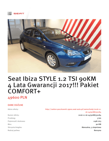 Seat Ibiza STYLE 1.2 TSI 90KM 4 Lata Gwarancji 2017!!! Pakiet COMFORT+ 49600 PLN DANE OGÓLNE Adres oferty: http://switon-paczkowski.zgora.seat-auto.pl/samochody/2016-1116-1479288750184 Numer oferty: Przebieg: Pojemność skokowa: Moc: Skrzynia biegów: Rodzaj paliwa: 2016-11-16-1479288750184 5 km 1198 cm3 90 KM Manualna, 5 stopniowa Benzyna Nadwozie: Hatchback Liczba drzwi: 5 Liczba miejsc: 5 Kolor: Apolo Blue Rok produkcji: 2017 WYPOSAŻENIE / ABS / Alufelgi / Bluetooth / Centralny zamek / Czujniki parkowania tylne / Elektryczne szyby przednie / Elektrycznie ustawiane lusterka / ESP (stabilizacja toru jazdy) / Gniazdo AUX / Gniazdo SD / Gniazdo USB / Isofix / Klimatyzacja manualna / MP3 / Poduszka powietrzna kierowcy / Poduszka powietrzna pasażera / Światła do jazdy dziennej / Światła LED / Wielofunkcyjna kierownica / Wspomaganie kierownicy OPIS Autoryzowany Dealer SEAT oferuje MODEL: IBIZA WERSJA: STYLE SILNIK: 1.2 TSI 90 KM ROK PRODUKCJI: 2017 Podana cena dotyczy zakupu na Firmę lub Grupę Zawodową - leasing lub płatność gotówką. Pakiet COMFORT+ dla wersji Style- Czujniki parkowania z tyłu- 15-calowe felgi aluminiowe IBIA- Pakiet LED: Podwójne reflektory ze światłami do jazdy dziennej LED i tylne światła LED WYPOSAŻENIE STANDARDOWE Ibiza 5D 1.2 TSI 90KM - STYLE: Wnętrze - Oświetlenie wnętrza z lampkami do czytania + oświetlenie bagażnika - 2 uchwyty na napoje z przodu- Uchwyt na napoje z tyłu- Gniazdo 12 V z przodu- Kieszenie w oparciach przednich foteliSchowki w panelach drzwi przednich- Osłony przeciwsłoneczne dla kierowcy i pasażera z zamykanymi lusterkami- Zamykany i podświetlany schowek o pojemności 10.7 l w desce rozdzielczej- Kolumna kierownicy z regulacją w pionie i poziomie- Wielofunkcyjna kierownica, gałka dźwigni zmiany biegów i dźwignia hamulca ręcznego obszyte skórą- Panel drzwi przednich z tkaniny- Chromowane elementy dekoracyjne deski rozdzielczej- Zagłówki z regulacją wysokości w przednich i tylnych (zewnętrznych) fotelach- Centralny zagłówek z tyłu- Składana i dzielona tylna kanapa- Fotel kierowcy z regulacją wysokości- Fotele Comfort - czarna, czarne elementy dekoracyjne. Elektronika- Reflektory przeciwmgielne z przodu z funkcją doświetlania zakrętówŚwiatła do jazdy dziennej- Pojedyncze reflektory jednoogniskowe- Media System Colour: 5-calowy kolorowy ekran dotykowy,Radio,Złącza USB, SD, Aux-in, 6 głośników, Bluetooth, Wielofunkcyjna kierownica ze sterowaniem radiem i telefonem, Komputer pokładowy- Komputer pokładowy- Klimatyzacja manualna Climatic. Nadwozie- Zawieszenie COMFORT- Koło zapasowe- Tylny spoiler z dodatkowym światłem- STOP;- Błyszczące, czarne słupki B i C- Zderzaki w kolorze nadwozia- Klamki i lusterka lakierowane w kolorze nadwozia Bezpieczeństwo- Centralny zamek z pilotem- Elektrycznie regulowane i podgrzewane lusterka boczneElektrycznie sterowane szyby z przodu- 4 lata Ochrony Gwarancji SEAT- Boczne poduszki powietrzne dla kierowcy i pasażera- Przednie poduszki powietrzne dla kierowcy i pasażera- System przypominający o konieczności zapięcia pasów na 2 fotelach- Trzypunktowe pasy bezpieczeństwa przy tylnych siedzeniach- Aktywacja układu ostrzegania o gwałtownym hamowaniu (światła awaryjne + migające światła „STOP”)Zaczepy iSOFIX i Top Tether przy siedzeniach tylnej kanapy (1+1)- Automatyczny hamulec pokolizyjny ograniczający skutki kolejnych kolizji (Multi Collision Brake)- System kontroli ciśnienia w ogumieniu ze wskaźnikiem ostrzegawczym- ABS, ESC, ASR i EBA- Asystent Podjazdu Kolor samochodu: Apolo Blue 4 LATA GWARANCJI SEAT to przyjemne uczucie, wiedzieć że Twój samochód jest zabezpieczony przed kosztami niespodziewanych napraw. Nowe samochody SEAT objęte są gwarancją przez 4 lata lub do 120 000 kilometrów przebiegu (w tym pierwsze dwa lata bez limitu przebiegu). Gwarancja nie ma ograniczeń terytorialnych.ZAPRASZAMY DO SALONU NA JAZDĘ PRÓBNĄ! W ofercie posiadamy bardzo atrakcyjne formy finansowania:- dla klientów indywidualnych Moc Trzech ZER - dla firm Leasing 101,99% oraz Leasing z wysoką wartością końcową. Szczegóły u doradców handlowych – Zapraszamy!W ROZUMIENIU ART. 71 KODEKSU CYWILNEGO POWYŻSZA OFERTA NIE STANOWI OFERTY HANDLOWEJ/ Kontakt z doradcą: Adam Stolarski; 660 618 041/ [email protected]