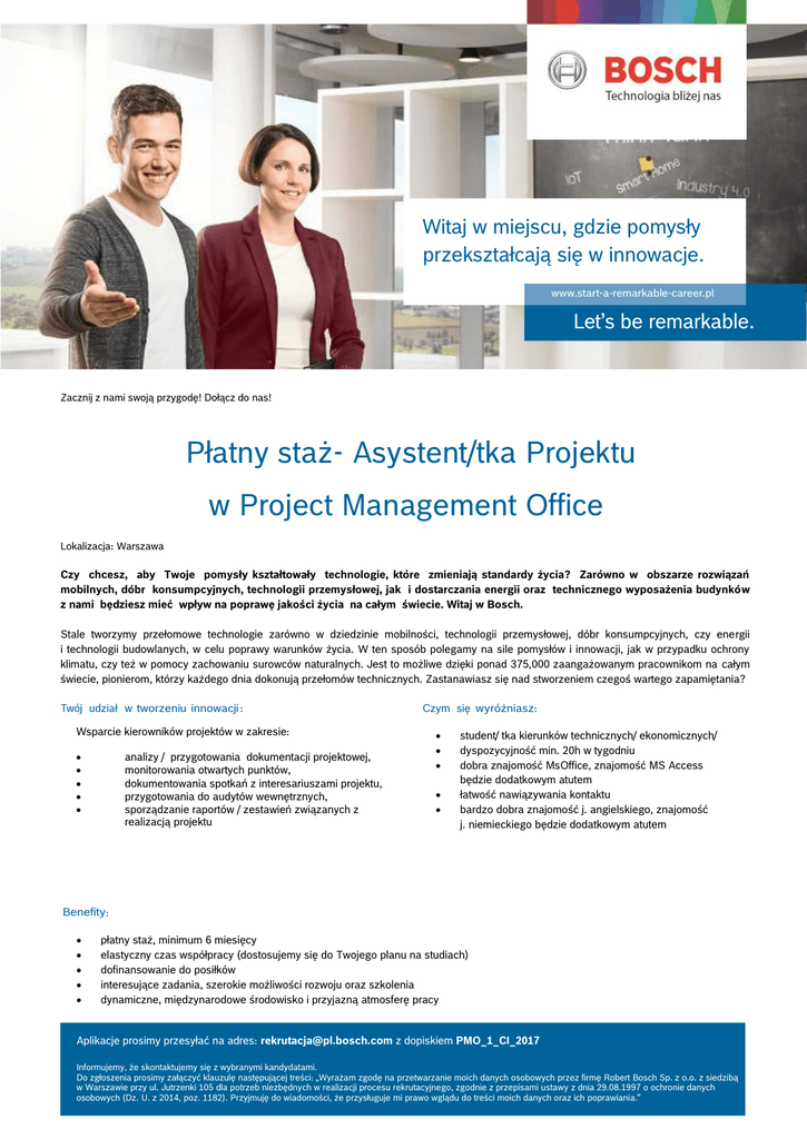 Witaj w miejscu, gdzie pomysły przekształcają się w innowacje. www.start-a-remarkable-career.pl Let’s be remarkable. Zacznij z nami swoją przygodę! Dołącz do nas! Płatny staż- Asystent/tka Projektu w Project Management Office Lokalizacja: Warszawa Czy chcesz, aby Twoje pomysły kształtowały technologie, które zmieniają standardy życia? Zarówno w obszarze rozwiązań mobilnych, dóbr konsumpcyjnych, technologii przemysłowej, jak i dostarczania energii oraz technicznego wyposażenia budynków z nami będziesz mieć wpływ na poprawę jakości życia na całym świecie. Witaj w Bosch. Stale tworzymy przełomowe technologie zarówno w dziedzinie mobilności, technologii przemysłowej, dóbr konsumpcyjnych, czy energii i technologii budowlanych, w celu poprawy warunków życia. W ten sposób polegamy na sile pomysłów i innowacji, jak w przypadku ochrony klimatu, czy też w pomocy zachowaniu surowców naturalnych. Jest to możliwe dzięki ponad 375,000 zaangażowanym pracownikom na całym świecie, pionierom, którzy każdego dnia dokonują przełomów technicznych. Zastanawiasz się nad stworzeniem czegoś wartego zapamiętania? Twój udział w tworzeniu innowacji : Wsparcie kierowników projektów w zakresie: analizy / przygotowania dokumentacji projektowej, monitorowania otwartych punktów, dokumentowania spotkań z interesariuszami projektu, przygotowania do audytów wewnętrznych, sporządzanie raportów / zestawień związanych z realizacją projektu Czym się wyróżniasz: student/ tka kierunków technicznych/ ekonomicznych/ dyspozycyjność min. 20h w tygodniu dobra znajomość MsOffice, znajomość MS Access będzie dodatkowym atutem łatwość nawiązywania kontaktu bardzo dobra znajomość j. angielskiego, znajomość j. niemieckiego będzie dodatkowym atutem Benefity: płatny staż, minimum 6 miesięcy elastyczny czas współpracy (dostosujemy się do Twojego planu na studiach) dofinansowanie do posiłków interesujące zadania, szerokie możliwości rozwoju oraz szkolenia dynamiczne, międzynarodowe środowisko i przyjazną atmosferę pracy Be Aplikacje prosimy przesyłać na adres: [email protected] z dopiskiem PMO_1_CI_2017 Informujemy, że skontaktujemy się z wybranymi kandydatami. Do zgłoszenia prosimy załączyć klauzulę następującej treści: „Wyrażam zgodę na przetwarzanie moich danych osobowych przez firmę Robert Bosch Sp. z o.o. z siedzibą w Warszawie przy ul. Jutrzenki 105 dla potrzeb niezbędnych w realizacji procesu rekrutacyjnego, zgodnie z przepisami ustawy z dnia 29.08.1997 o ochronie danych osobowych (Dz. U. z 2014, poz. 1182). Przyjmuję do wiadomości, że przysługuje mi prawo wglądu do treści moich danych oraz ich poprawiania.”