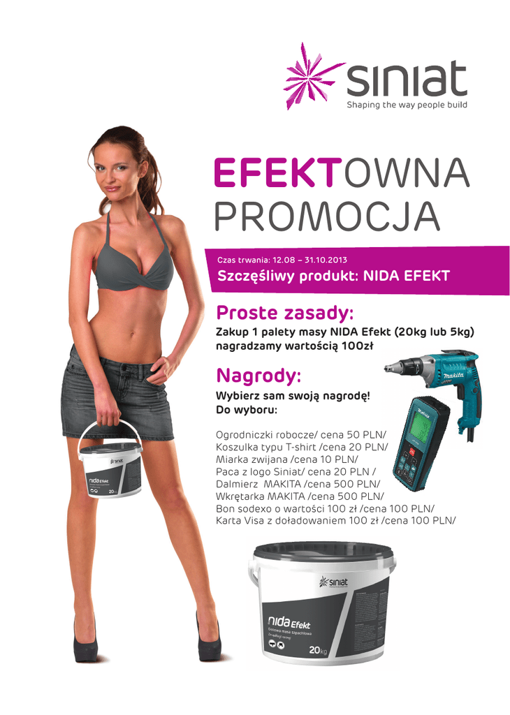 EFEKTOWNA PROMOCJA Czas trwania: 12.08 – 31.10.2013 Szczęśliwy produkt: NIDA EFEKT Proste zasady: Zakup 1 palety masy NIDA Efekt (20kg lub 5kg) nagradzamy wartością 100zł Nagrody: Wybierz sam swoją nagrodę! Do wyboru: Ogrodniczki robocze/ cena 50 PLN/ Koszulka typu T-shirt /cena 20 PLN/ Miarka zwijana /cena 10 PLN/ Paca z logo Siniat/ cena 20 PLN / Dalmierz MAKITA /cena 500 PLN/ Wkrętarka MAKITA /cena 500 PLN/ Bon sodexo o wartości 100 zł /cena 100 PLN/ Karta Visa z doładowaniem 100 zł /cena 100 PLN/ Podsumowanie Twojej puli nagrodowej Liczba zamówionych palet x 100 zł = Zamawiam nagrody*: Lp. Nagroda Cena Ilość Wartość 1. 2. 3. 4. 5. * Prosimy o sprawdzenie zamówienia. Organizator nie ponosi odpowiedzialności za opóźnienie w realizacji wynikłe ze złego złożenia zamówienia. łącznie: Dane zamawiającego: imię i nazwisko: telefon kontaktowy: mail: NIP: firma: adres: kod i miasto: adres do wysyłki nagród wypełnić tylko w przypadku, kiedy jest różny od adresu firmy/: podpis: Zamówienie odeślij do nas faksem: 61 8250 781 lub mailem na adres:info@nidaprofit.pl Nagrody zostaną przesłane w ciągu 3 tygodni od momentu wpłynięcia zamówienia do Organizatora. Regulamin Promocji jest dostępny u Organizatora oraz w siedzibie Sponsora Promocji. Sponsor Promocji: Organizator Promocji: SINIAT Sp. z o.o. ul. Iłżecka 24 F 02-135 Warszawa Verbum SA ul. Szelągowska 45A 61-626 Poznań