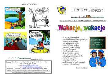 WAKACJE Z HUMOREM ORGAN PRASOWY ZS IM. H. SZCZERKOWSKIEGO Redakcja: ZS im. H. Szczerkowskiego ul. Kilińskiego 21 05-825 Grodzisk Maz. Tel.: 755 60 60 fax: 755 58 91 e-mail: [email protected] www.zssgrodziskmaz.edupage.org Opiekunowie: J. Cackowska, U. Dąbrowska-Cychol, J. Giera-Ostalska, M. Szwed Redakcja zastrzega sobie prawo adiustacji zamieszczanych tekstów i nie odpowiada za treść reklam i ogłoszeń. Źródło: Internet (wybrane treści i grafiki). Po to wymyślono wakacje, aby za świadectwa zbierać gratulacje, aby się w jeziorze kąpać, bosą nogą po rosie stąpać, zbierać muszelki, kamyki, podziwiać górskie strumyki, by na pachnącej łące oglądać, kwiatów tysiace, słuchac kukania kukułki, podglądać pracowite pszczółki, objadać się jagodami, poziomkami i lodami, zamki z piasku na plaży budować, a czasem... poleniuchować. Danuta Ludwiczak MAJ-CZERWIEC 2016 10 rad na udane wakacje SŁOŃCE Wakacje każdemu z nas niezależnie od wieku kojarzą się z pięknym bezchmurnym niebem i promiennym słońcem. Lubimy zażywać kąpieli słonecznych, warto więc pamiętać aby z nimi nie przesadzić. Opalając się pamiętajmy o kremach z filtrem, odpowiednim dla naszego rodzaju skóry. Wybierając się na spacer w słoneczne popołudnie zadbajmy o nakrycie głowy oraz butelkę wody mineralnej. NAD WODĄ W upalne letnie dni najchętniej odpoczywamy nad wodą, pamiętajmy jednak o zasadach bezpieczeństwa, jakie należy zachować zarówno przed samą kąpielą, jak i w jej trakcie. Do wody należy wchodzić stopniowo, aby nasze ciało przyzwyczaiło się do zmiany temperatury, kąpmy się w miejscach do tego wyznaczonych, zwracajmy uwagę na nasze możliwości (umiejętność sprawnego poruszania się w wodzie). BURZA Niestety latem zdarzają się burze i nawet nie wiemy kiedy i gdzie może nas złapać. W takim przypadku nie chowajmy się pod drzewami, starajmy się dotrzeć do jakiegoś budynku bądź też do auta. Zadbajmy o to, aby nasze telefony były wyłączone, gdyż mogą one ściągnąć pioruny. INSEKTY Niezależnie od miejsca w którym się znajdujemy lato to pora komarów, kleszczy czy innych insektów. Rada jest prosta zaopatrzmy się w różnego rodzaju kremy bądź spreje na insekty. Spędzając czas na powietrzu sprawdzajmy, czy w szklance nie pływa nam osa, ostrożnie jedzmy słodkie przysmaki, a na pewno nic nam nie zagrozi. ODBLASKI Wybierając się wieczorem na wycieczkę rowerową zadbajmy o odpowiednie oświetlenie, upewnijmy się, że nasz sprzęt jest sprawny a także zaopatrzmy się w elementy odblaskowe. Kamizelka czy opaski są bardziej widoczne dla kierowców. Jest to również dobra opcja dla lubiących wieczorne spacery. ZŁODZIEJE Pamiętajmy, aby wartościowe rzeczy zostawiać w domu lub w hotelu. Starajmy się nie zwracać na siebie uwagi i nie nośmy ze sobą zbyt dużych sum pieniężnych. Portfel czy aparat trzymajmy zawieszony na szyi. IMPREZY PLENEROWE Wybierając się na koncert ulubionej kapeli zabierzmy ze sobą grono znajomych. W tłumie można się zagubić, dlatego starajmy się trzymać razem i nie odłączać się od reszty. UŻYWKI Wakacje to czas imprezowania, poznawania nowych ludzi. Nie bądźmy zbyt ufni wobec nowo poznanych ludzi. Nie zostawiajmy szklanki czy butelki z napojem, nigdy nie wiemy, czy czegoś nam nie dosypano. Alkoholu i innych używek nie polecamy. Trzeźwość umysłu jest najważniejsza. Trzeźwy umysł to mniejsze ryzyko popełnienia jakiegoś głupstwa. SEKTA Jeśli ktoś zaczepi nas na ulicy i zaproponuje spotkanie, ale nie będzie chciał nam przybliżyć tematu owego spotkania, nie bądźmy łatwowierni i nie dajmy się wciągnąć w te propozycje. Możemy stać się przypadkowymi członkami sekty. NA SZLAKU Świeże powietrze, piękne krajobrazy i dużo maszerowania - góry to miejsce pozwalające na oderwanie się od rzeczywistości. Dobry pomysł na aktywne spędzenie wolnego czasu. Pamiętajmy, aby zadbać o nasze bezpieczeństwo. Wybierając się na szlak zadbajmy o dobre obuwie, które pozwoli nam sprawnie zdobywać górskie szczyty. Należy trzymać się wyznaczonych szlaków. Wiemy również, że w górach pogoda zmienia się szybko, wiec warto mieć przy sobie ciepły sweter, płaszcz przeciwdeszczowy. Musimy pamiętać, aby w naszym wyposażeniu znalazła się apteczka i naładowany telefon komórkowy. Zawsze zostawiamy informację o wyjściu w góry w miejscu zakwaterowania. Źródło: http://www.tip-top.superlifestyle.pl/wakacje.php